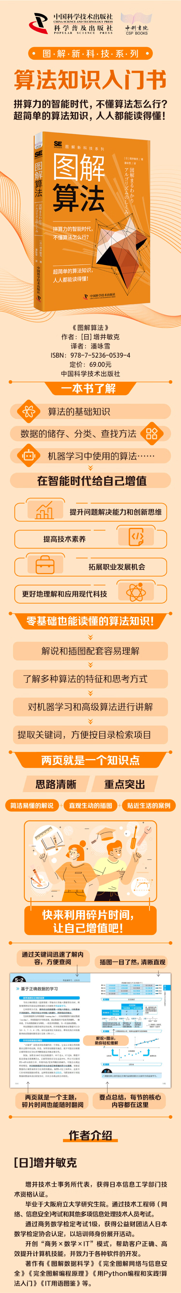 1.图解新科技系列之图解算法。本书是一本算法入门书,浅显易懂,介绍了算法的基础知识,数据的储存、分类、查找方法,以及机器学习中使用的算法等,从基础知识到应用都附有图片解析。