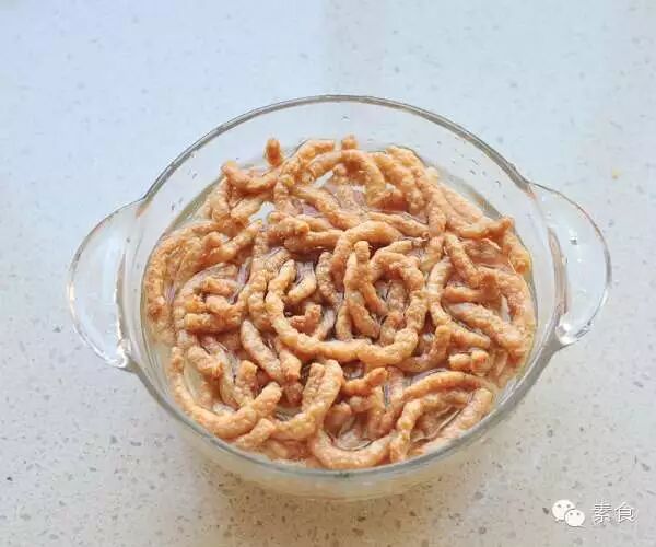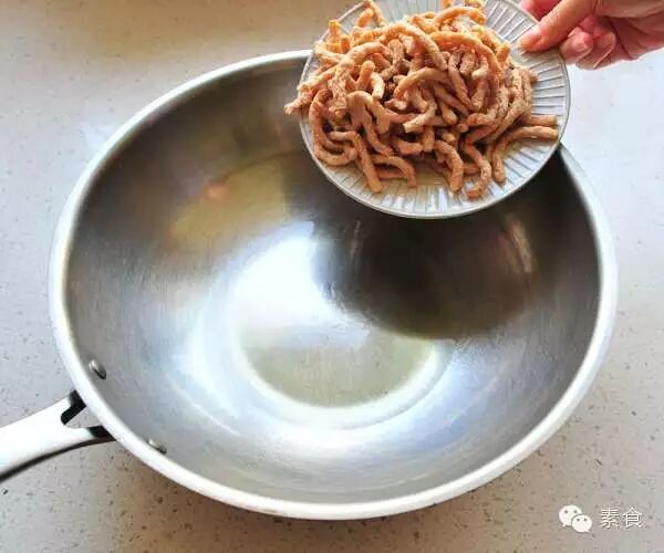 3、锅中热油,倒入素肉丝煸炸略黄盛出。