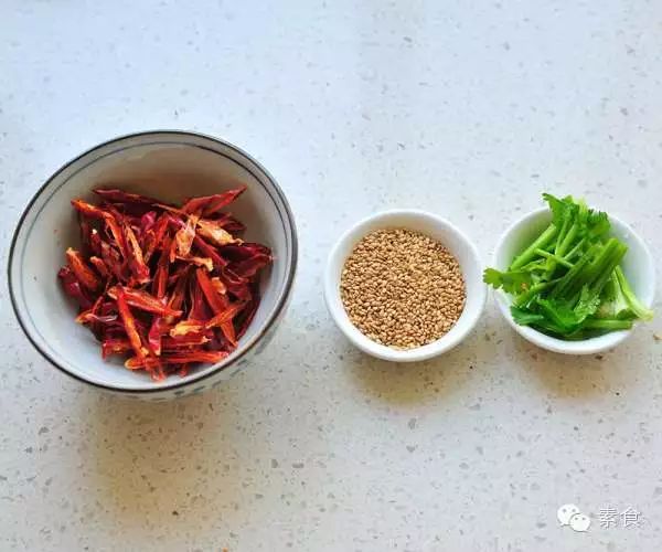 2、干辣椒剪丝,香菜梗切小段,白芝麻备用。