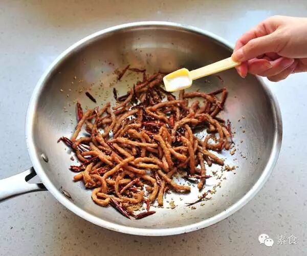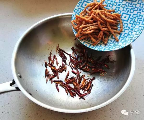 4、锅中热油爆香干辣椒丝,再倒入素肉丝煸炒。