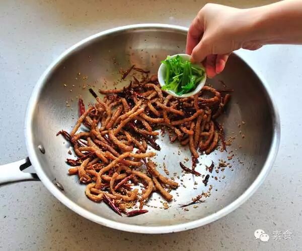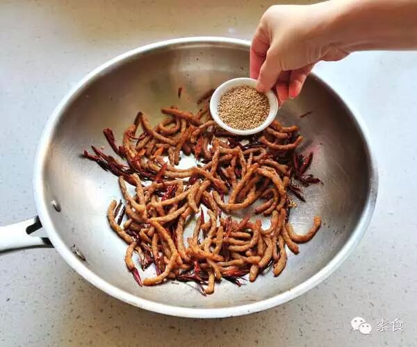 食材:素肉丝40克、干辣椒10克、香菜梗10克、淀粉少许、白芝麻少许、酱油1勺、盐适量