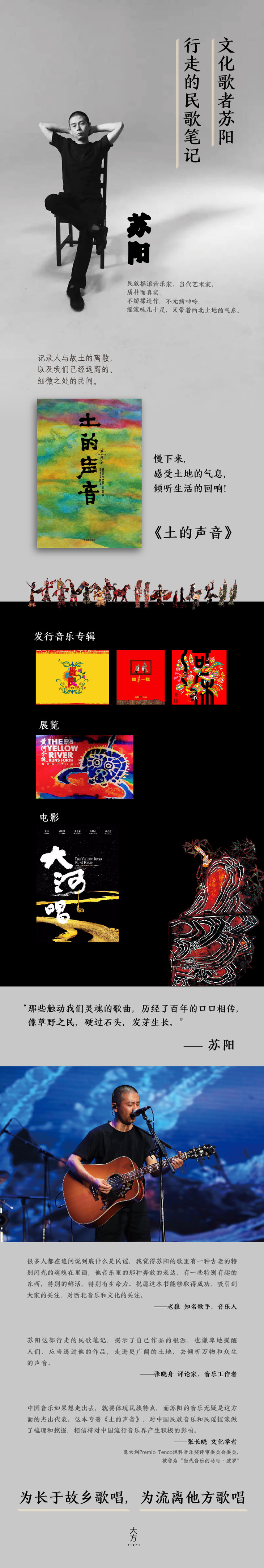 中国音乐如果想走出去,就要体现民族特点,而苏阳的音乐无疑是这方面的杰出代表。这本专著《土的声音》,对中国民族音乐和民谣摇滚做了梳理和挖掘,相信将对中国流行音乐界产生积极的影响。