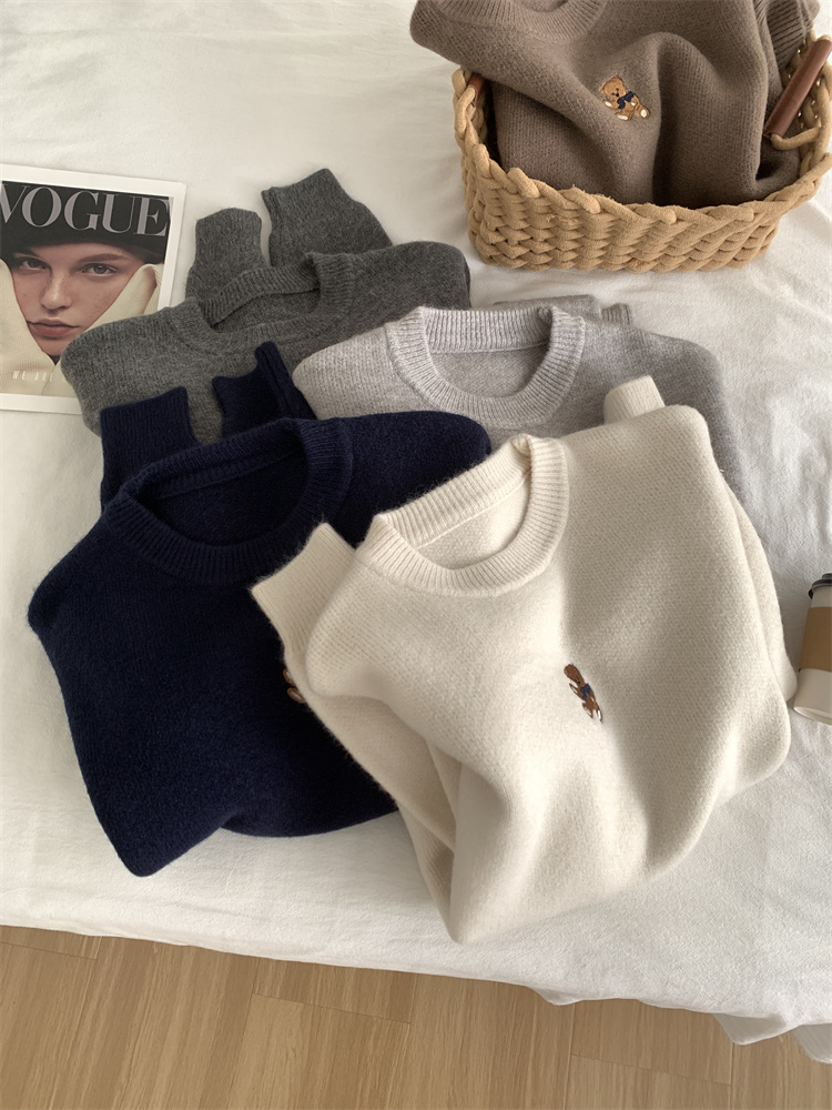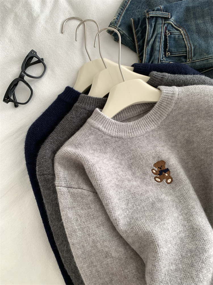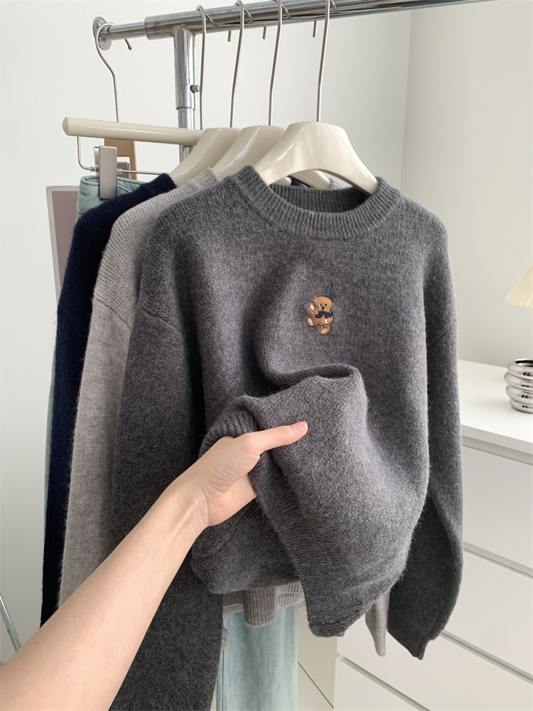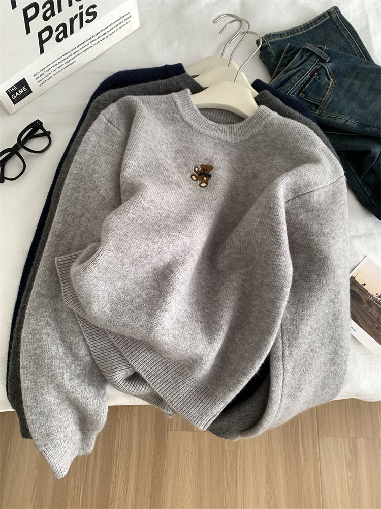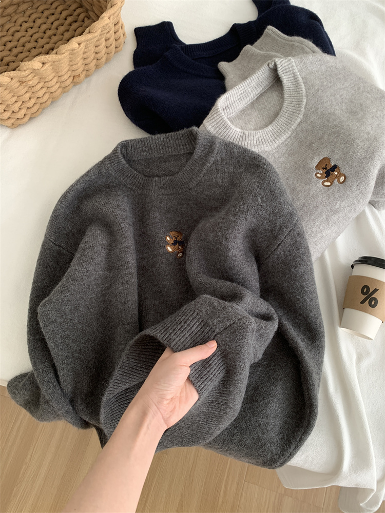 厚实软糯!小熊刺绣套头毛衣女宽松韩版灰色长袖针织衫秋冬保暖毛衣!