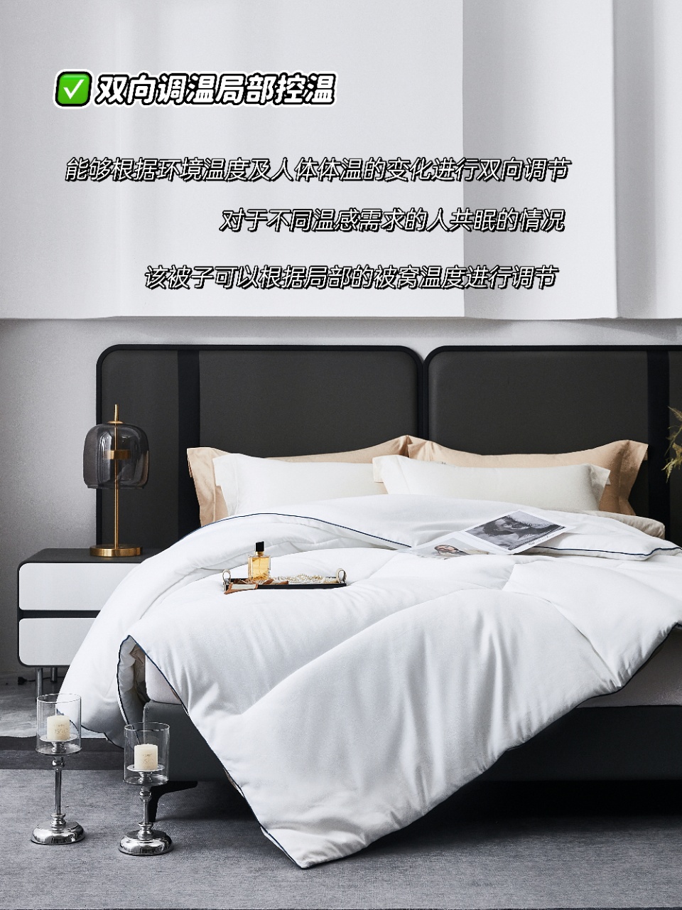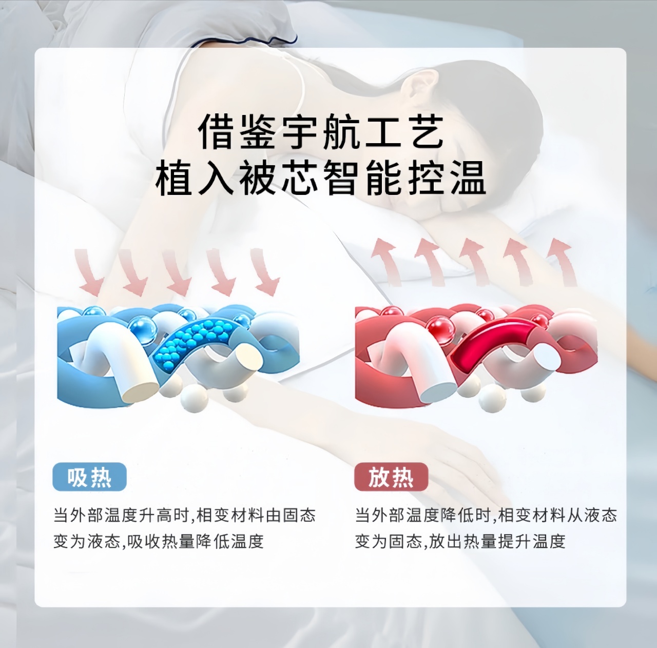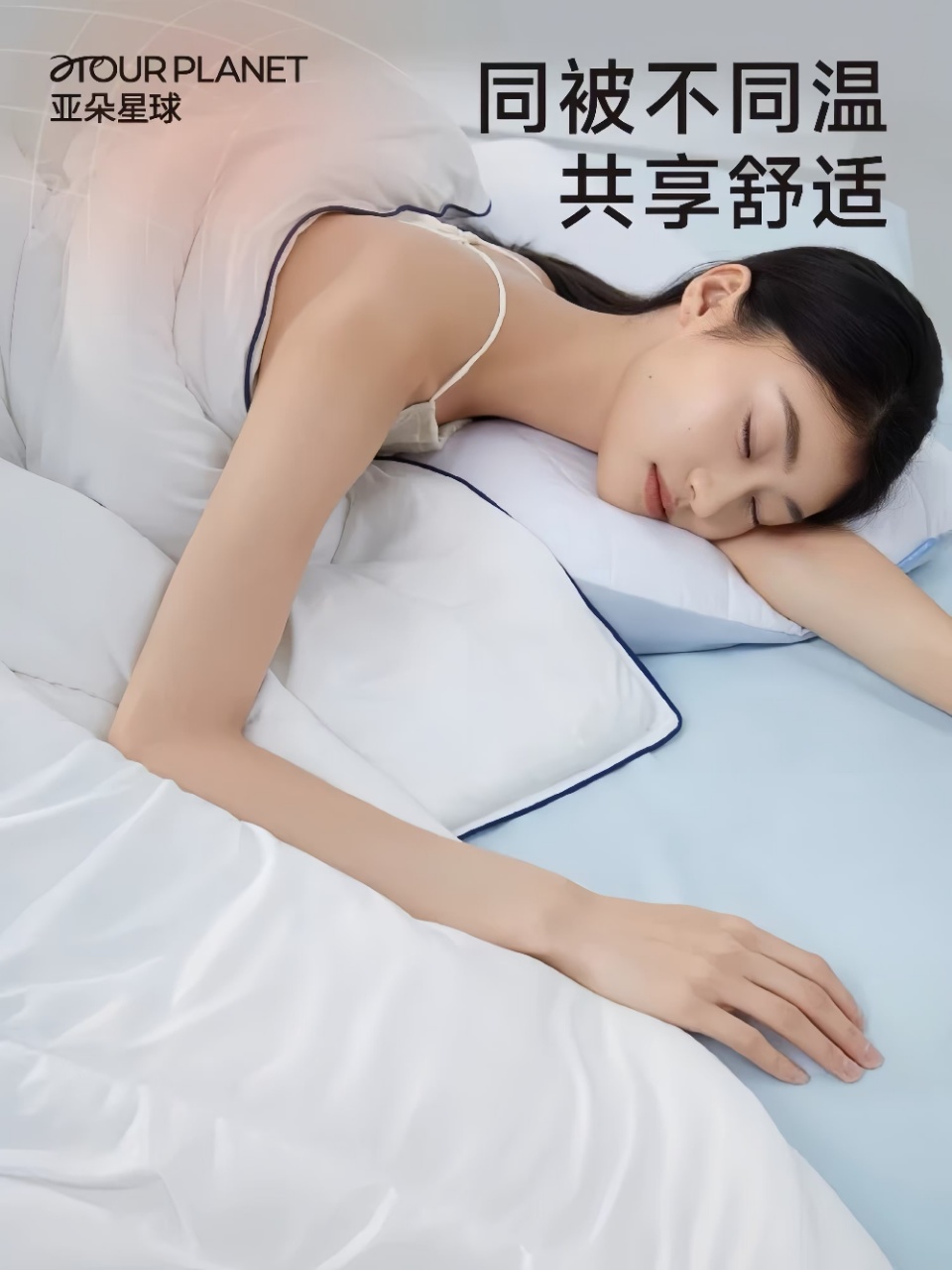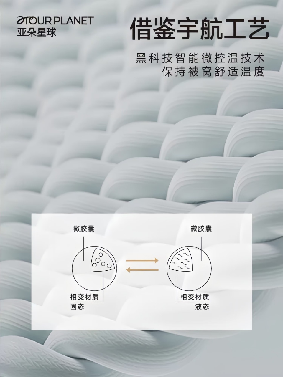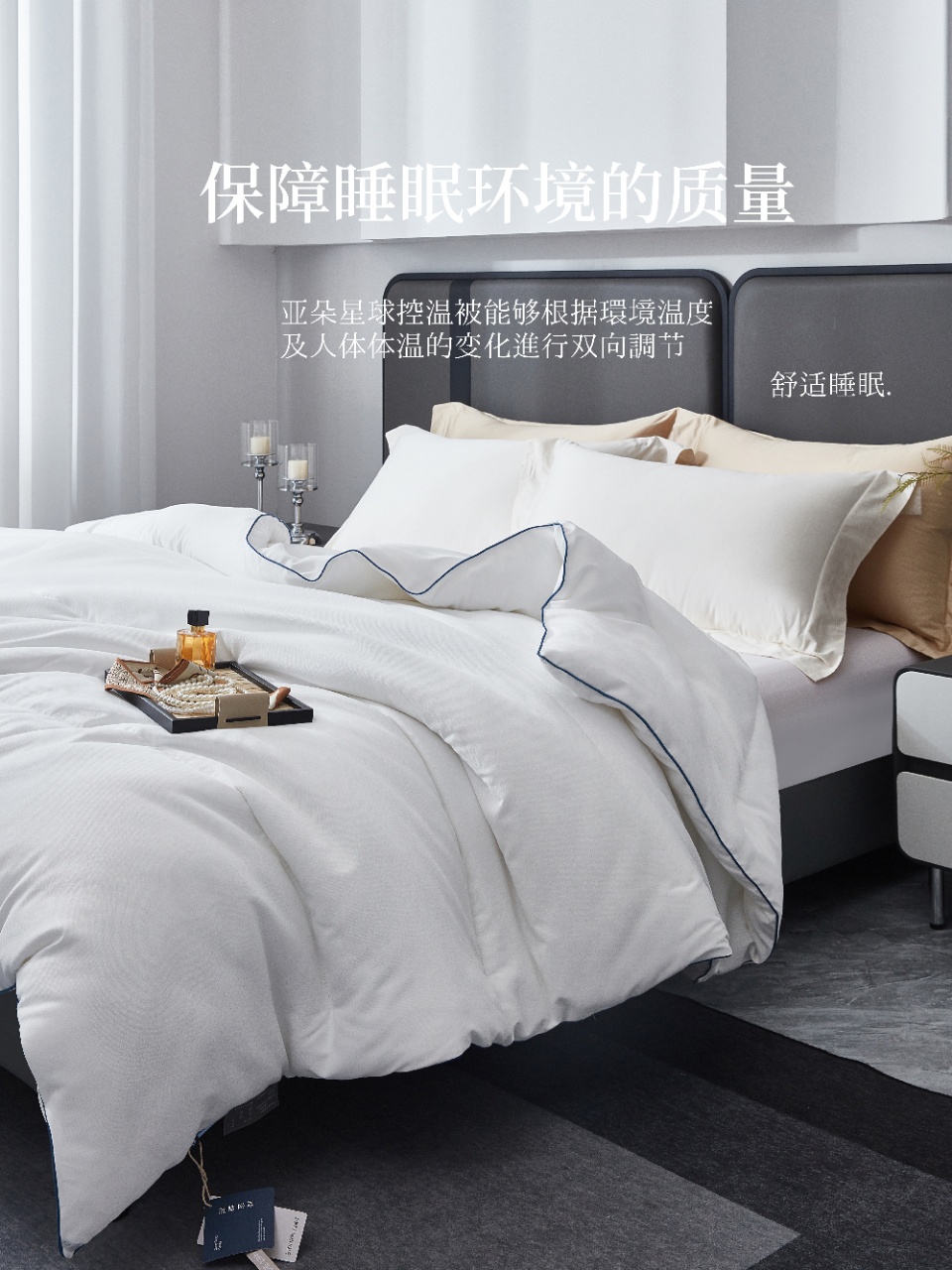 • 双向调温:亚朵星球控温被采用了特殊的纤维材料和相变材料等技术,能够根据环境温度及人体体温的变化进行双向调节。当环境温度升高时,被子可以吸收热量,降低被窝内的温度,使人不会感到闷热;当环境温度降低时,它会释放热量,提高被窝内的温度,避免人在睡眠中感到寒冷,从而保持被窝内温度相对稳定,为用户提供舒适的睡眠环境。