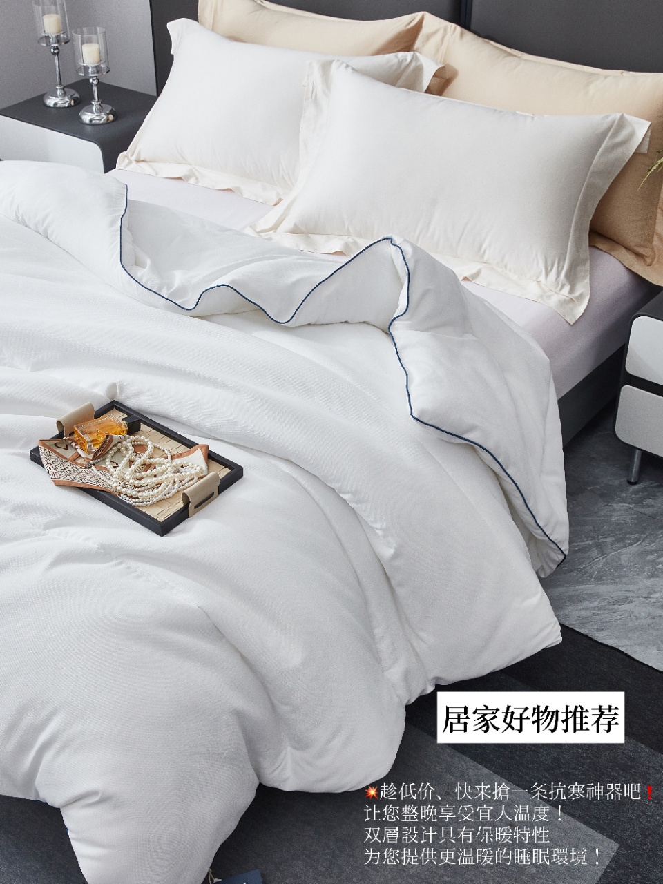 • 可机洗烘干:整被支持机洗和烘干,方便清洁和保养,解决了传统被子清洗后不易干、易变形等问题,节省了用户的时间和精力。