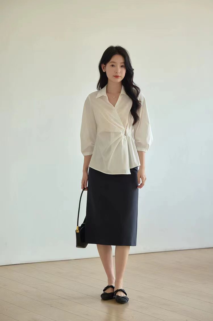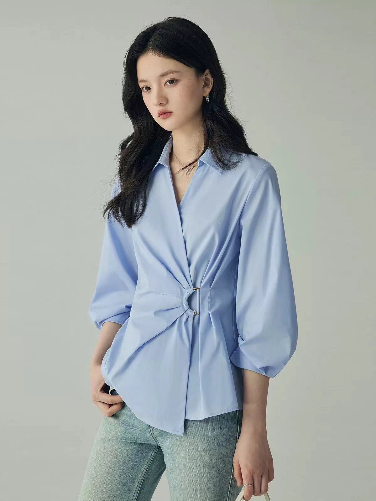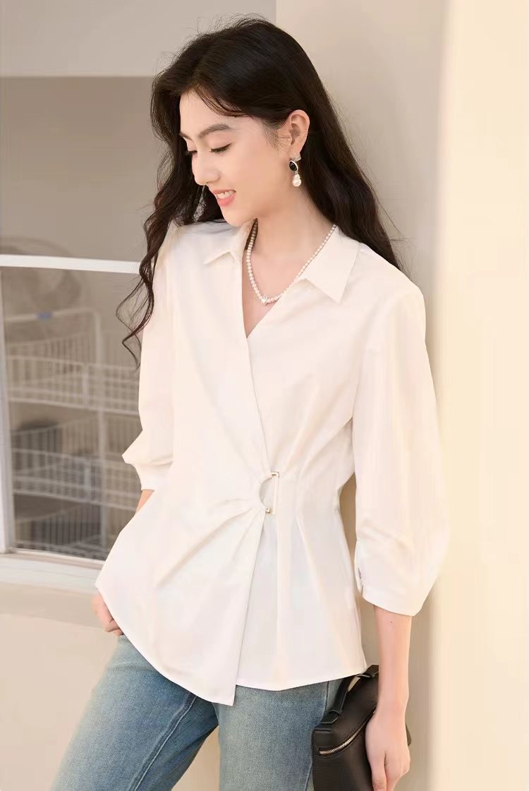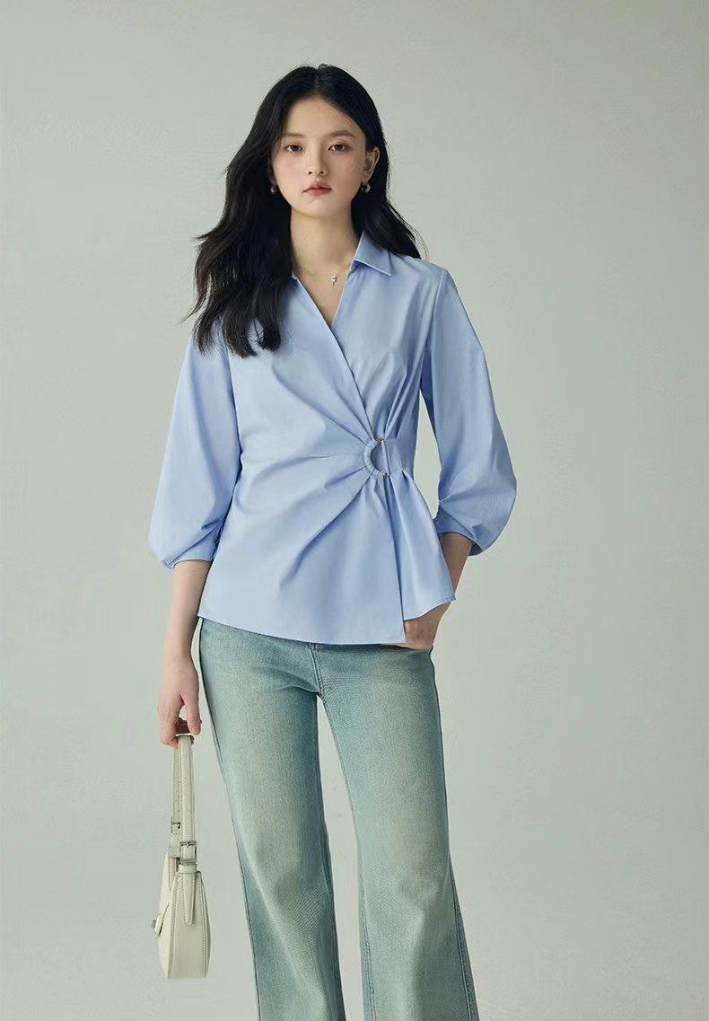 2026法式抗皱设计感收腰显瘦v字翻领不规则衬衫,法式收腰优雅衬衫!金属扣+收腰是整件衣服的灵魂亮点,将宽松衣身自然收拢,藏肉显瘦,穿出窈窕身材!同时让腰部更具层次感,避免了基础衬衫的单调,下摆呈现不规则设计,走动时摇曳生姿,弱化了下半身的臃肿感。精典翻领搭配V型交叠门襟,恰到好处地露出纤细锁骨,既保留了衬衫的正式感,又多了几分随性柔和。v领线条利落挺括,能修饰颈部线条,视觉上拉长脖颈比例,显得清爽又精神。中袖灯笼袖剪裁,袖管微微膨起,在腕部自然收拢,既能巧妙修饰手臂线条,藏住拜拜肉,行走间随风轻晃,灵动又不失优雅。袖口做了合扣处理,可解开穿,抬手办公也毫无束缚感。面料选用细腻的粘棉混纺材质,垂坠感佳,既挺括有型又柔软亲肤,春夏穿着也舒适自在,摸起来软糯有质感,上身尽显羔级通勤气质。