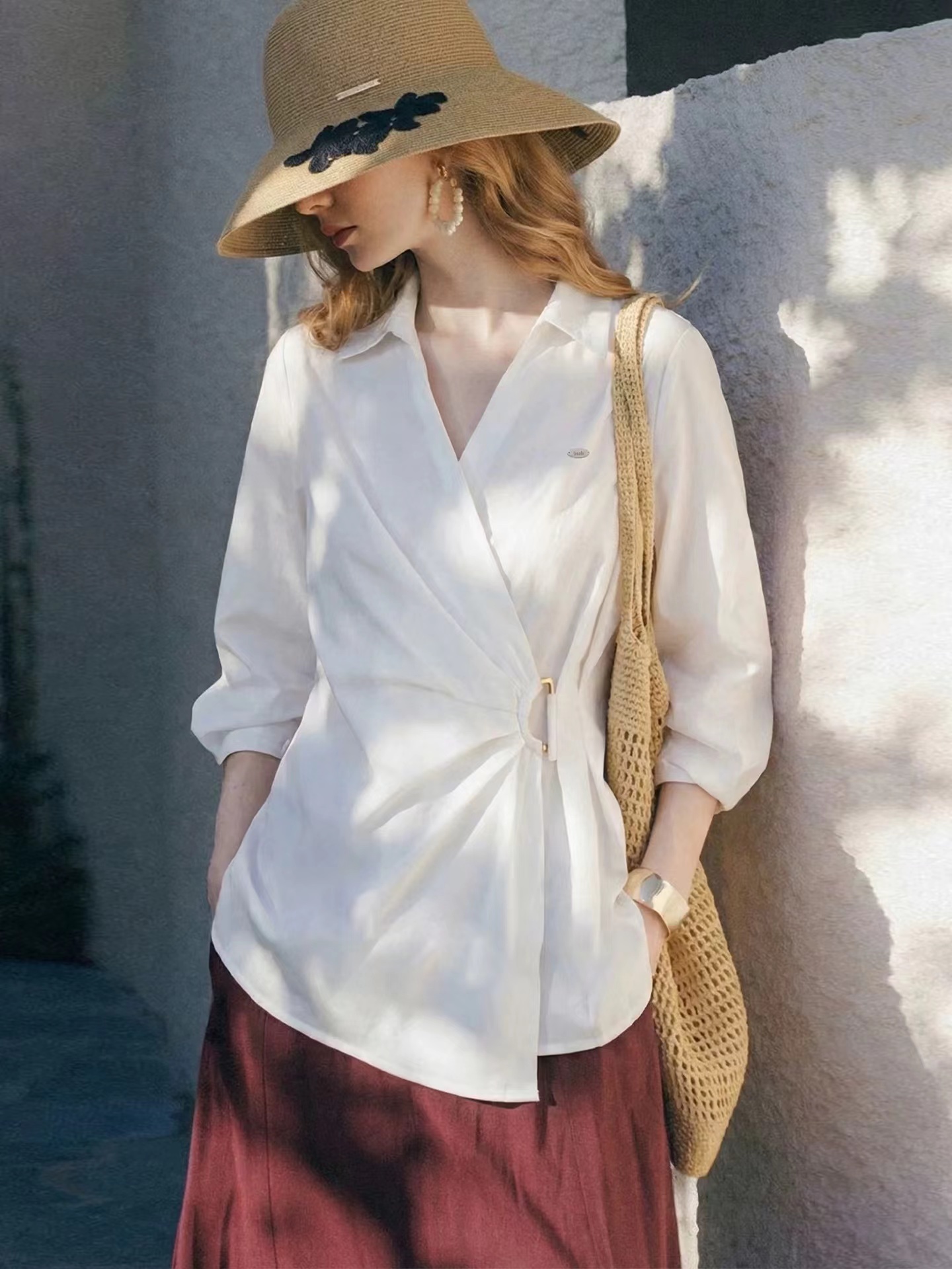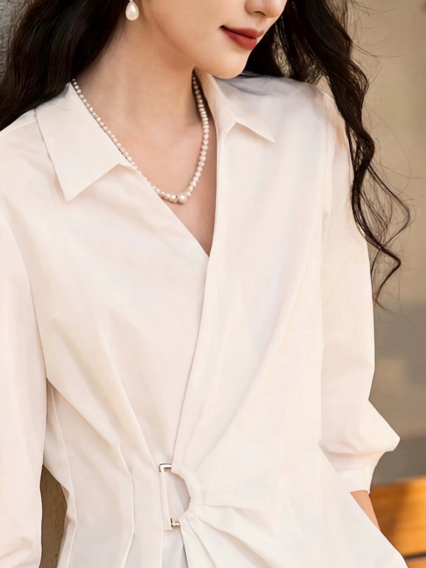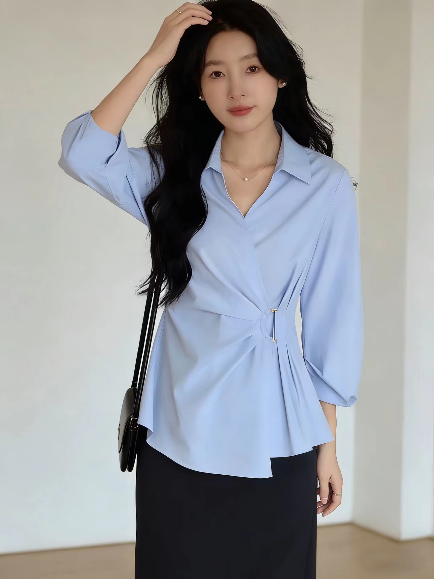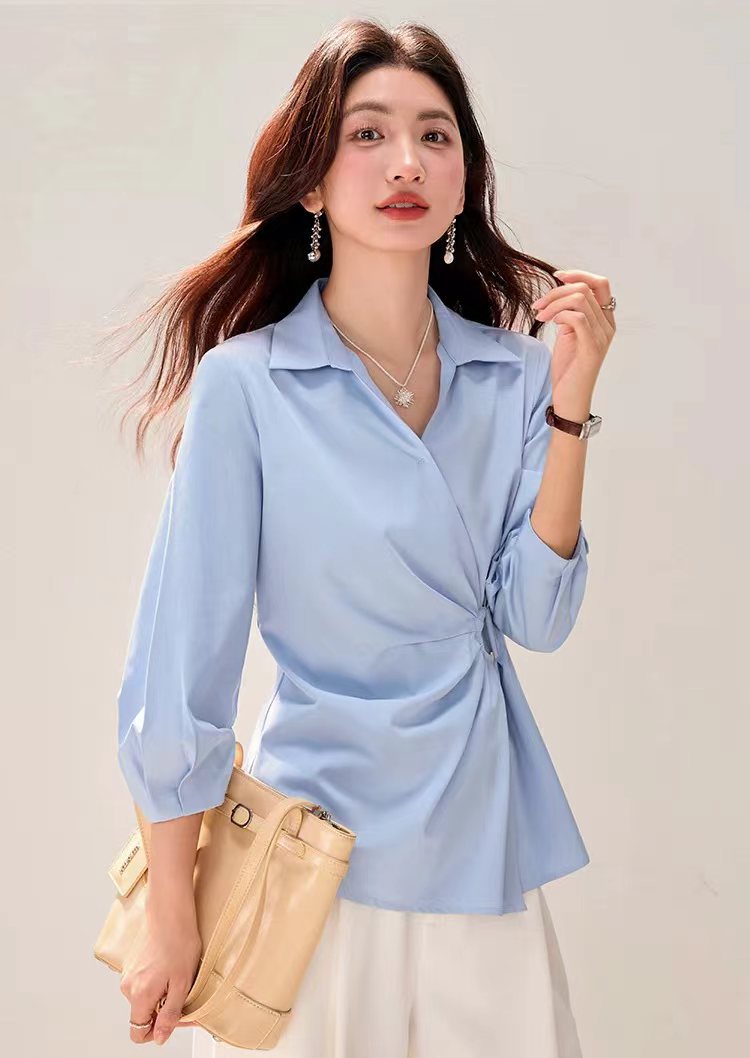 2026法式抗皱设计感收腰显瘦v字翻领不规则衬衫,法式收腰优雅衬衫!金属扣+收腰是整件衣服的灵魂亮点,将宽松衣身自然收拢,藏肉显瘦,穿出窈窕身材!同时让腰部更具层次感,避免了基础衬衫的单调,下摆呈现不规则设计,走动时摇曳生姿,弱化了下半身的臃肿感。精典翻领搭配V型交叠门襟,恰到好处地露出纤细锁骨,既保留了衬衫的正式感,又多了几分随性柔和。v领线条利落挺括,能修饰颈部线条,视觉上拉长脖颈比例,显得清爽又精神。中袖灯笼袖剪裁,袖管微微膨起,在腕部自然收拢,既能巧妙修饰手臂线条,藏住拜拜肉,行走间随风轻晃,灵动又不失优雅。袖口做了合扣处理,可解开穿,抬手办公也毫无束缚感。面料选用细腻的粘棉混纺材质,垂坠感佳,既挺括有型又柔软亲肤,春夏穿着也舒适自在,摸起来软糯有质感,上身尽显羔级通勤气质。