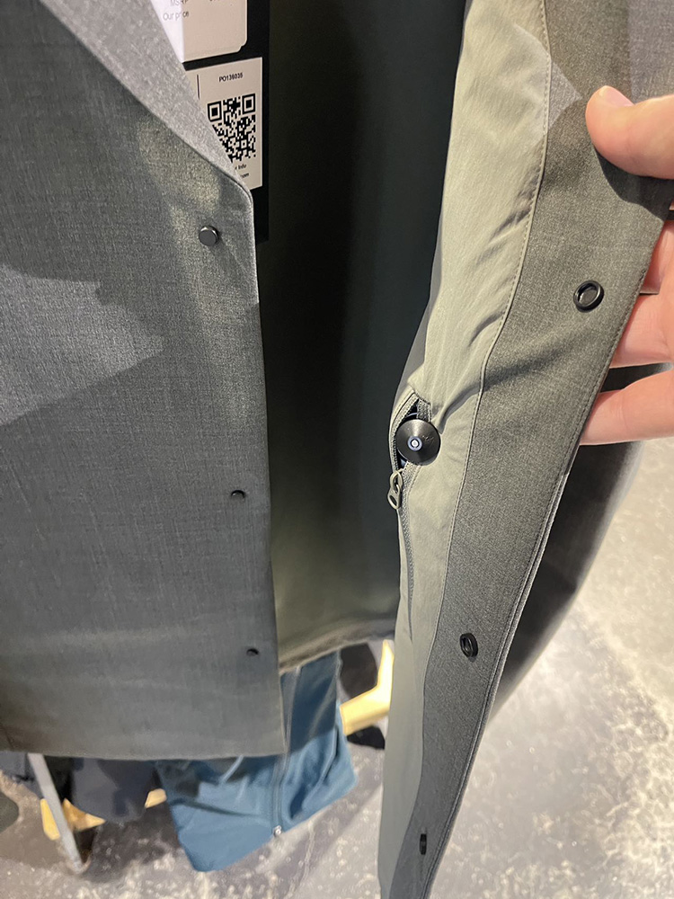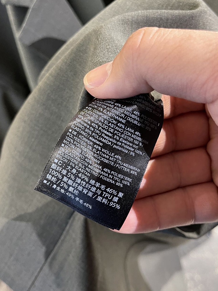 面料:衣身:3L Tech Wool 软壳面料,288gsm -经无氟(DWR)防泼水处理 衣身:49%非割尾羊毛、46%涤纶、5%弹性纤维