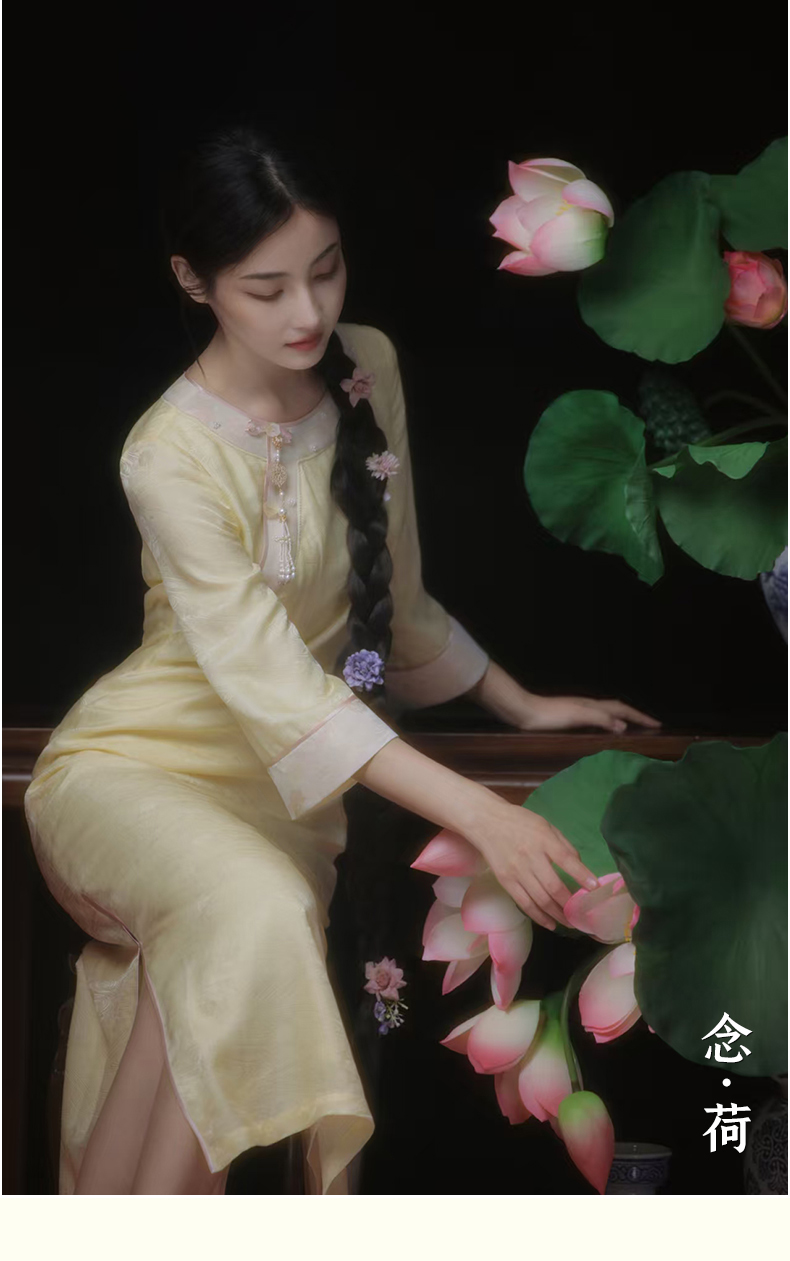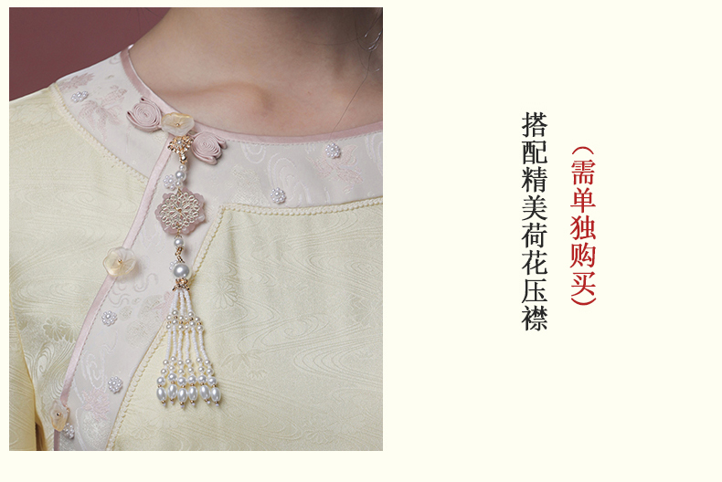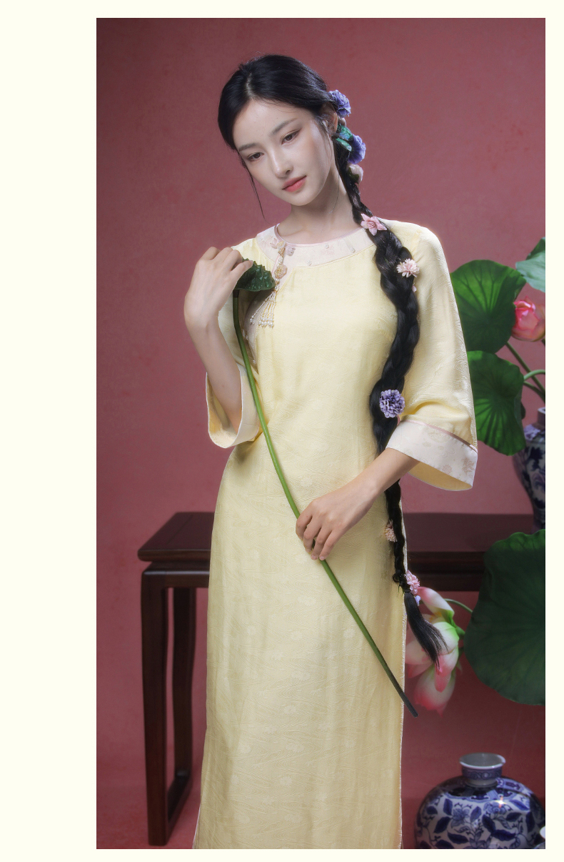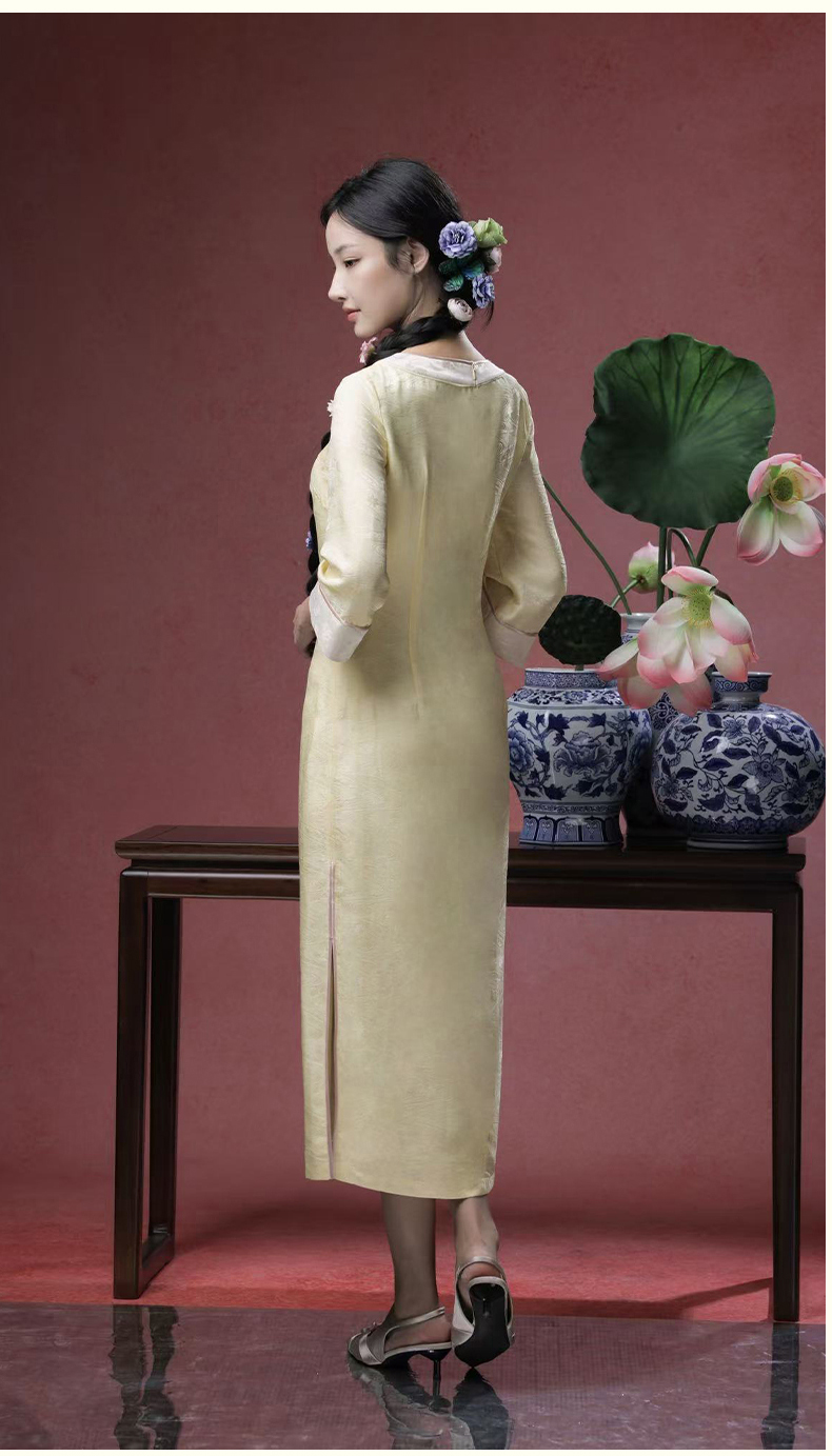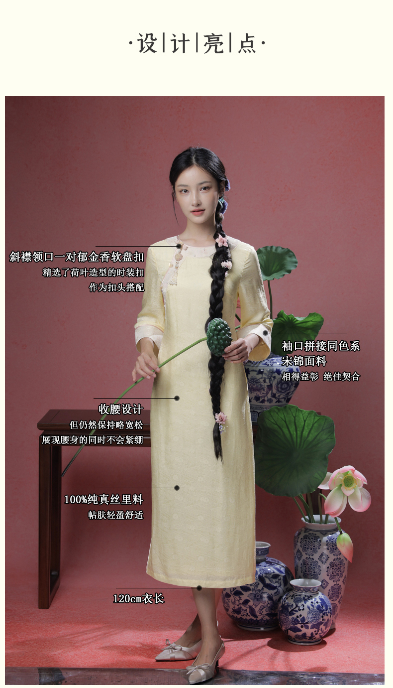 逸红颜念荷2025秋新款宽松版真丝拼宋锦锦鲤圆领新中式中袖旗袍女