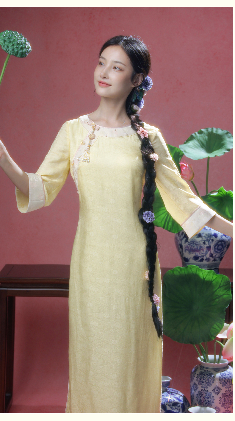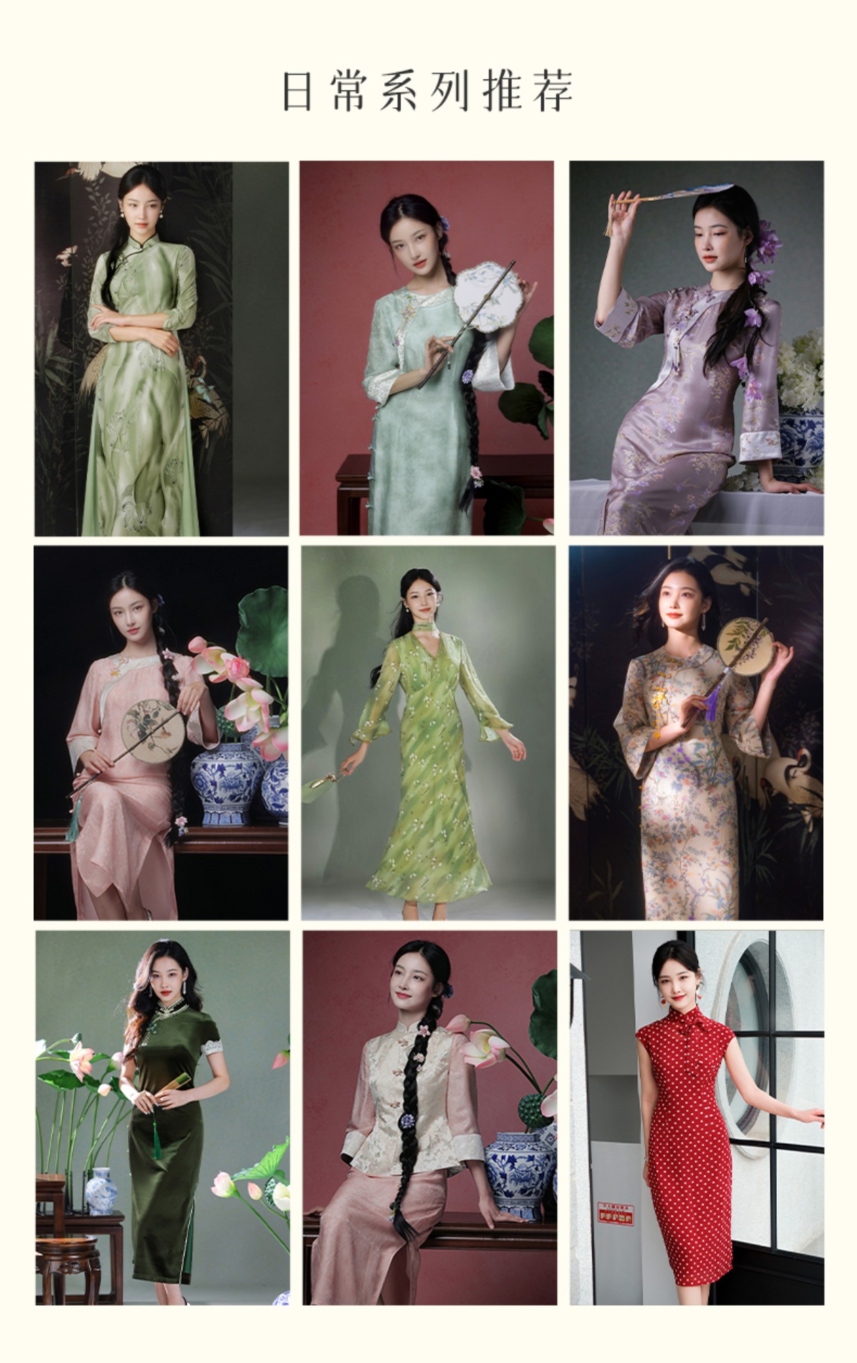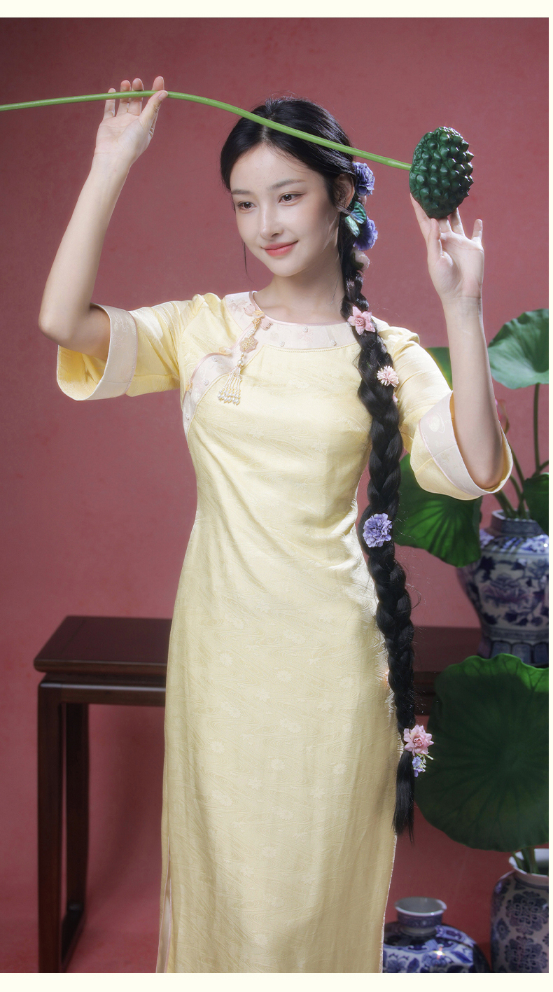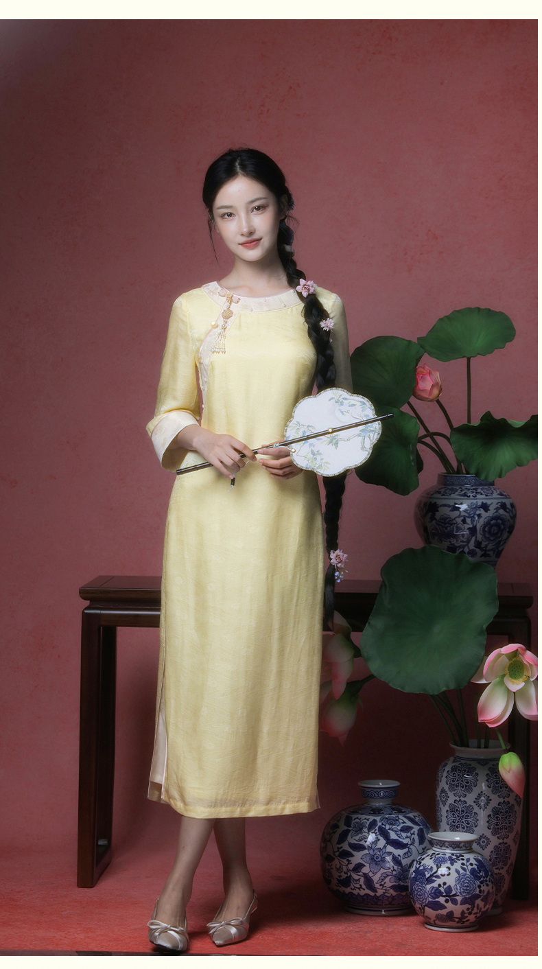 逸红颜念荷2025秋新款宽松版真丝拼宋锦锦鲤圆领新中式中袖旗袍女