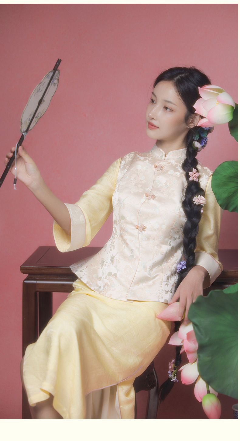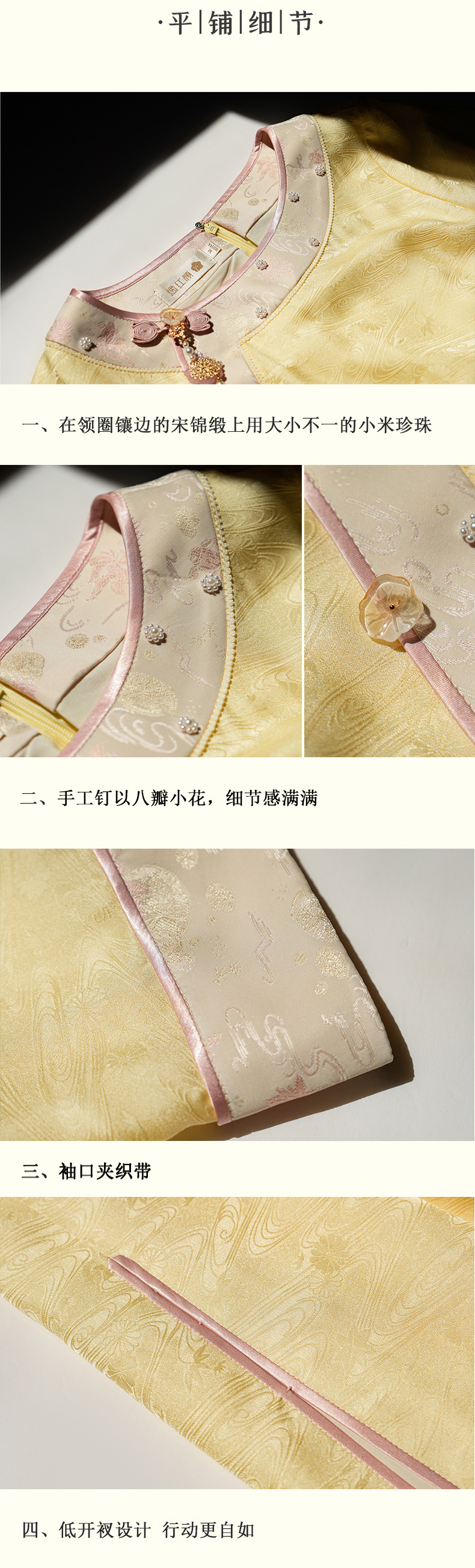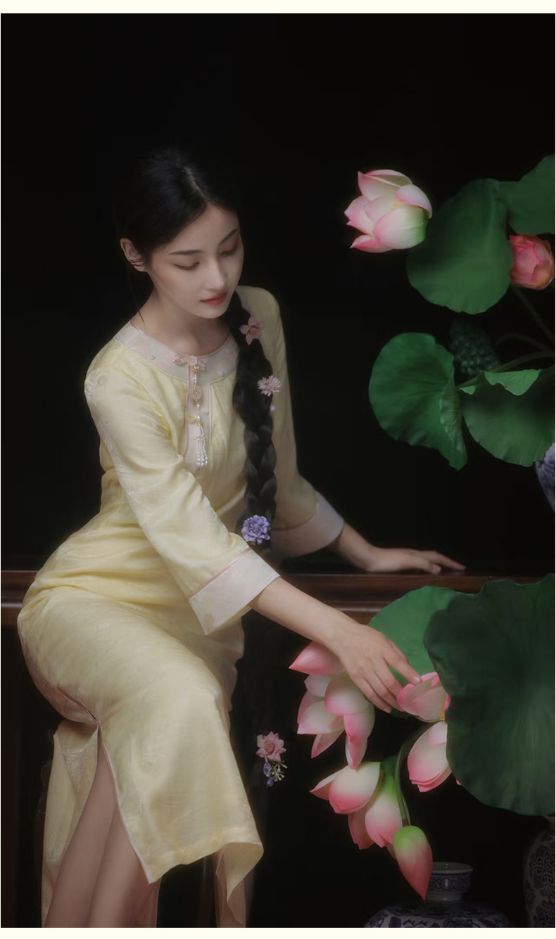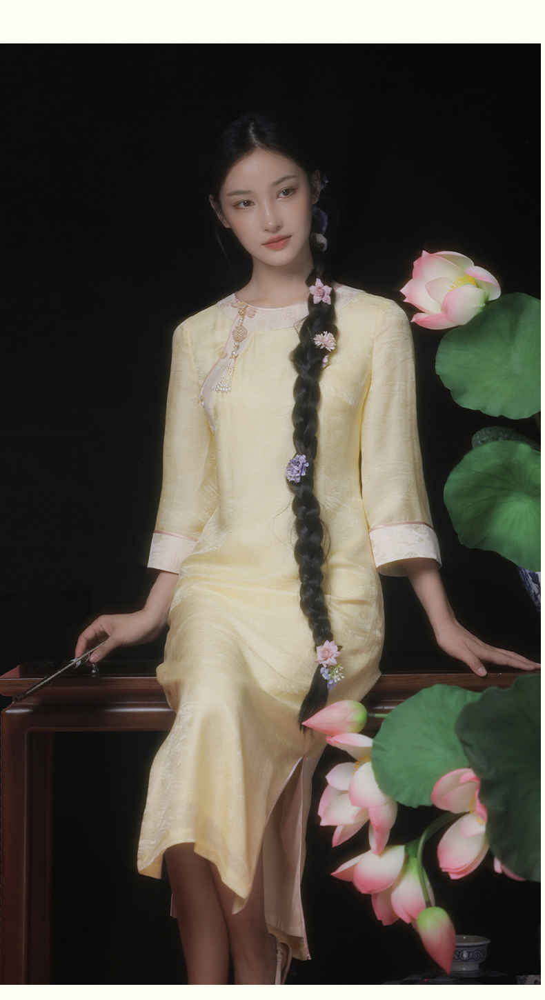 逸红颜念荷2025秋新款宽松版真丝拼宋锦锦鲤圆领新中式中袖旗袍女