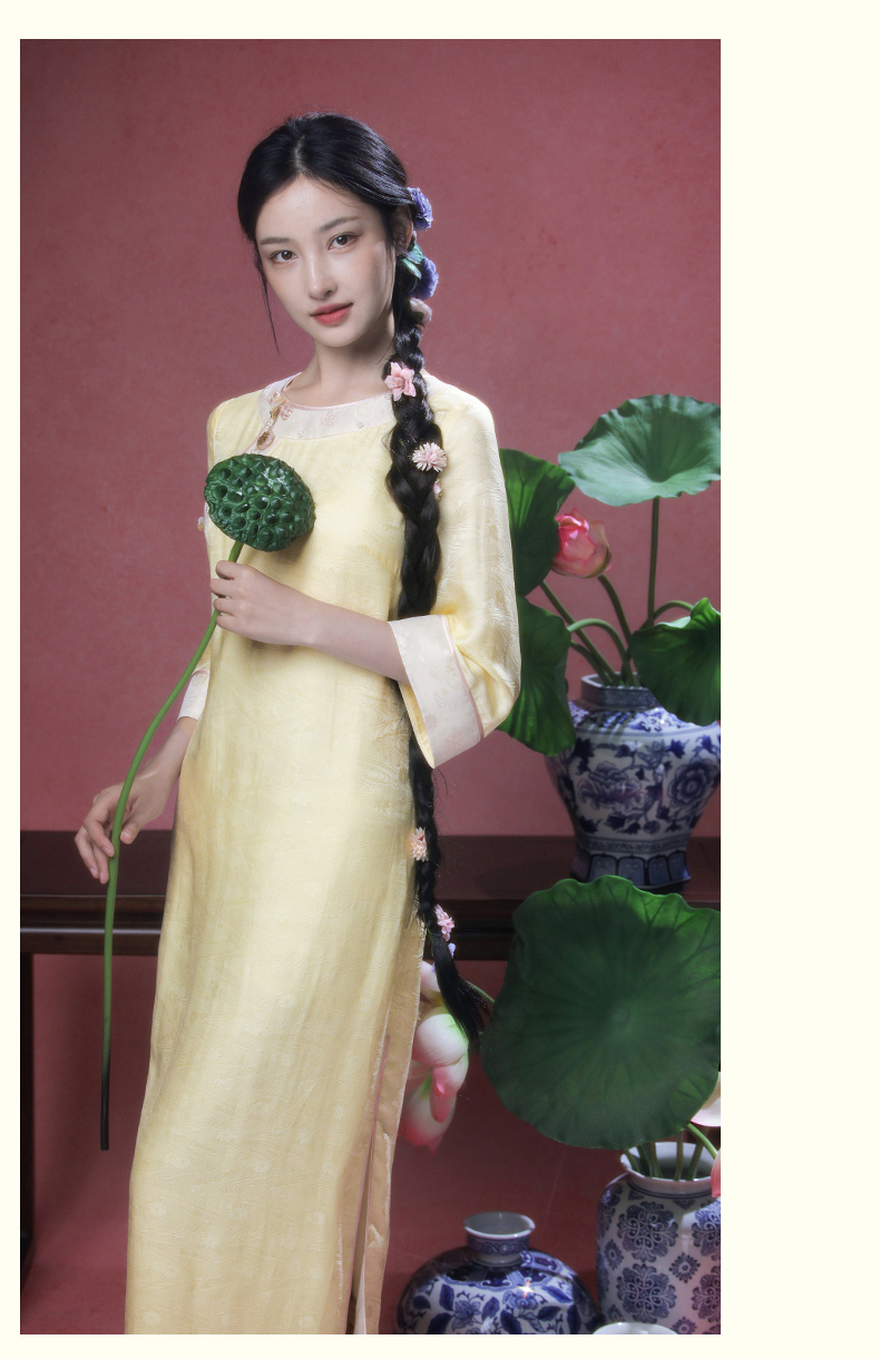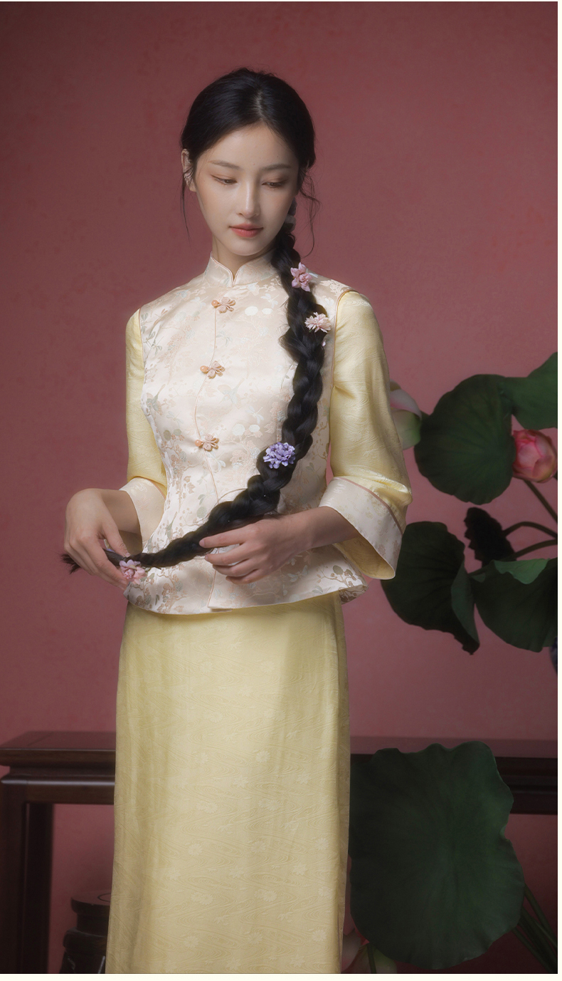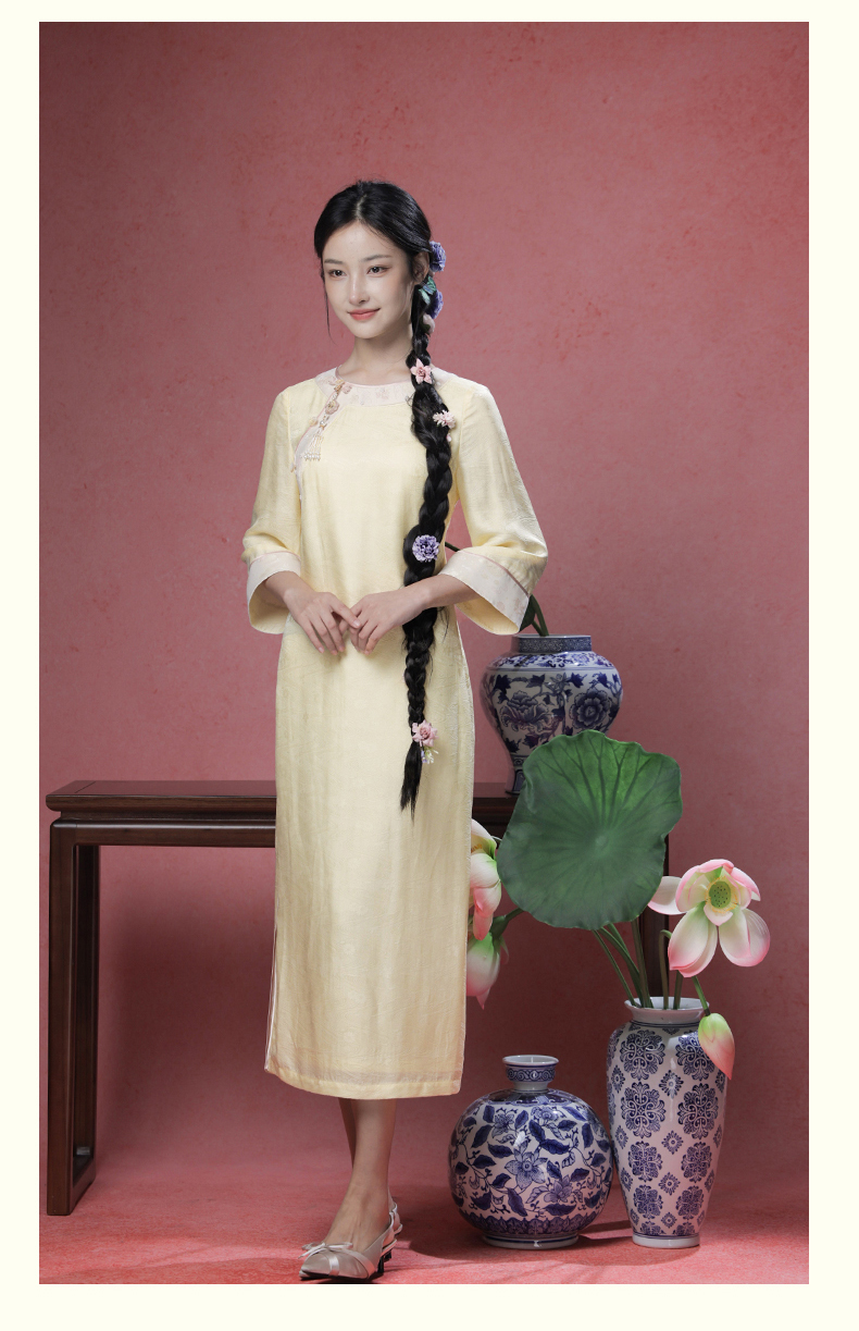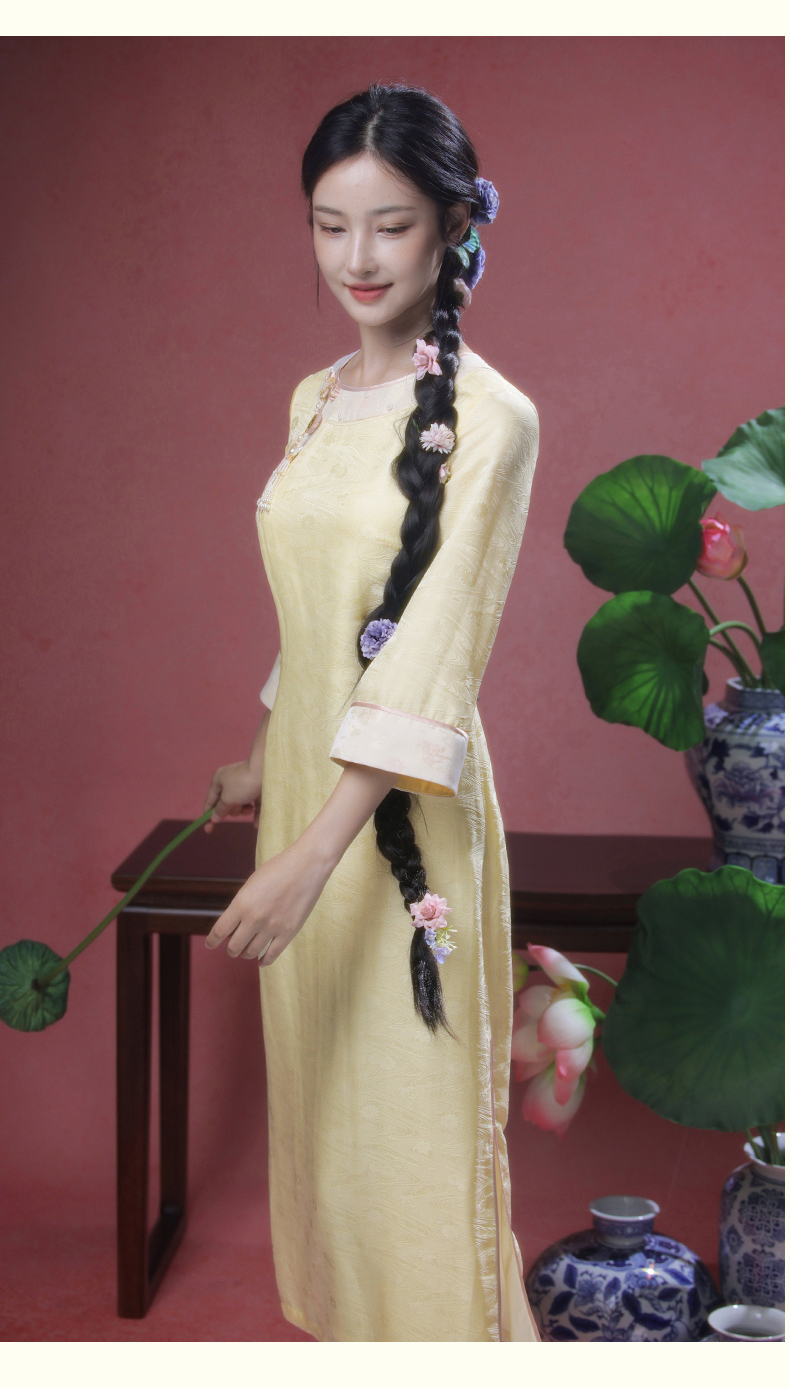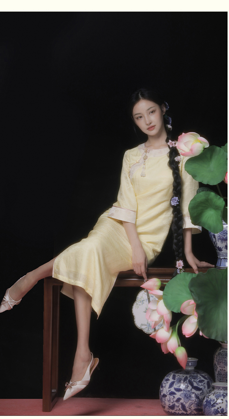 逸红颜念荷2025秋新款宽松版真丝拼宋锦锦鲤圆领新中式中袖旗袍女