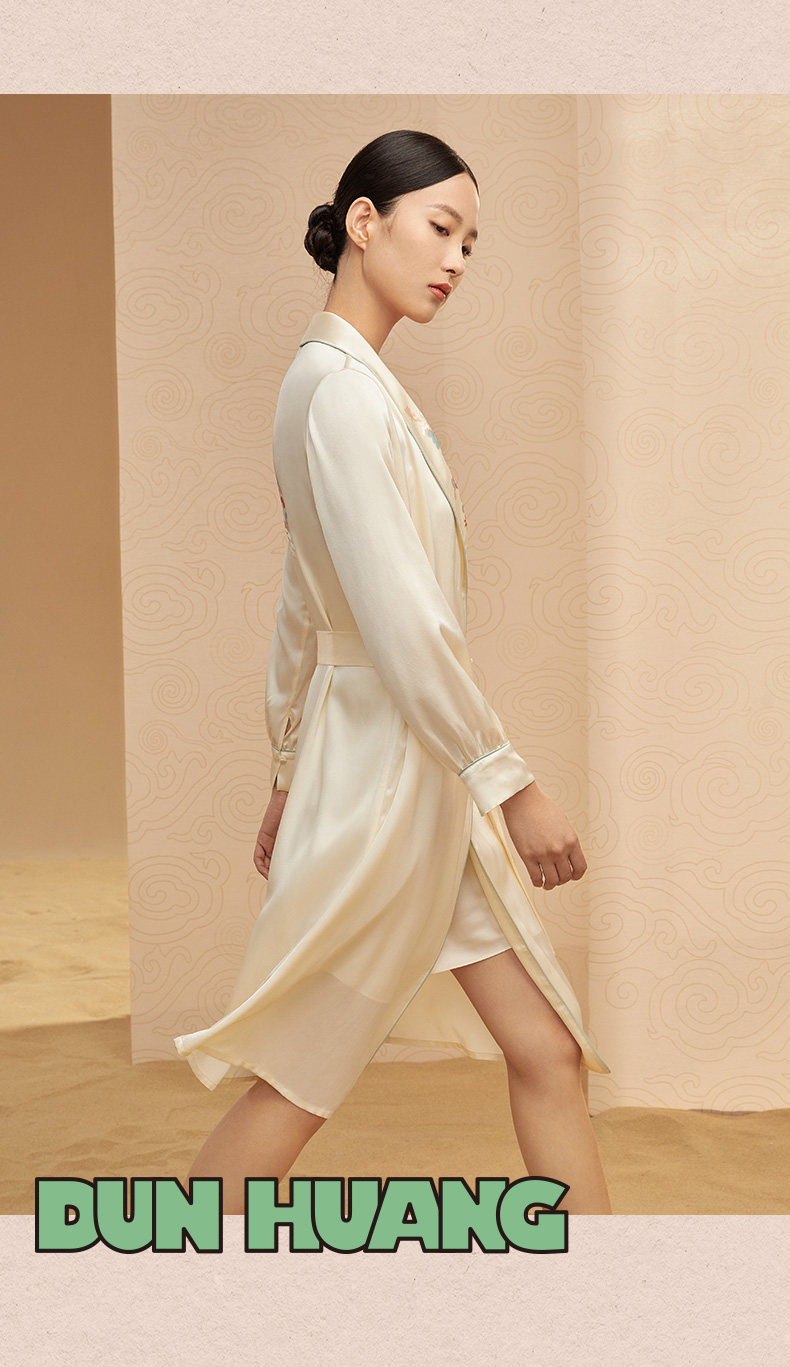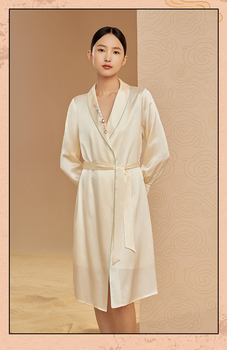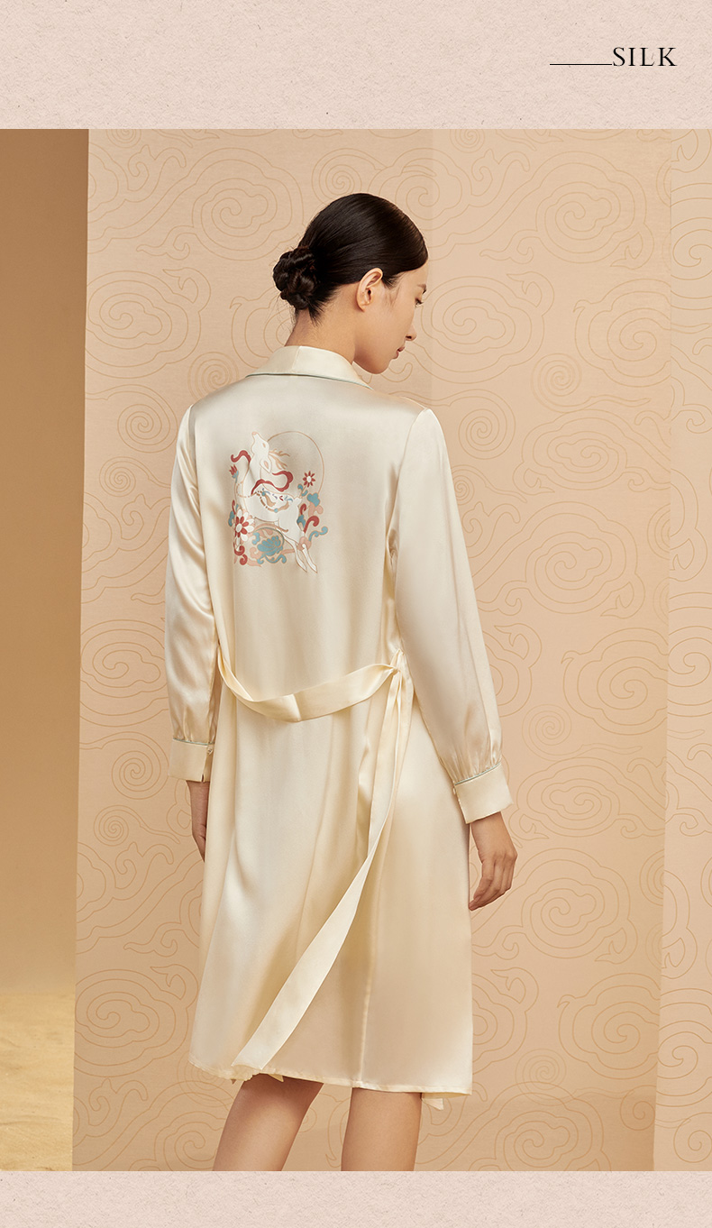 金三塔敦煌联名女士真丝九色鹿定位花白色重磅桑蚕丝单袍家居服 YSFCA107
