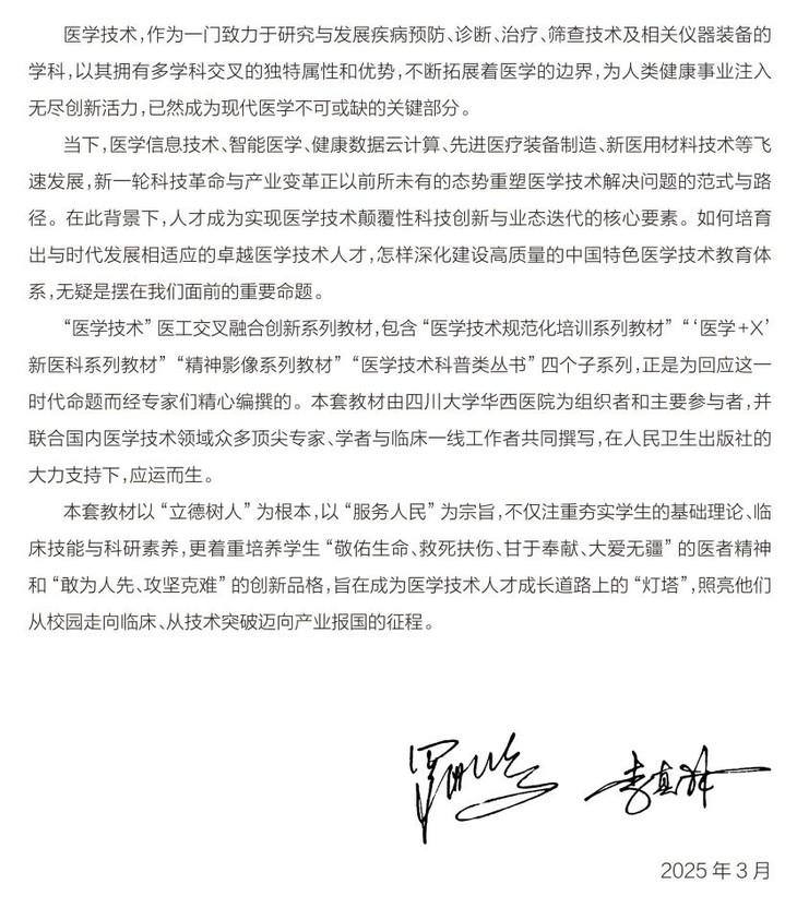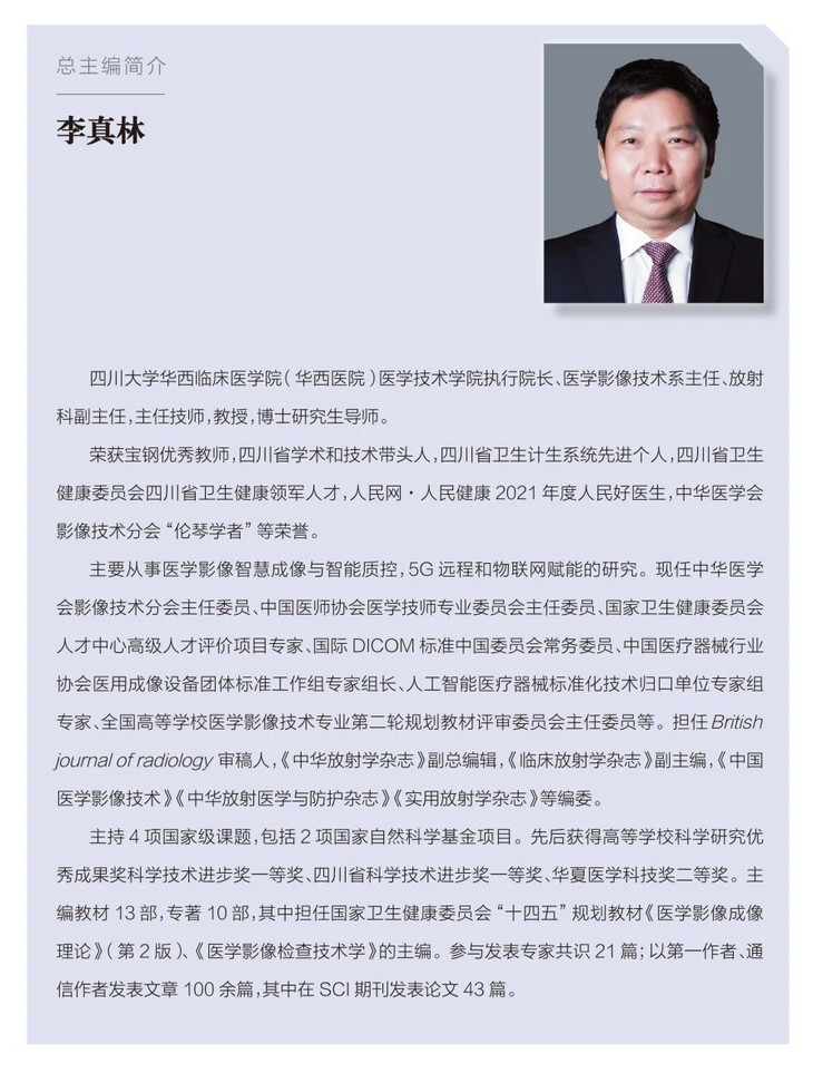 “医学技术”医工交叉融合创新系列教材,包含“医学技术规范化培训系列教材”“‘医学+X’新医科系列教材”“精神影像系列教材”“医学技术科普类丛书”四个子系列。本套系教材由罗凤鸣、李真林两位临床教育教学经验丰富的专家担任总主编,由四川大学华西医院为组织者和主要参与者,并联合国内医学技术领域众多顶尖专家、学者与临床一线工作者共同撰写。