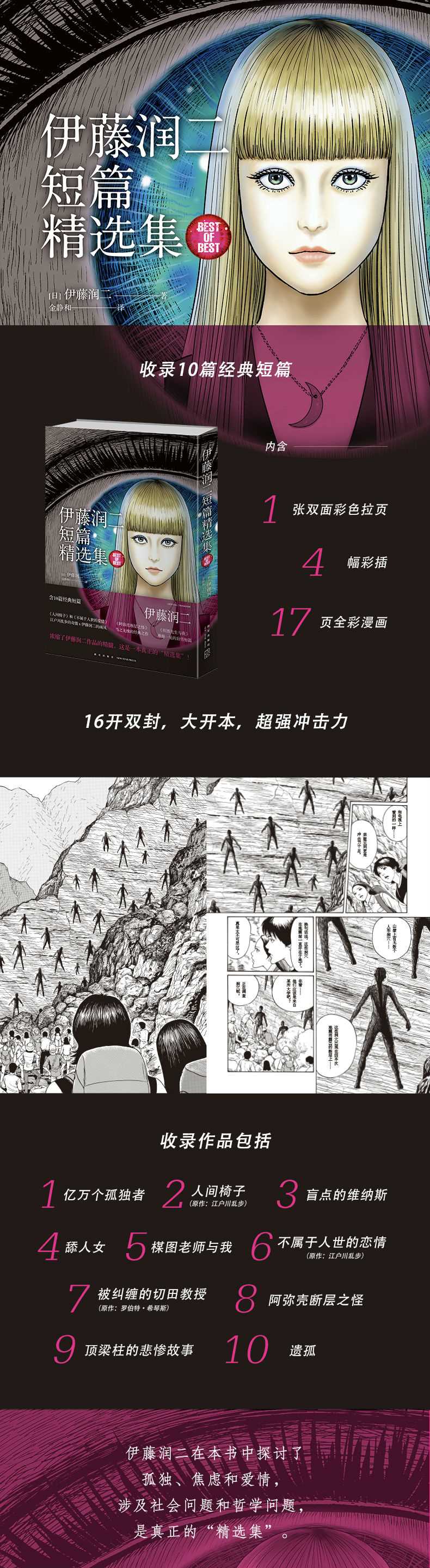 伊藤润二在本书中探讨了孤独、焦虑和爱情,涉及社会问题和哲学问题,是真正的\"精选集\"。