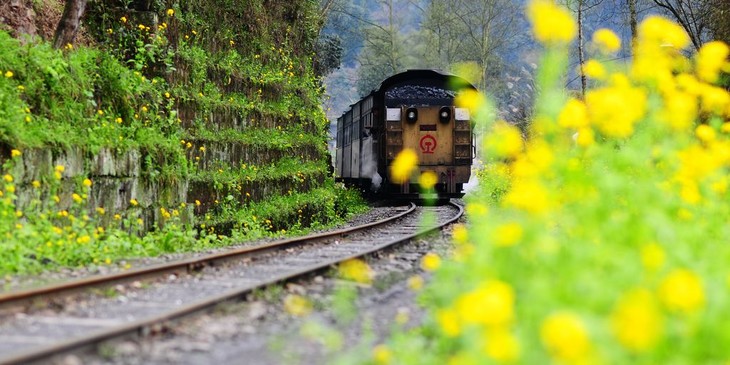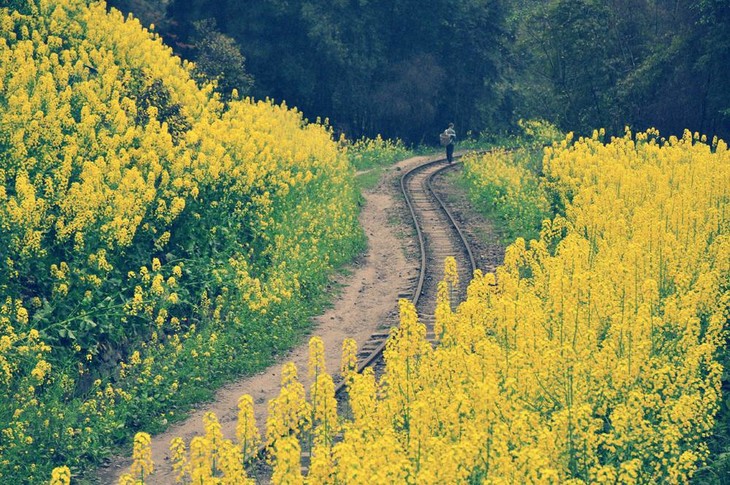 要看成片成片的油菜花,铁道两侧山花烂漫,春笋拔节,油菜花漫山遍野。在花田中等待列车驶来,留下这一美丽的倩影,很有意义哦。