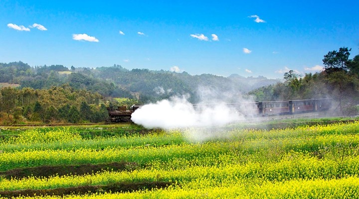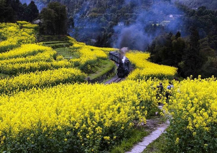 这个是中国唯一的还在运营的寸轨蒸汽小火车了,在即将盛放的油菜花田里游走,美得就像一幅画。