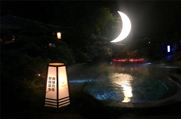 温泉区内设计布局精妙,明月松间、清泉石上、树影婆娑、氤氲香弥一隐