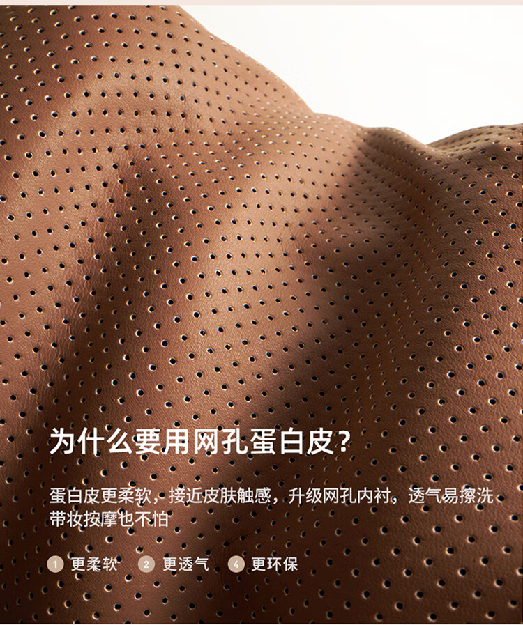 材质:采用塑料外壳,加入钢琴烤漆工艺;内衬为蛋白皮,表层气囊采用透气易擦拭的蛋白皮材质。