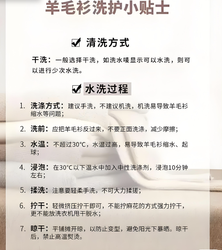 *拉绒款是有轻微洗洁精味道的,羊绒拉绒是用水洗7~12个小时经过5道特殊处理环节,用特制的软水让羊绒的绒面出绒,水洗后需48小时自然晾干,最后用定型剂让每一根绒毛变直。收到后在通风处晾一晾,即可减轻味道。