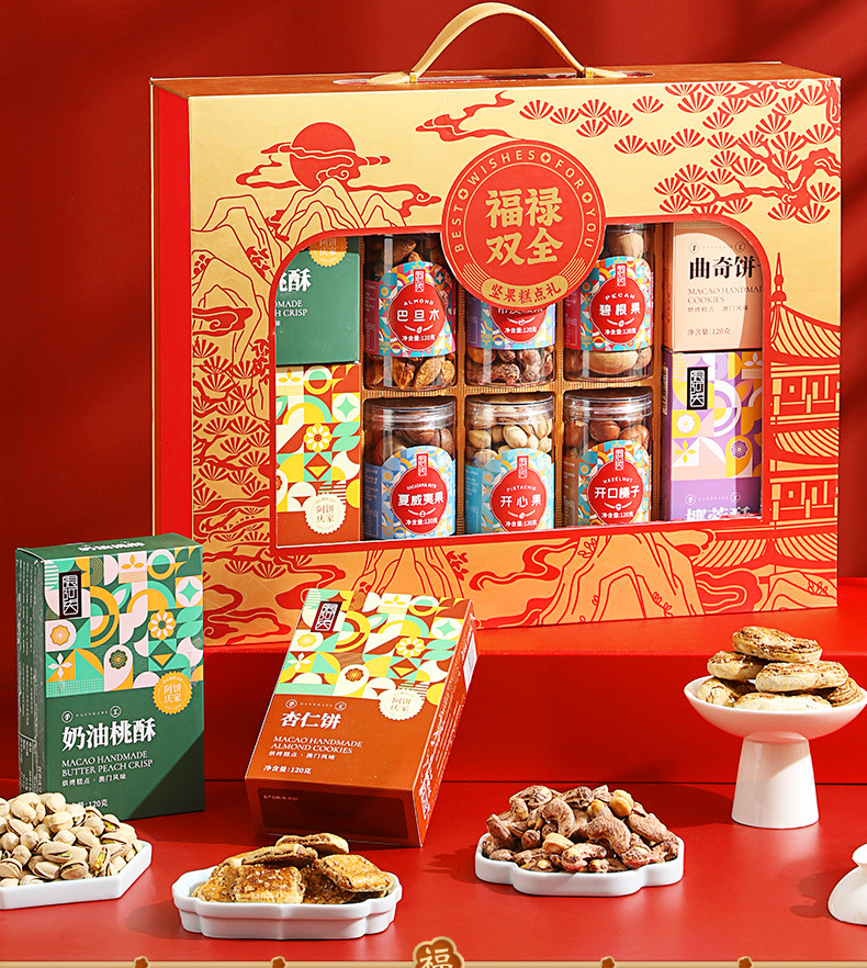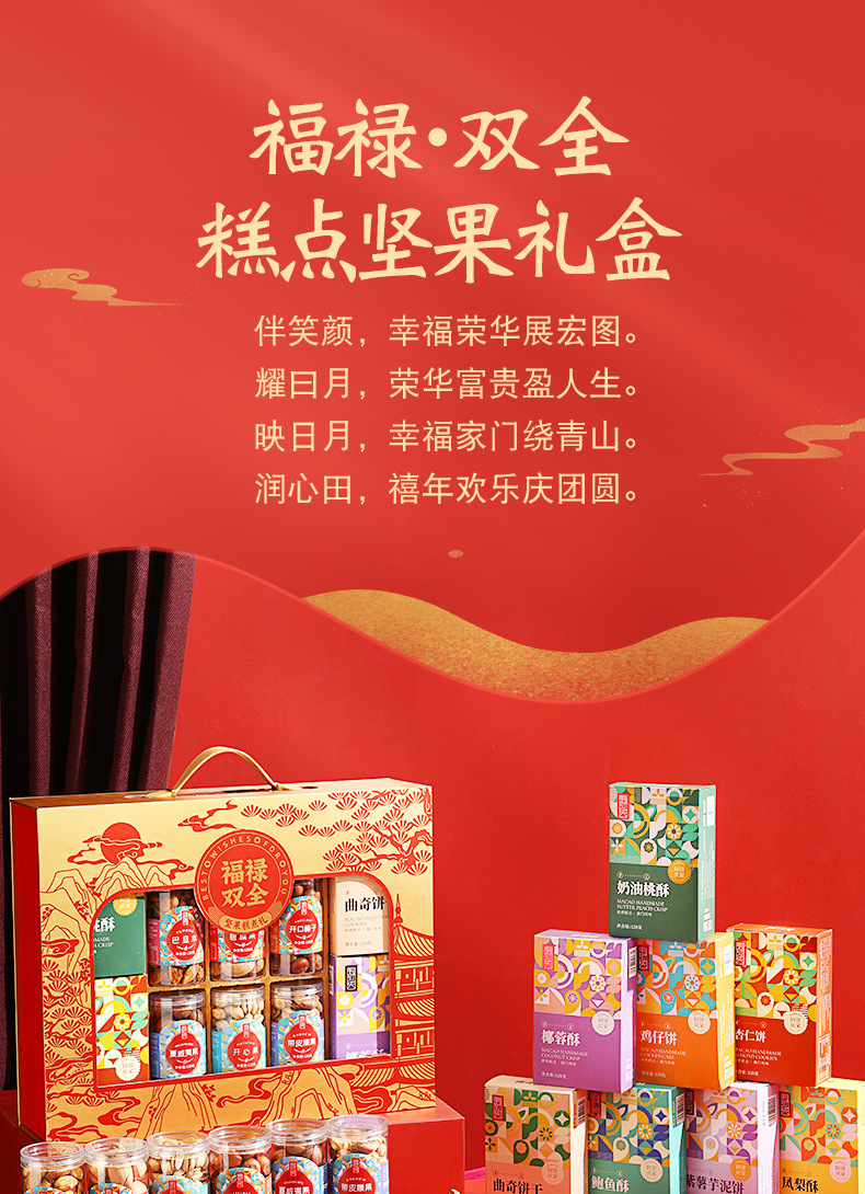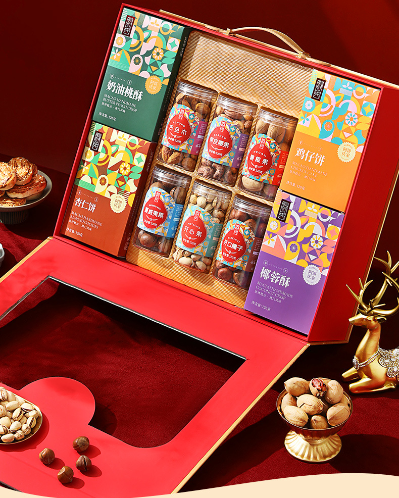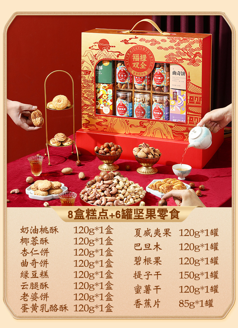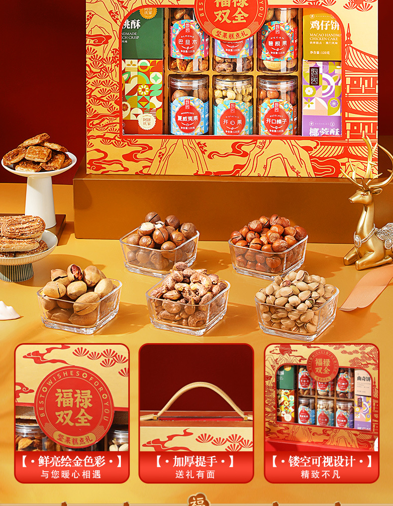 金色高档年货坚果糕点礼盒6罐坚果零食 +4盒糕点1195g