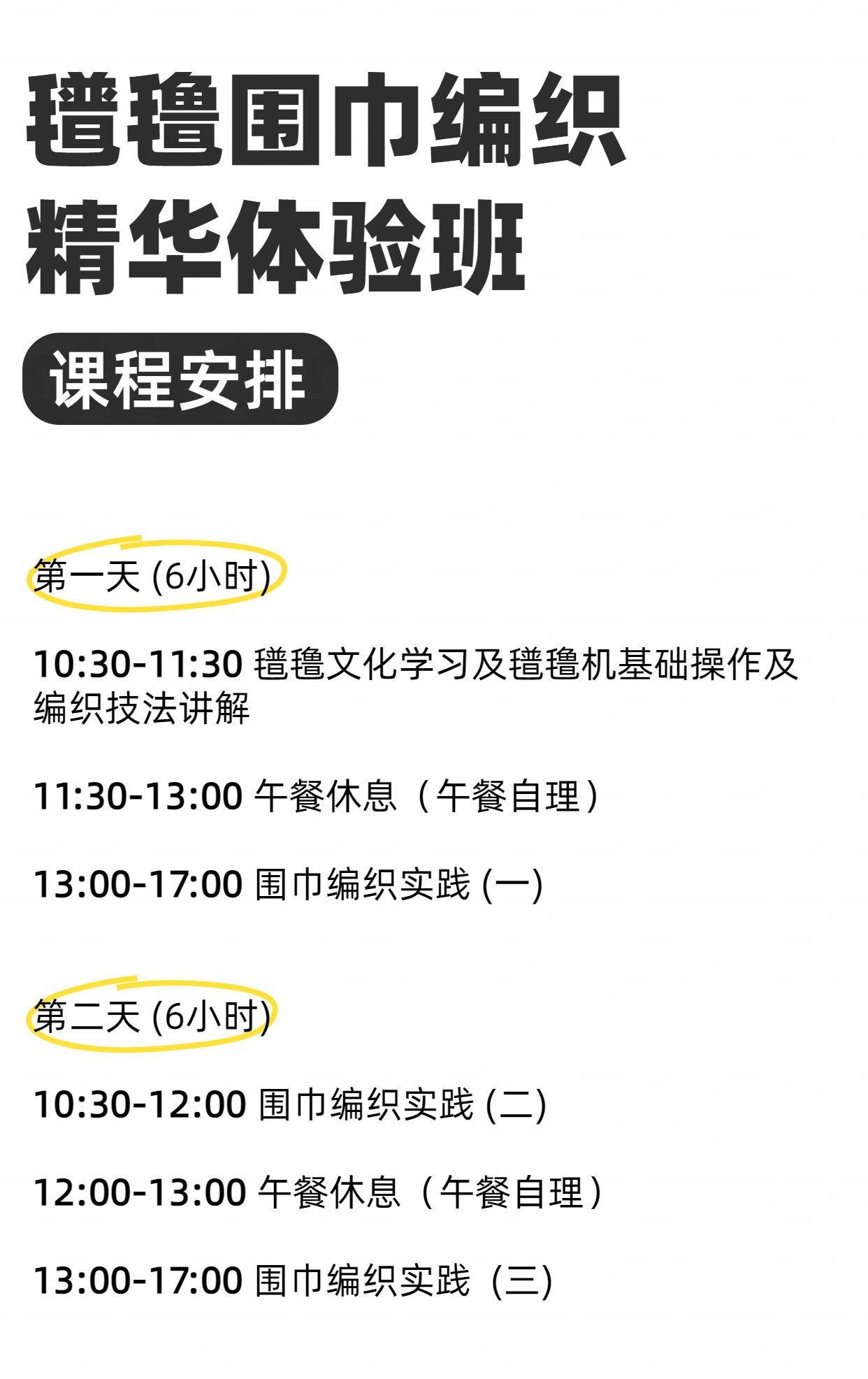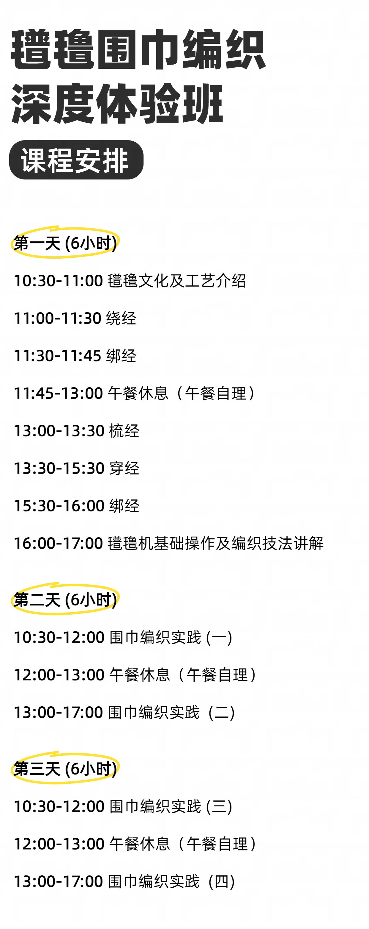 学员报名后与店铺店长确认围巾工艺及配色需求,并与店铺预约开课时间,课程1V1。(精华班学员选色后工厂需配色、完成经纬纱准备并快递至门店,需5个工作日准备。深度体验班需3个工作日准备)