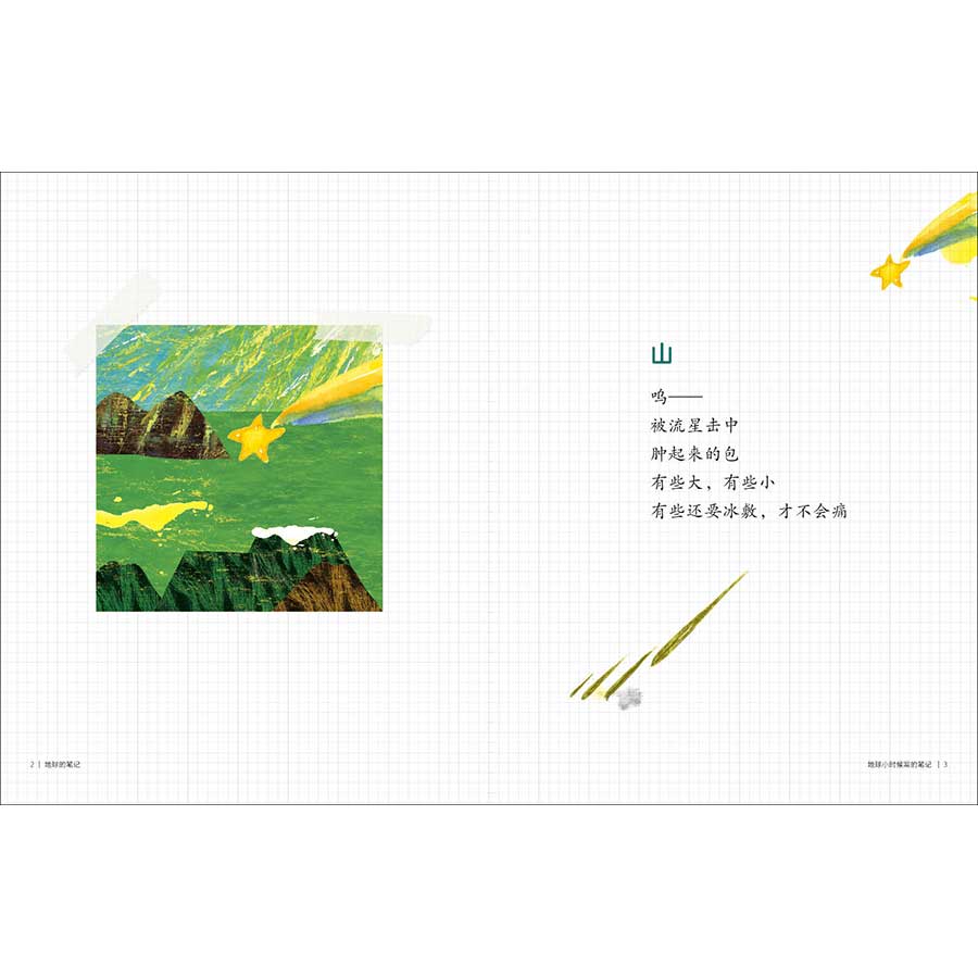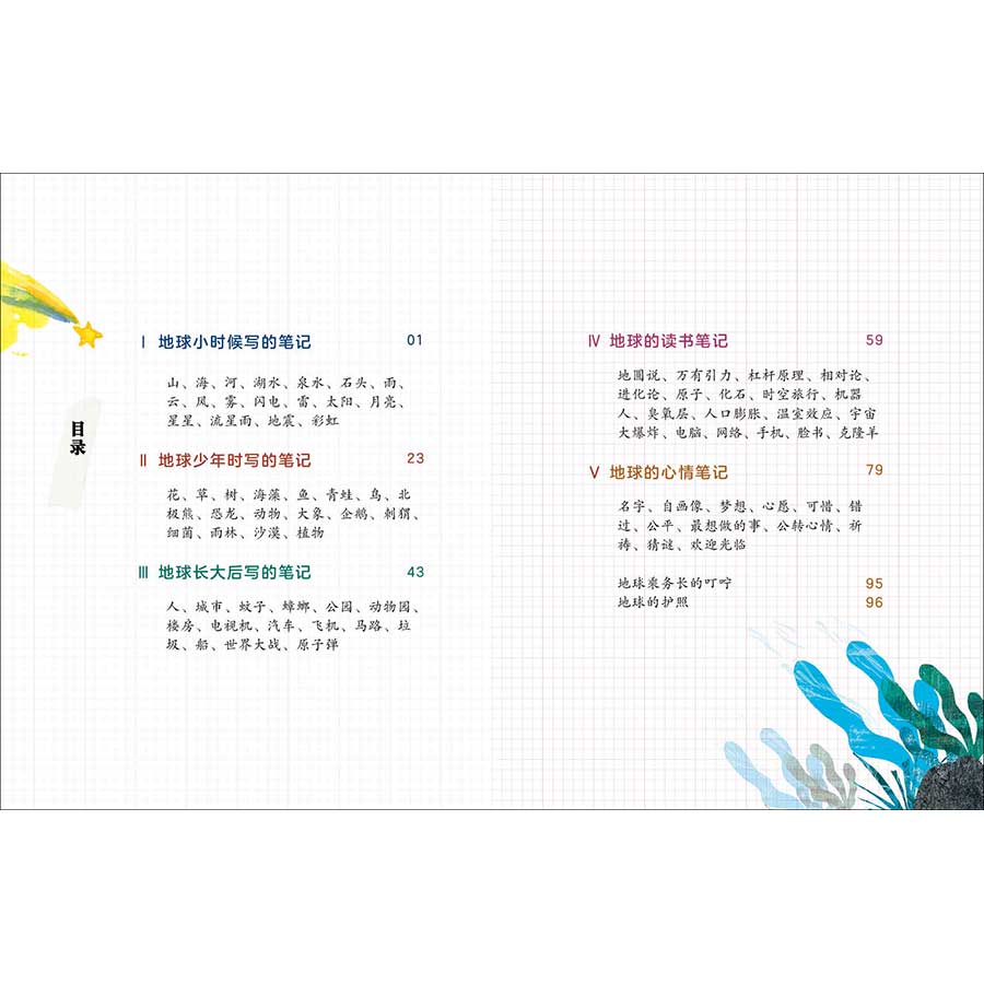 作家化身为地球,用童趣之眼、音乐般的文字,表达了对地球万物的观察和思考。这本笔记本共五辑,分别是“地球小时候写的笔记”“地球少年时写的笔记”“地球长大后写的笔记”“地球的读书笔记”“地球的心情笔记”,展现了地球从没有生物,到出现生物,再到出现人类文明的演变。