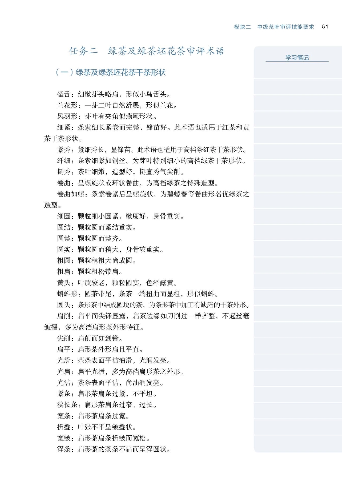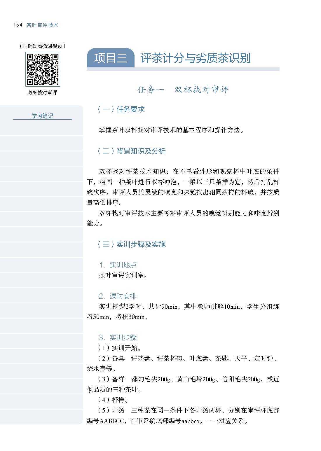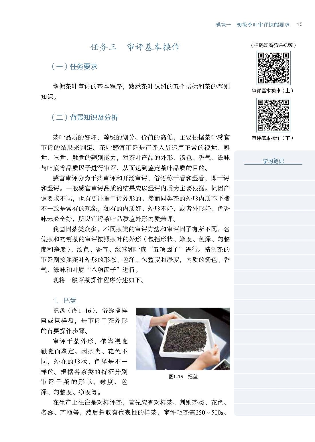 本教材采用活页式开发和设计,在使用过程中,指导教师可以根据实际教学需要对教材内容进行灵活重排,学生也可将单个学习任务的内容拆下后单独携带。每个学习任务完成后,学生可以单独取下“任务评价”页提交指导教师批改,达到灵活使用、方便携带的目的。本书是贵州省精品在线课程《茶叶审评技术》的配套教材,除配有教学课件外,学生还可以扫描书中二维码随时随地学习配套录制的几十个微视频课程。