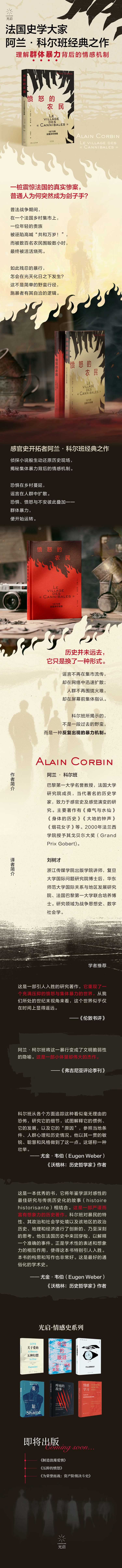 这是一部引人入胜的研究著作,它重现了一个充满压抑的愤怒与集体暴力的世界,从我们所处的世纪末视角来看,这个世界似乎仅在时间上显得遥远。《伦敦书评》阿兰柯尔班将这一暴行变成了文明脆弱性的隐喻。这本书是一部小体量却伟大的杰作。《弗吉尼亚评论季刊》科尔班从各个方面追踪这种看似毫无理由的恐怖,研究它的细节,试图解释它的惯例、它的发展,以及它的;原因,参照当地条件、人群心理和历史情况。他以其一贯的敏锐、聪慧和风格做到了这一点。这堪称一种壮举。尤金韦伯(Eugen Weber)这是一本优秀的书,它将年鉴学派对感性的最佳研究与传统历史化的故事(histoire historisante)相结合。这是一部严谨而富有想象力的历史著作。科尔班对暴民的特性、其政治和社会学处境以及该地区的政治历史、地理和经济进行了创新的、乃至深刻的思考。他在法国历史中来回穿梭,以解释一个准确的事件。正是学术性的表述和想象力的相互作用,使得这本书特别引人入胜。本书的构思和写作也非常好。这是最好的通俗化的学术史。帕特里斯伊戈内(Patrice Higonnet)