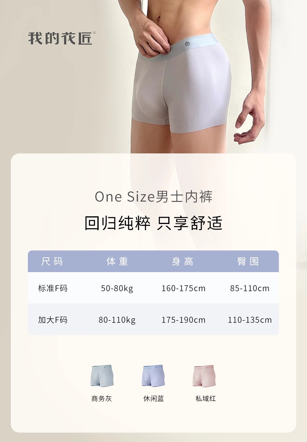 不用纠结尺码,100-160斤的选标准F码,160-220斤的选加大F码,再也不用担心买错尺码穿着不舒服了,这款One Size男士内裤适合不同体型的男性,给男人刚刚好的舒适感,趁优惠可以多入几盒!!
