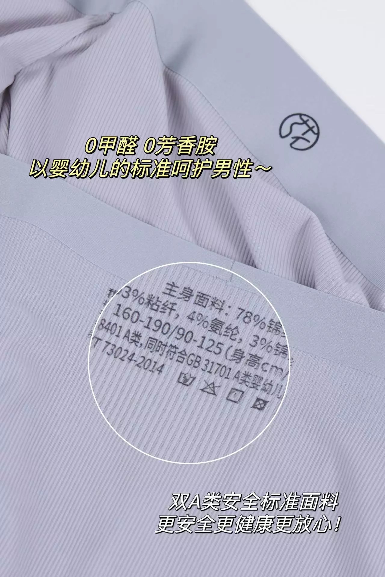 双A类面料安全标准,0甲醛,0芳香胺,以婴幼儿的标准呵护男性~