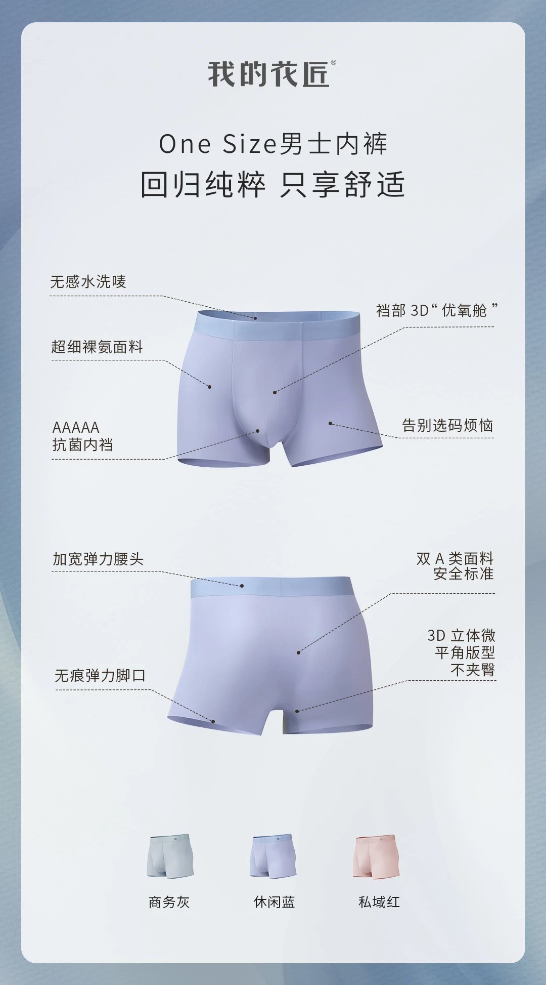 One Size男士内裤在版型剪裁上采用人体工学3D立体裁剪,微平角版型,360°贴合人体曲线,完美包裹臀部,穿上太有型了吧!老公穿上这款内裤,人都变得挺拔有气质了!