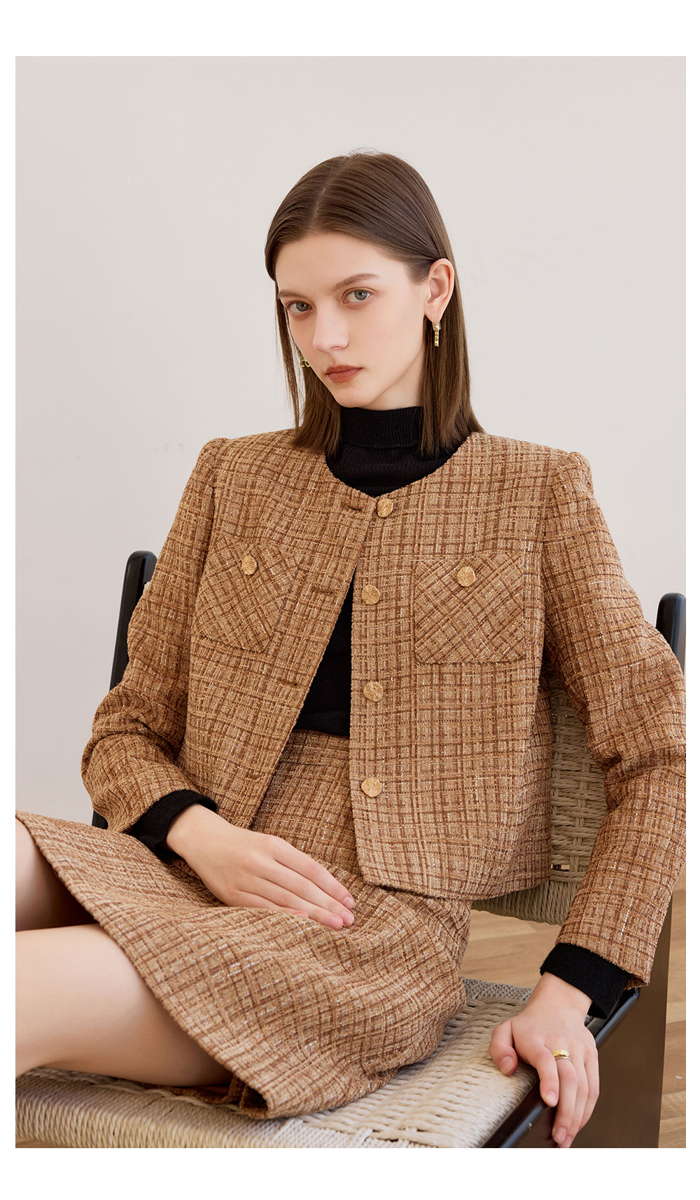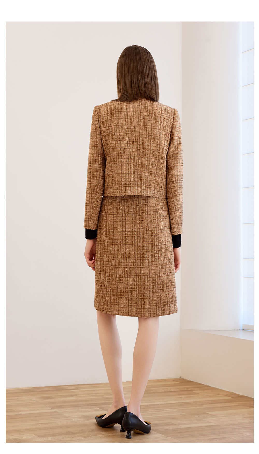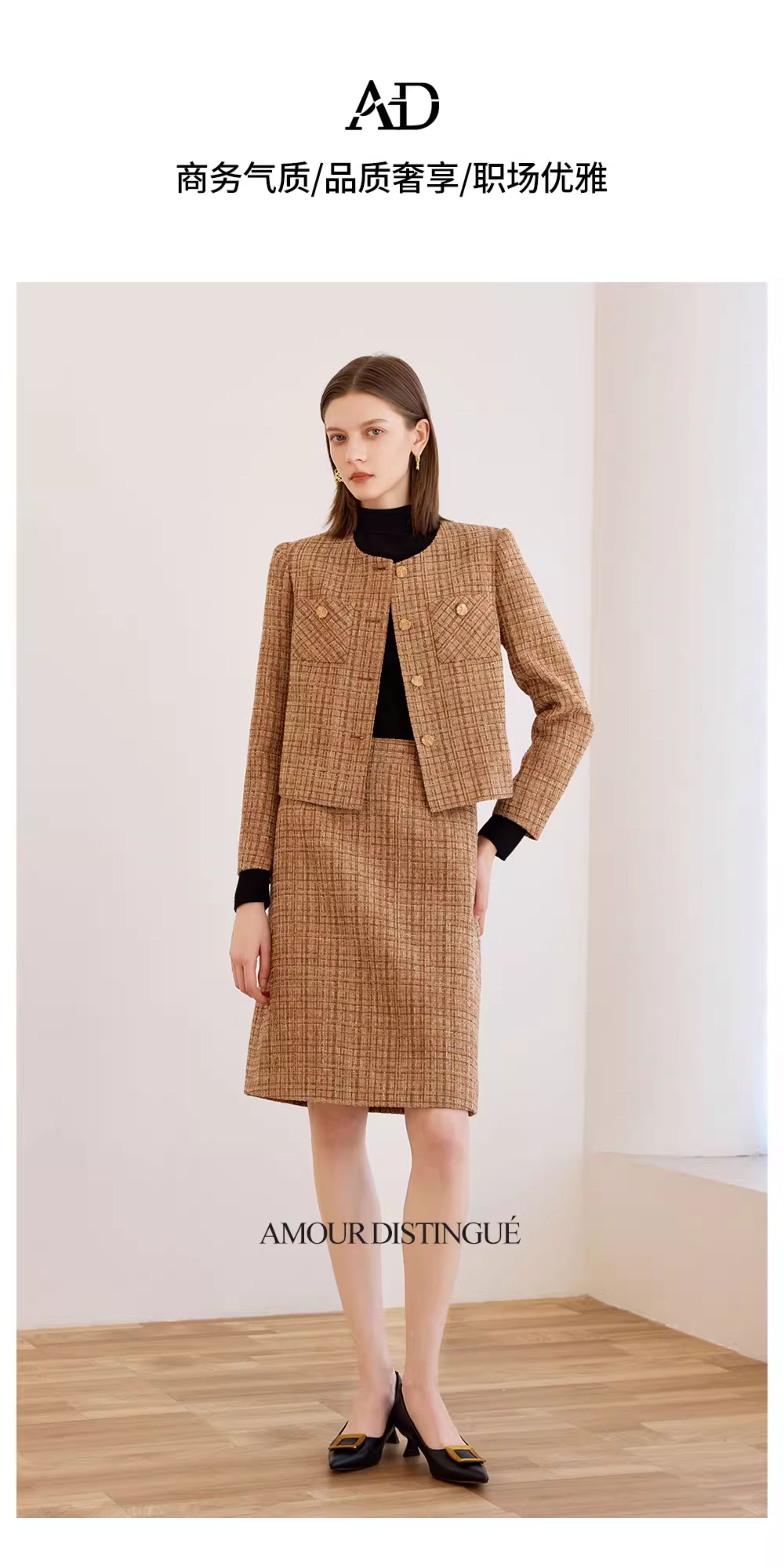 AD卡其色小香风套装女2025新款气质高级感粗花呢混纺格纹外套半裙