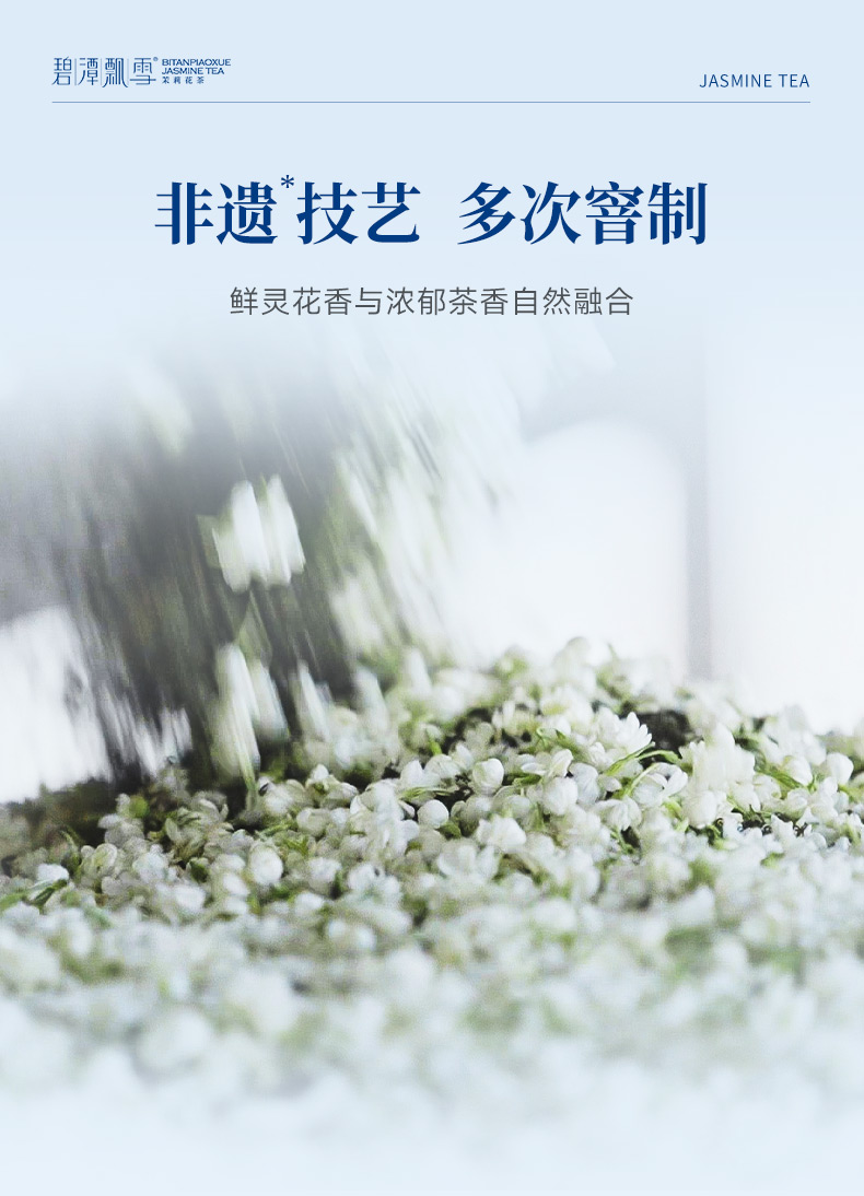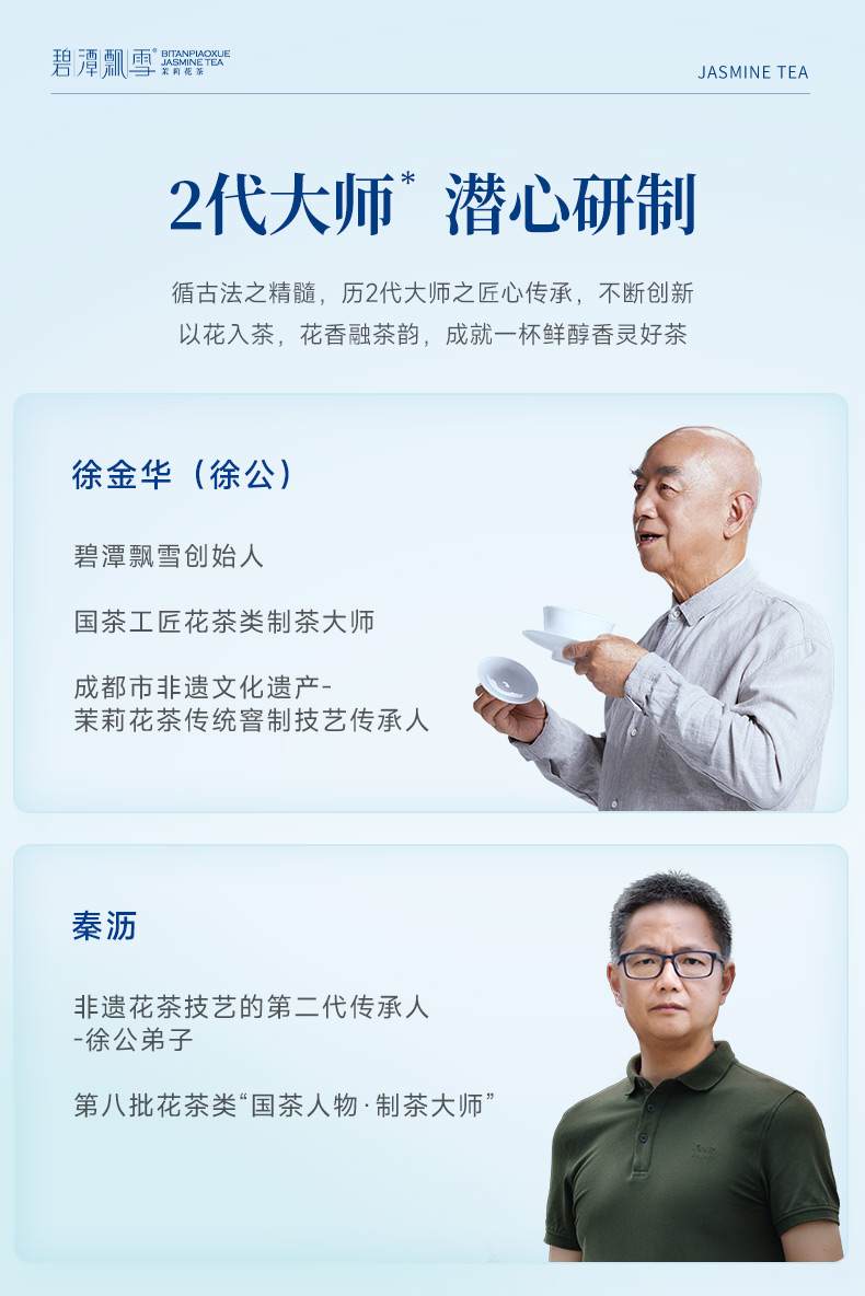 - 中国制茶大师徐金华(徐公)传承 古方制作技艺 开创新派茉莉花茶 精选峨眉高山明前春茶 配以广西横县双瓣茉莉 花与茶,黄金配比 时间酝酿,层层历练 花香与茶香交融 盖碗之间 仿佛茉莉花在舌尖绽放