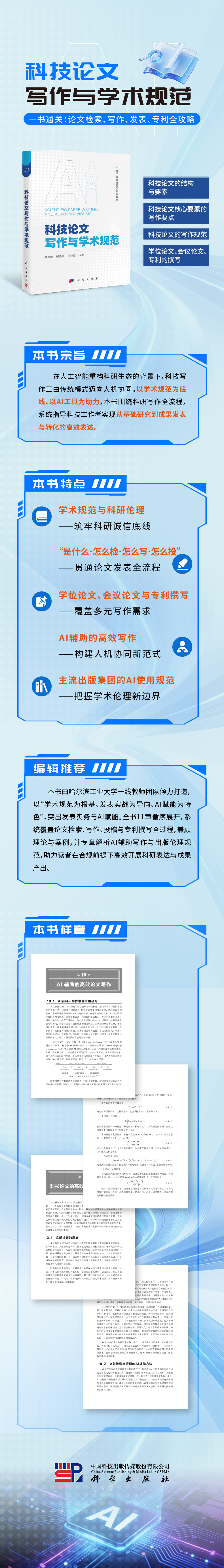 本书是一部全面覆盖科技写作领域的实用指南。全书共 10 章,从学术规范与伦理切入,明确科技写作的范畴、诚信原则及 AI 带来的伦理新挑战,为科研写作筑牢根基。 书中系统讲解科技论文的特征、分类与结构,详述文献检索方法与资料库构建技巧,指导读者做好写作准备、把握写作流程,还为初学者提供实用建议。对于期刊论文,不仅剖析标题、摘要、引言等核心部分的写作要点并附案例,还规范了数字、公式、语言文字等写作细节。 同时,书中介绍了期刊论文发表的全流程,包括期刊选择、投稿准备、审稿应对等;阐述学位论文、会议论文的规范,以及专利的相关知识与申请维护要点。此外,紧跟技术发展,探讨 AI 在论文写作中的辅助应用、伦理问题及主流出版社规范,为科研人员提供全方位的科技写作指导。
