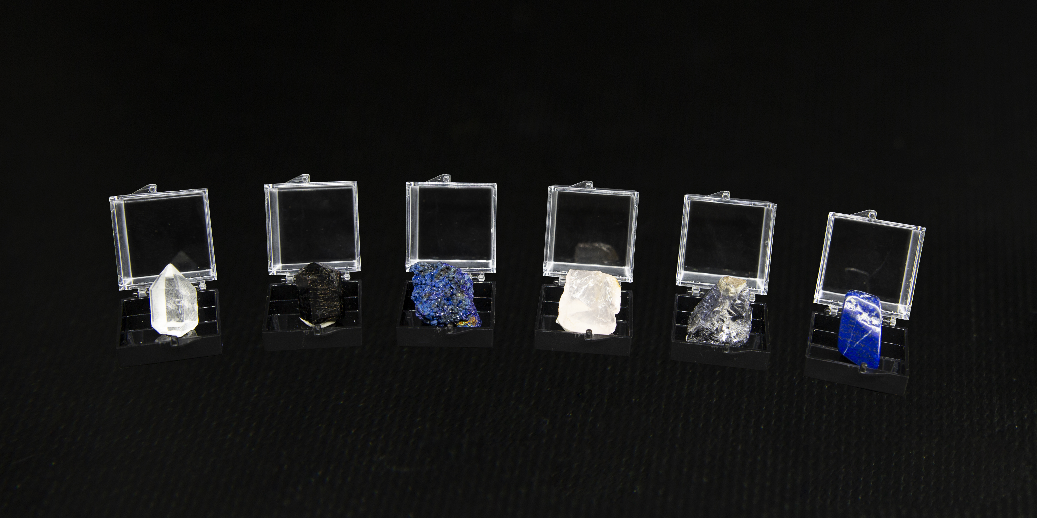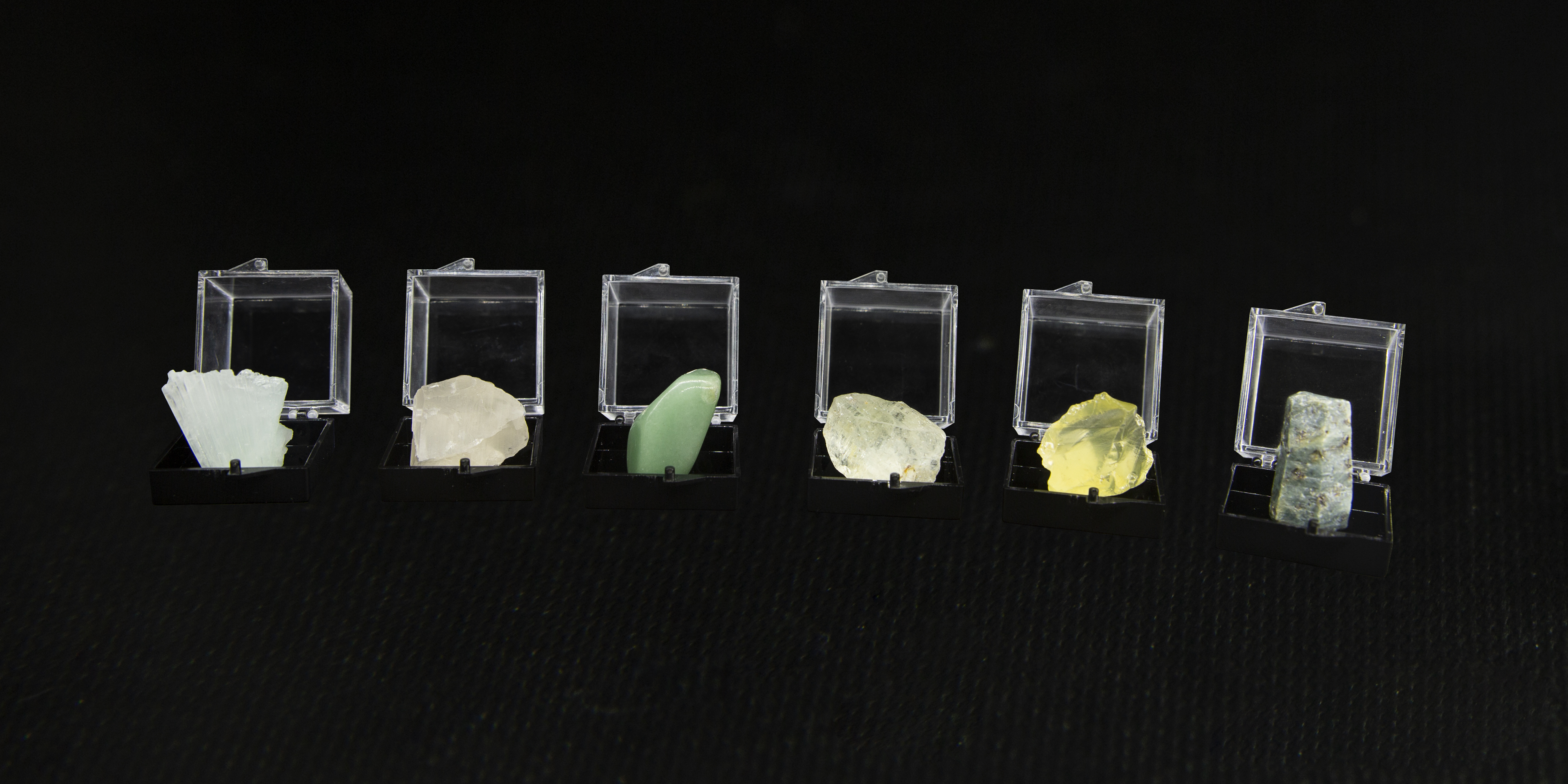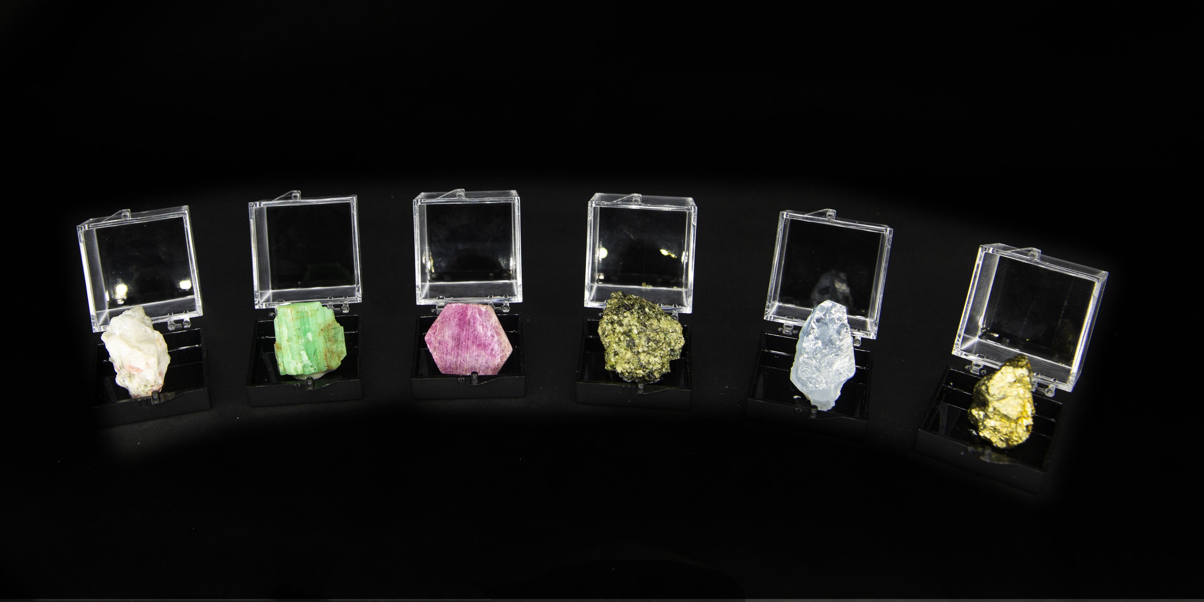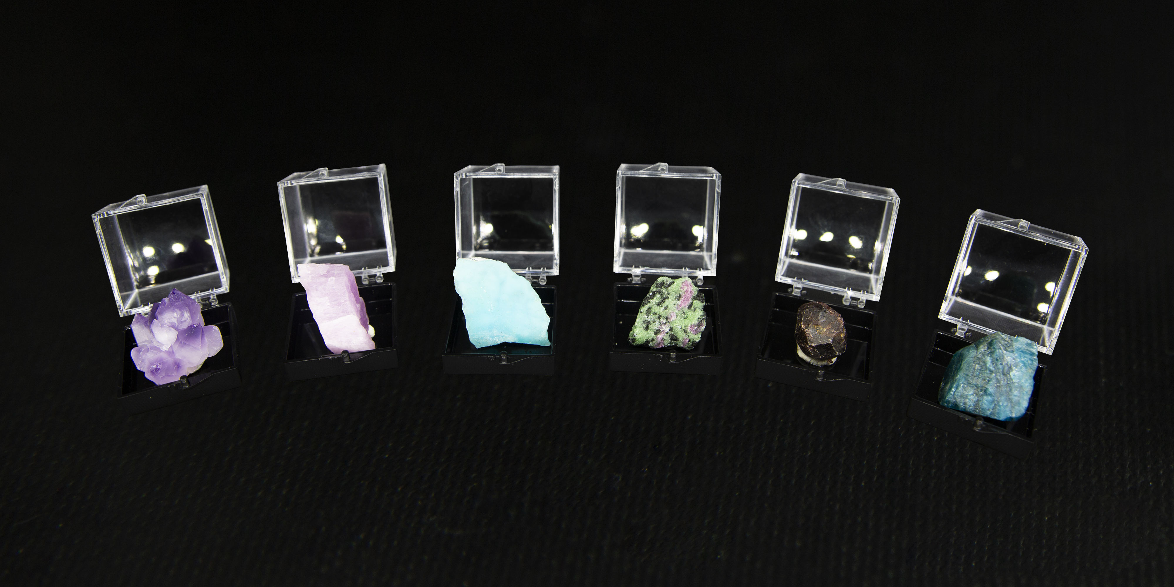 祖母绿、天青石、石榴子石、异极矿、红绿宝石、磷灰石、黄铜矿、紫水晶、橄榄石、菱锰矿/孔雀石、锂辉石、红刚玉、黄水晶、东陵玉、月光石、粉水晶、托帕石、蓝刚玉、蓝铜矿、方铅矿/拉长石、碧玺、青金石、蓝文石、水晶