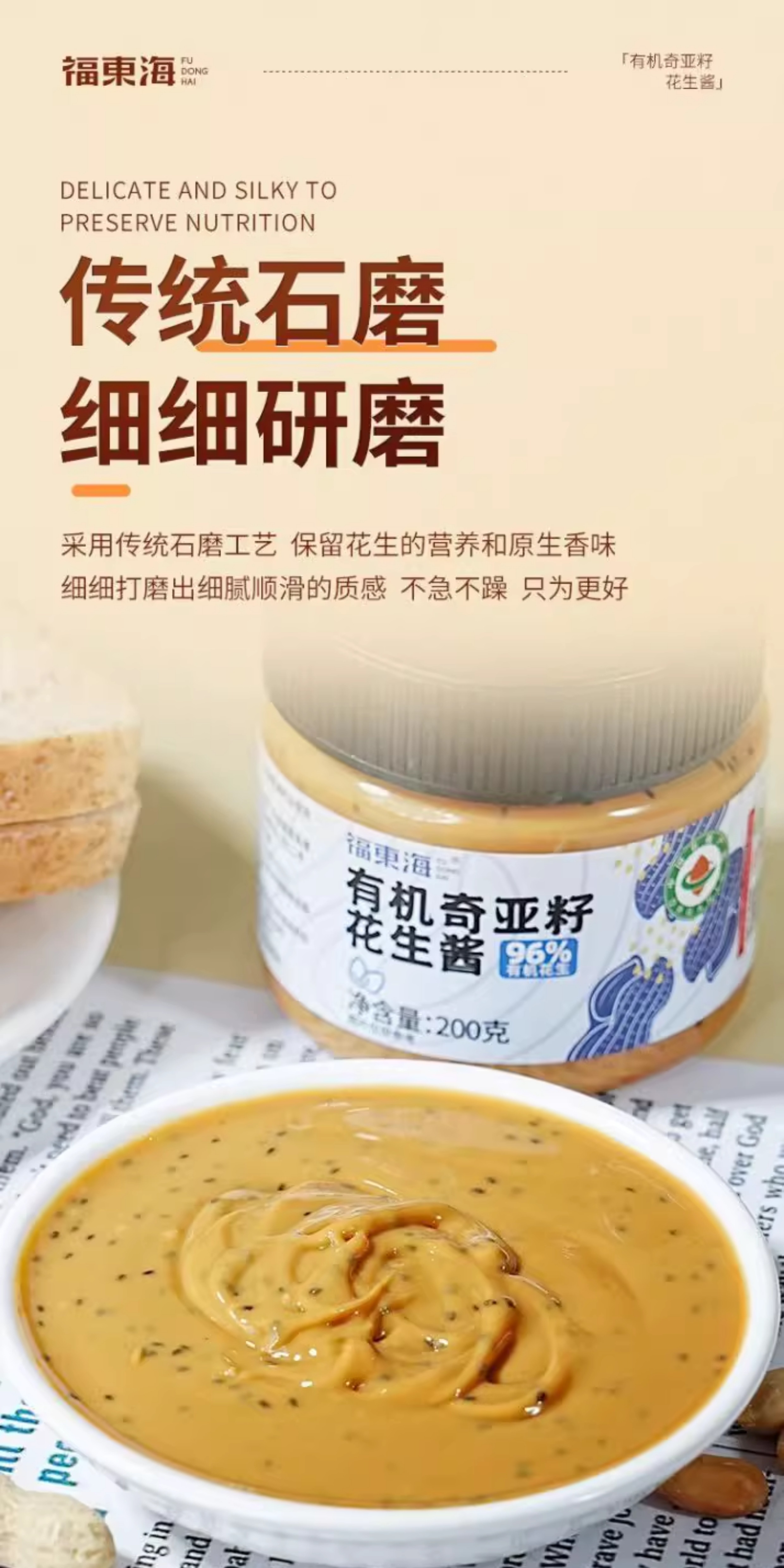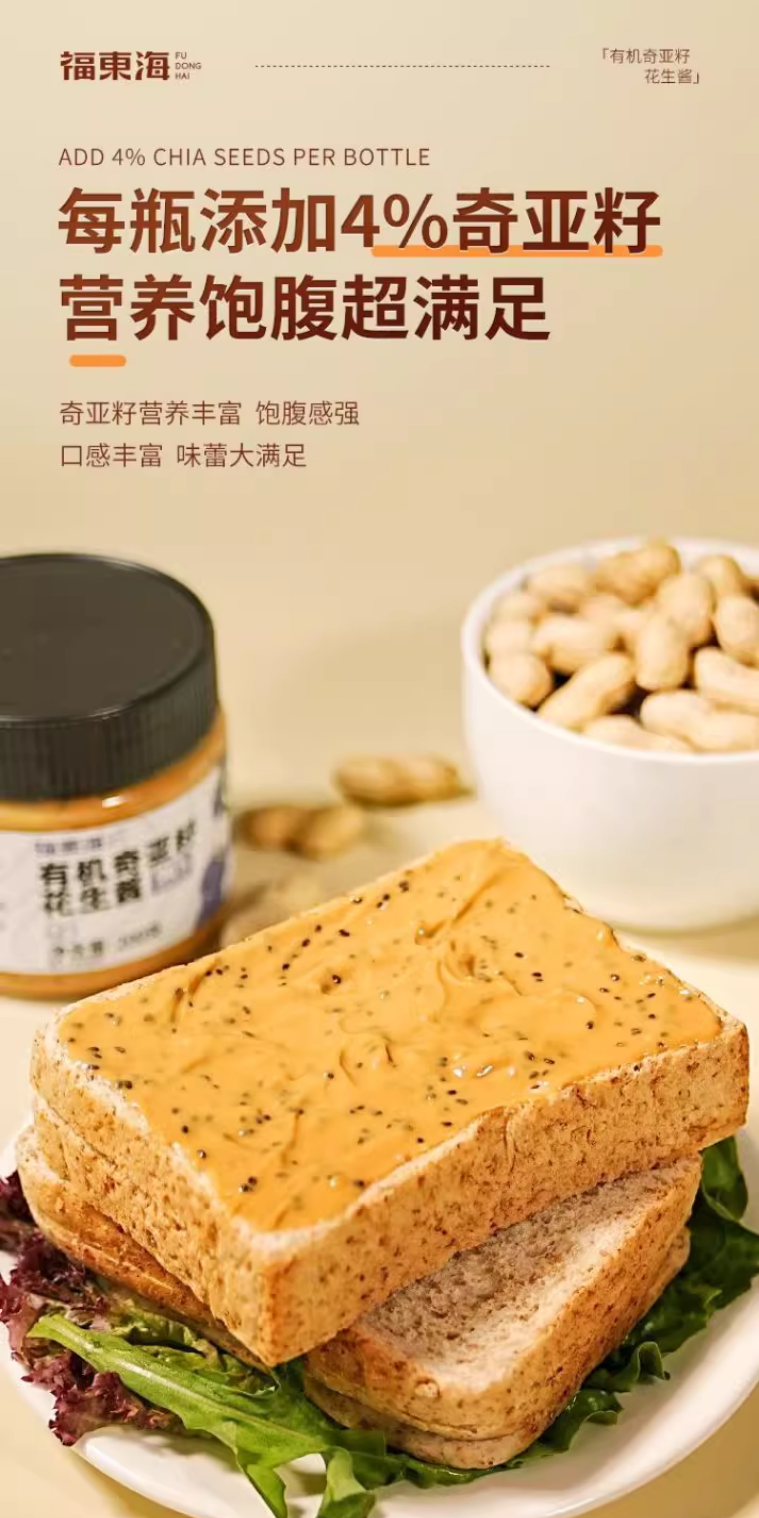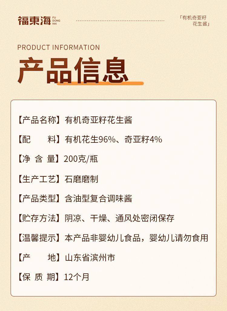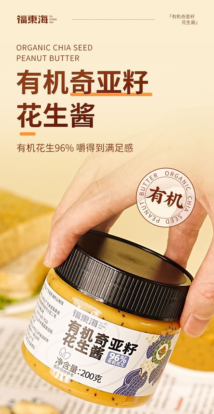 福东海有机奇亚籽花生酱200g营养健康早餐健身面包拌酱其他药食