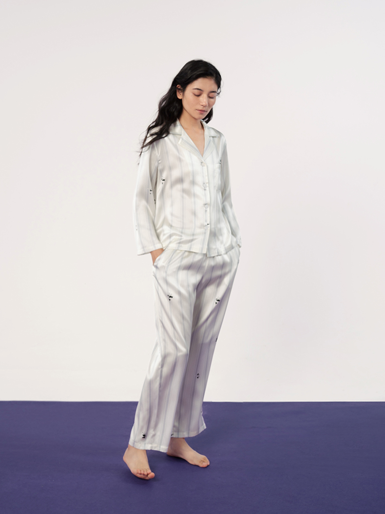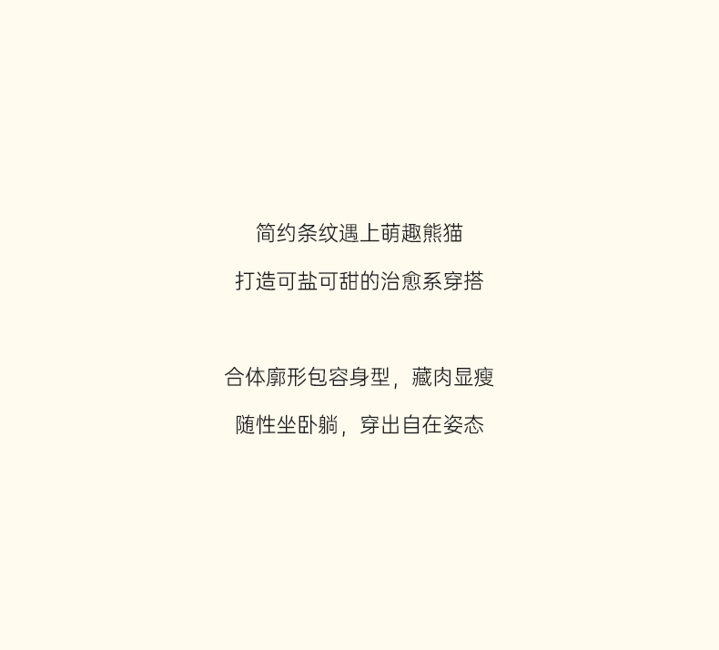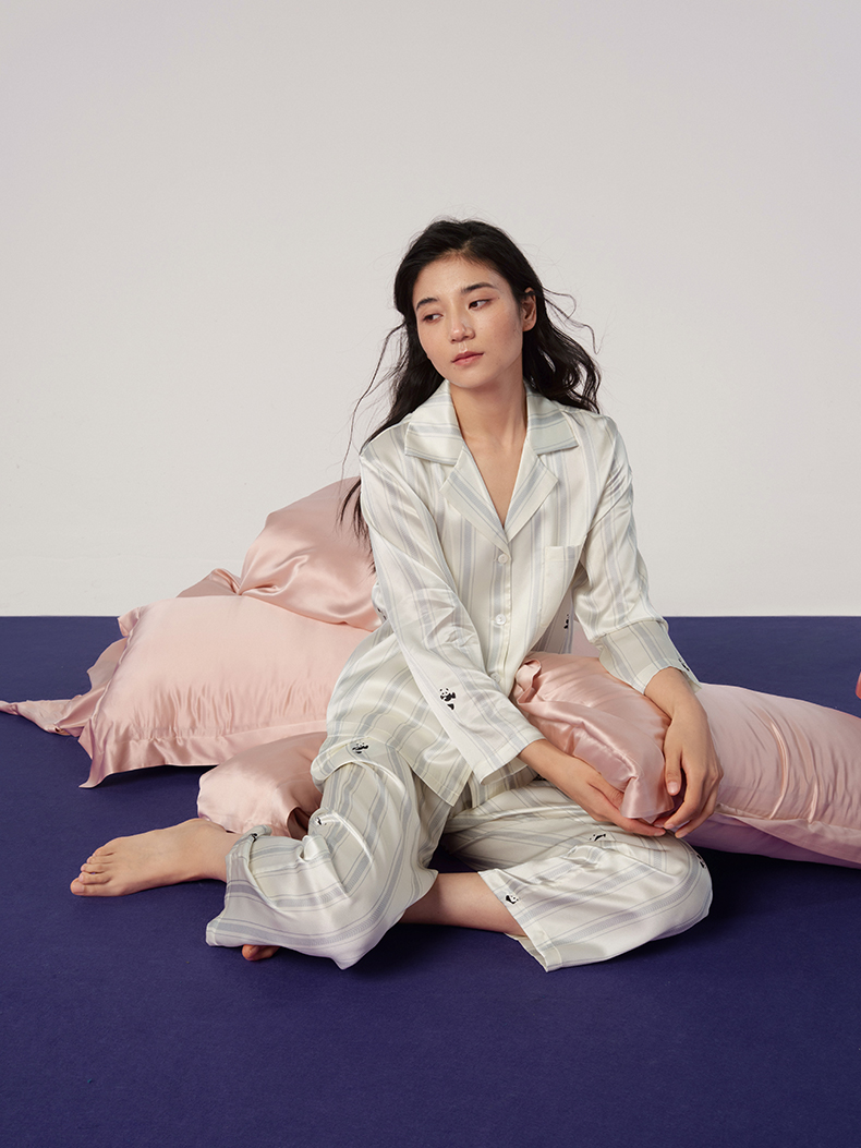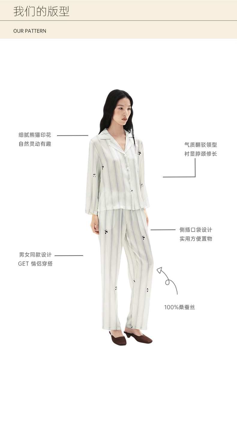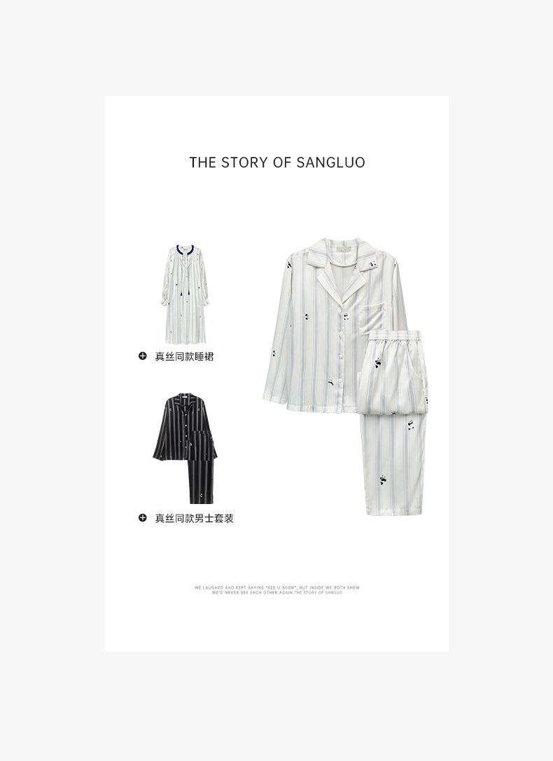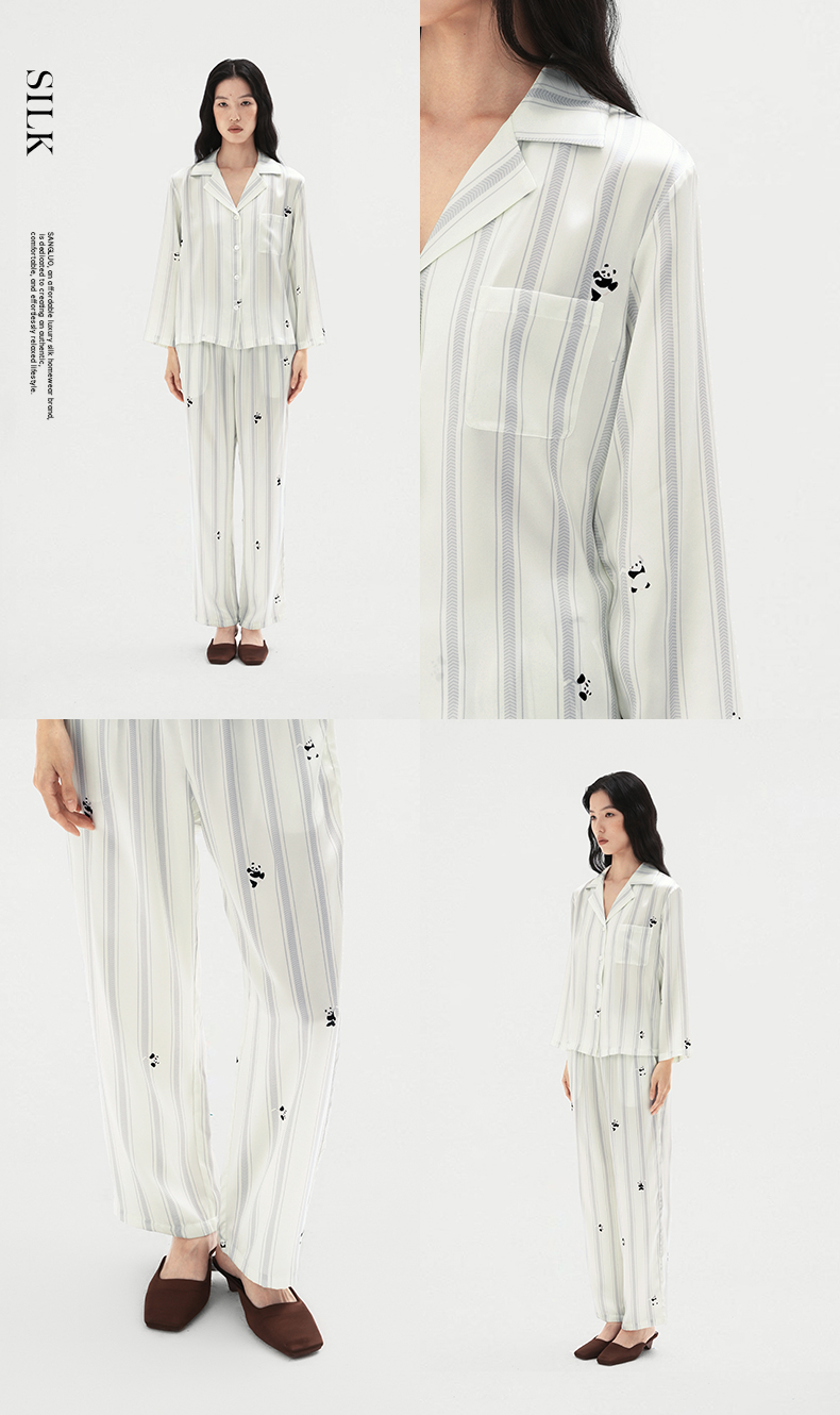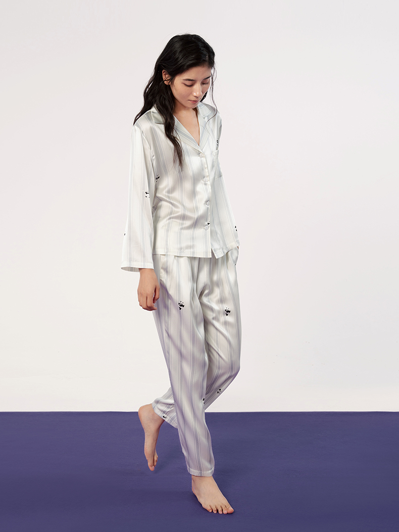 桑罗熊猫条纹印花女款睡衣套装亲肤透气长袖长裤情侣同款居家服