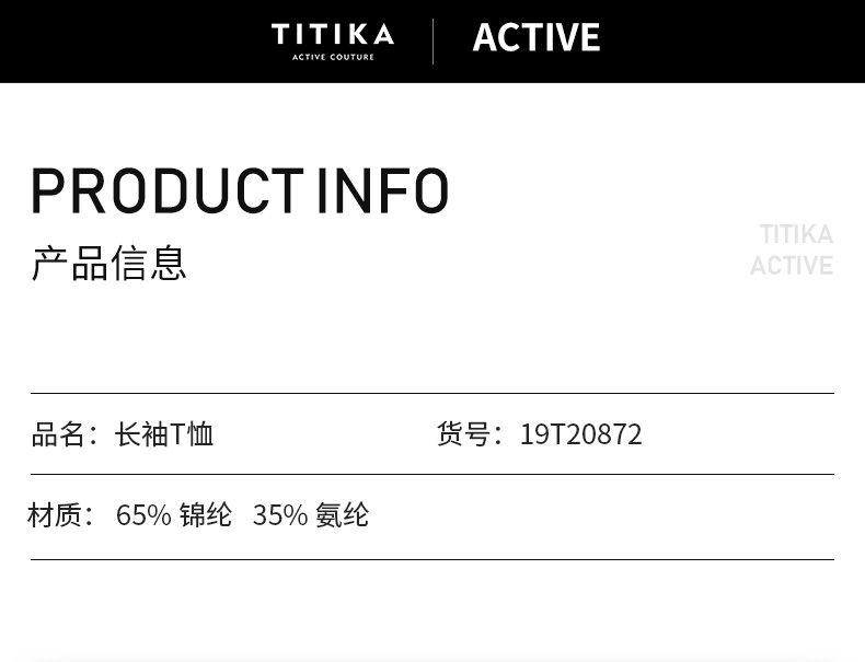 - 2009年,Titika Active Couture诞生于北美时尚之都,重新定义运动服饰,让运动时尚,前卫、性感,更宣扬一种无畏自由的生活态度。TITIKA缇缇卡不断求变,为品牌添加多种元素