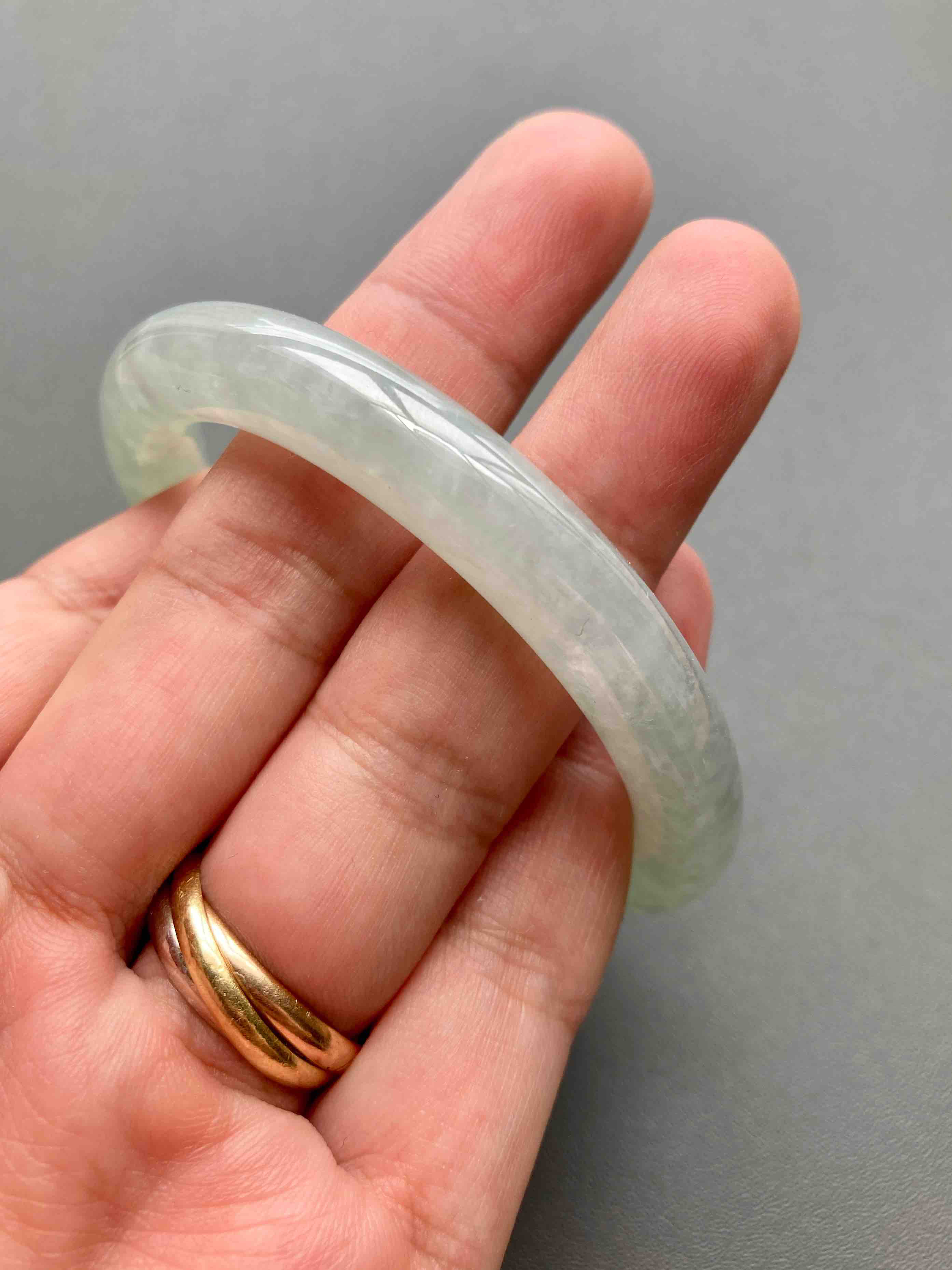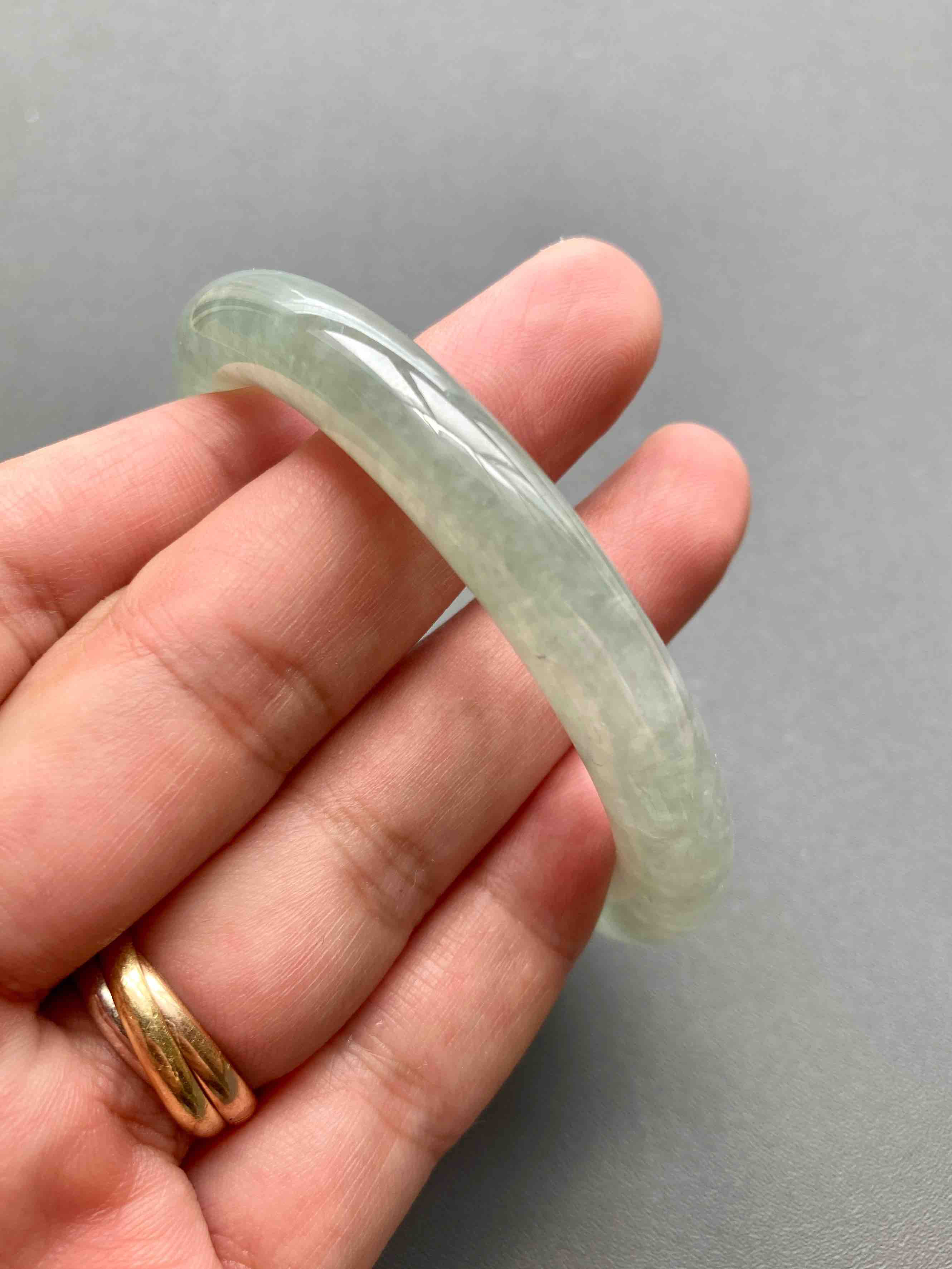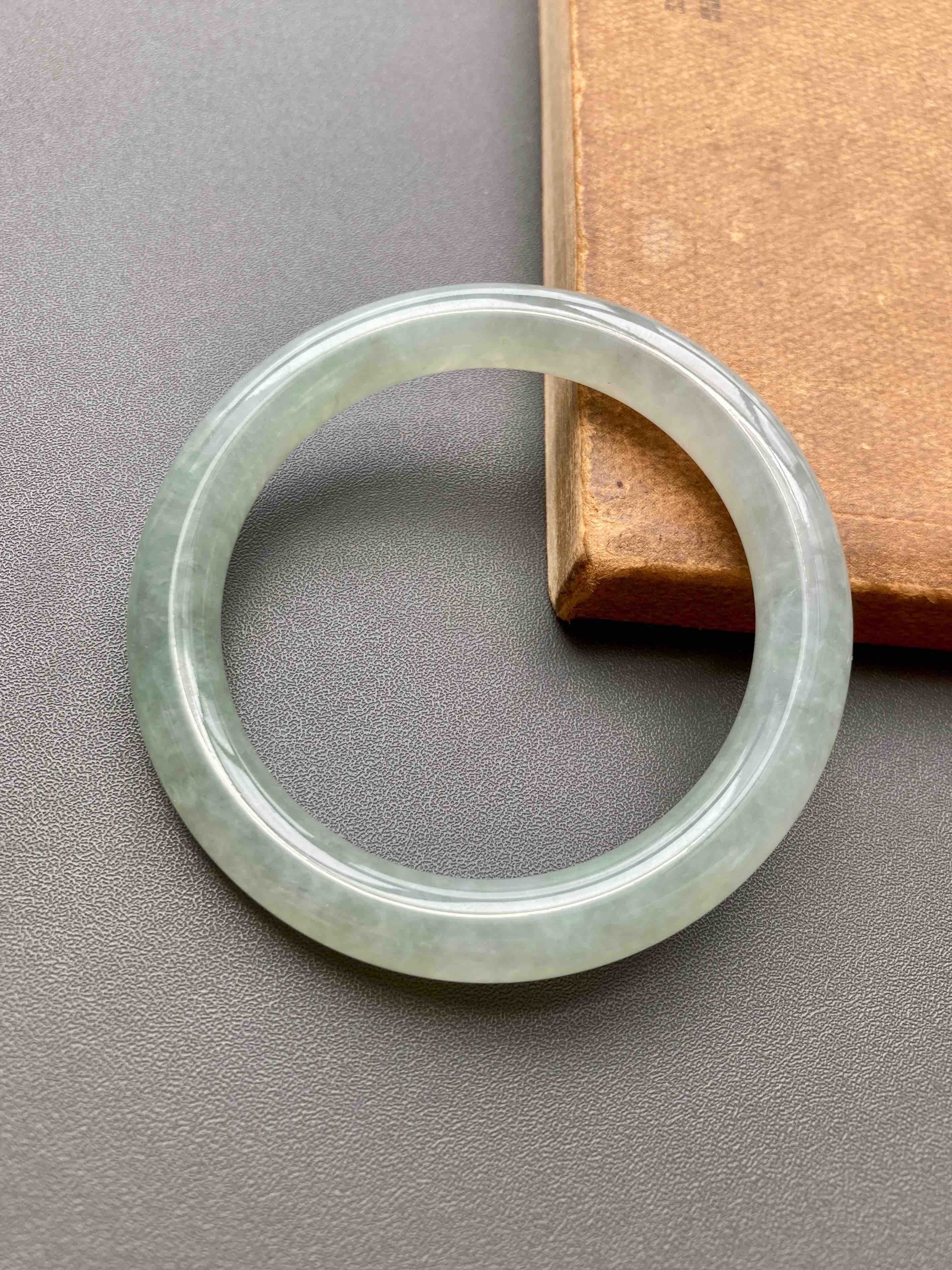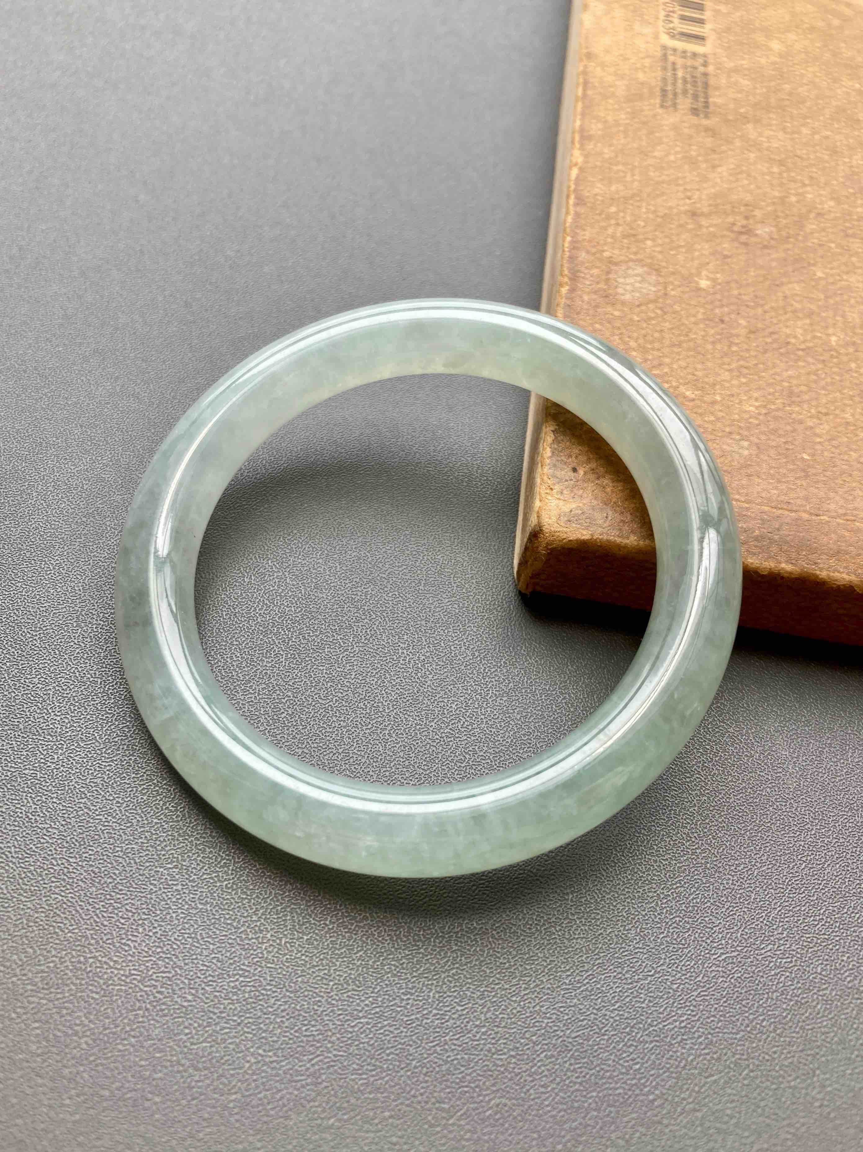 超划算的冰种淡晴水翡翠圆条手镯,种水棒极了,到冰,种水晶莹剔透,淡淡底色,细条优雅,小手有福,内径52mm,适合手寸51到53佩戴,这价位冰种收入囊中,拼手速