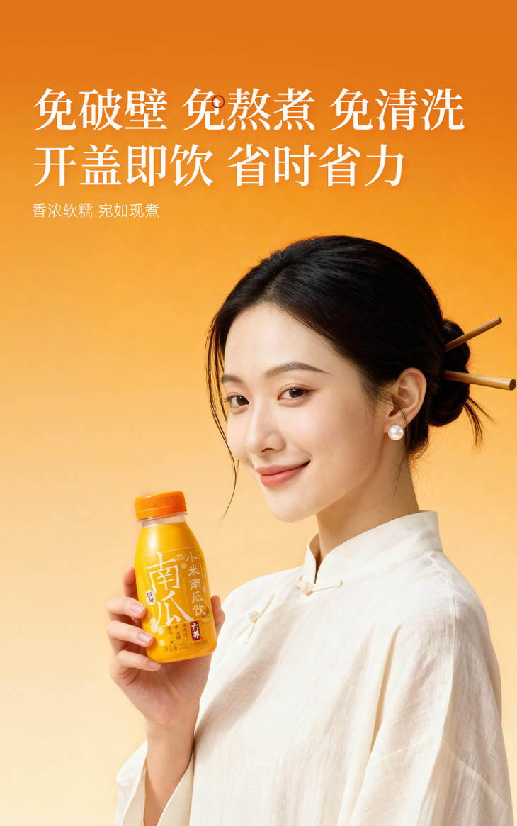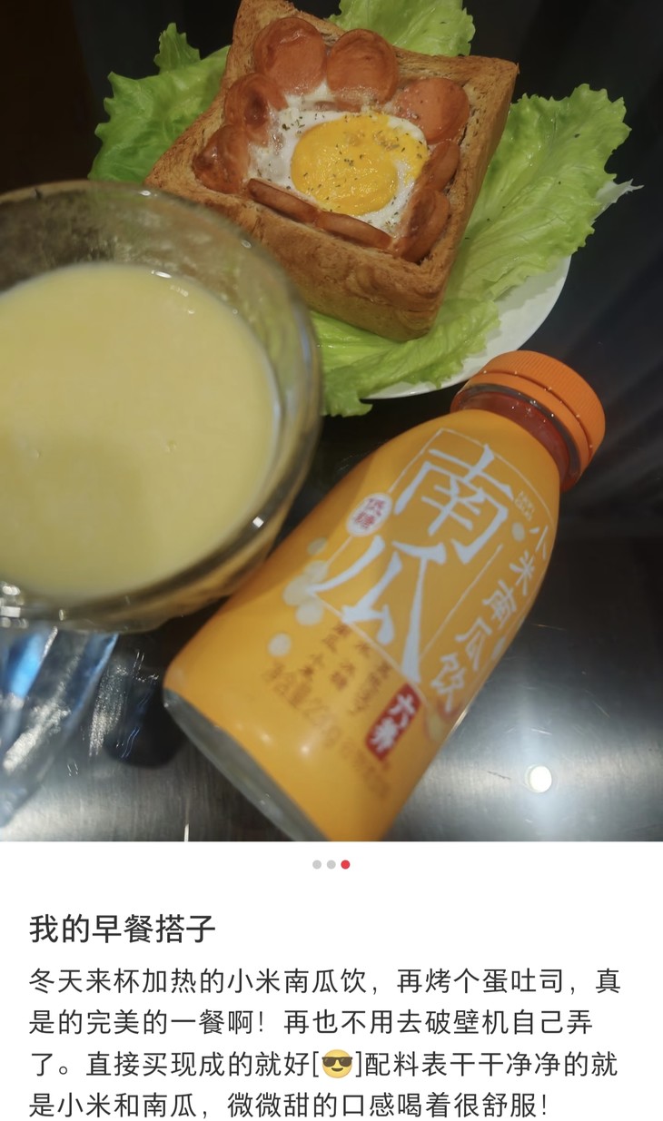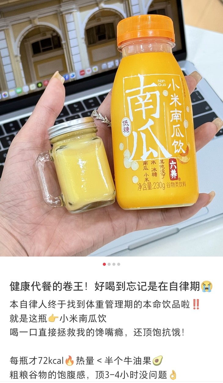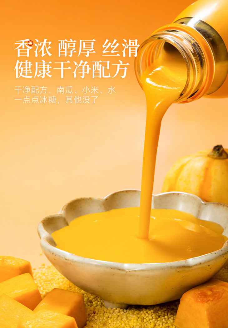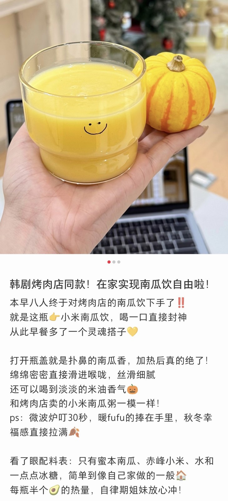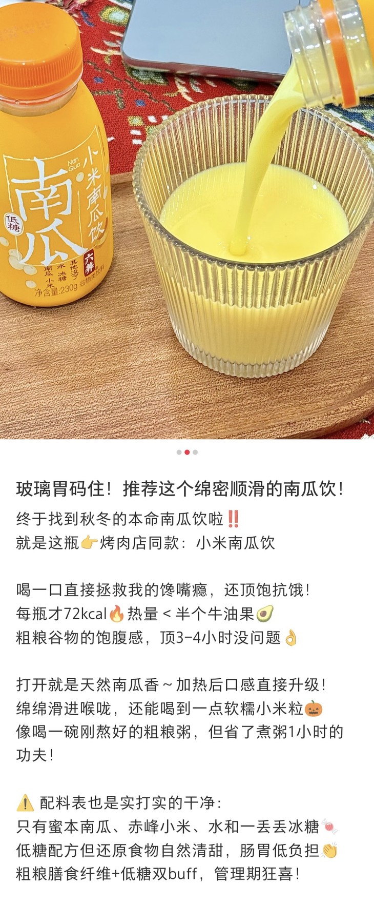 230ml的小瓶装特别便携,随便扔进包里,随时随地都能喝。开盖的瞬间,南瓜的自然甜香就扑鼻而来,入口细腻顺滑,要是加热再喝,口感更是直接封神!绵滑得像刚熬好的粗粮饮,顺着喉咙往下咽,暖乎乎的触感瞬间驱散秋冬的凉意,米油香气混着南瓜的清甜,超治愈哦!关键是它很低卡,但又饱腹,每瓶才72大卡,减脂期也能放心喝!喜欢搞点花样的,加奶、炖蛋、下汤圆,或是加芋圆珍珠都是美貌又好吃!