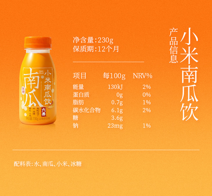 南瓜小米饮之所以好喝,关键就在于实打实的好食材:来自烟台的蜜本南瓜,自带粉糯板栗口感;赤峰的金黄小米,透着纯粹的醇香,两者搭配出的味道纯粹又治愈。黄小米本就是入脾、胃、肾经的佳品,富含蛋白质、脂肪和多种维生素,滋阴养血、和胃安眠的功效拉满;南瓜性温味甘、入脾胃经、补中益气,对脾虚气弱、营养不良的人特别友好。更难得的是配料表格外纯粹:只有水、南瓜、富硒小米和少量冰糖,0添加剂、0防腐剂、0香精,每一口喝到的都是食材本身的原汁原味。
