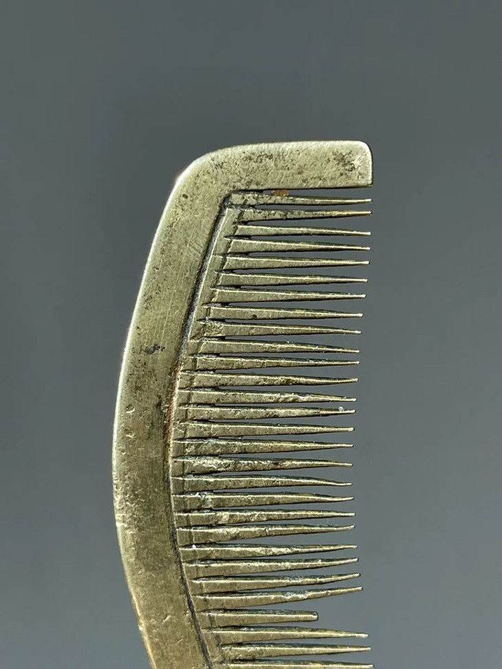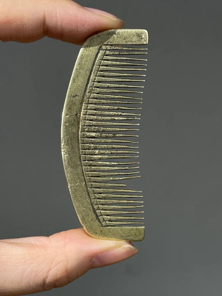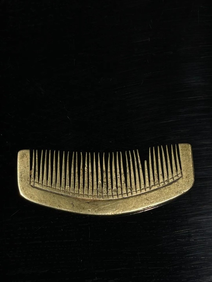 这是一件以精炼青铜制作而成的拱桥梳子形发簪,质地坚硬色泽金黄的青铜,造型优美别致,制作严谨细致,多年使用保持青铜金黄本色,尺寸不大,梳齿间距紧密,是发梳与发簪兼用的淑女梳妆用具。