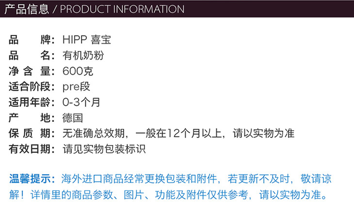 【保税仓】德国喜宝有机奶粉pre段600g(新包装)