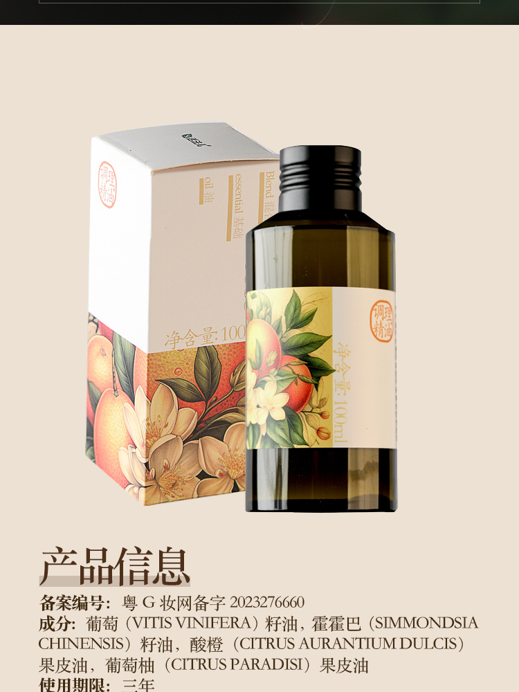 橙香调理精油100ml | 推腹部腿部背部气味芬芳。蕴含4重植萃精华。呵护肌肤水润细腻按摩复方精油蕴含多重植萃精华呵护肌肤使肌肤水润细腻葡萄籽霍霍巴籽酸橙葡萄柚果皮油替代佛手柑精油