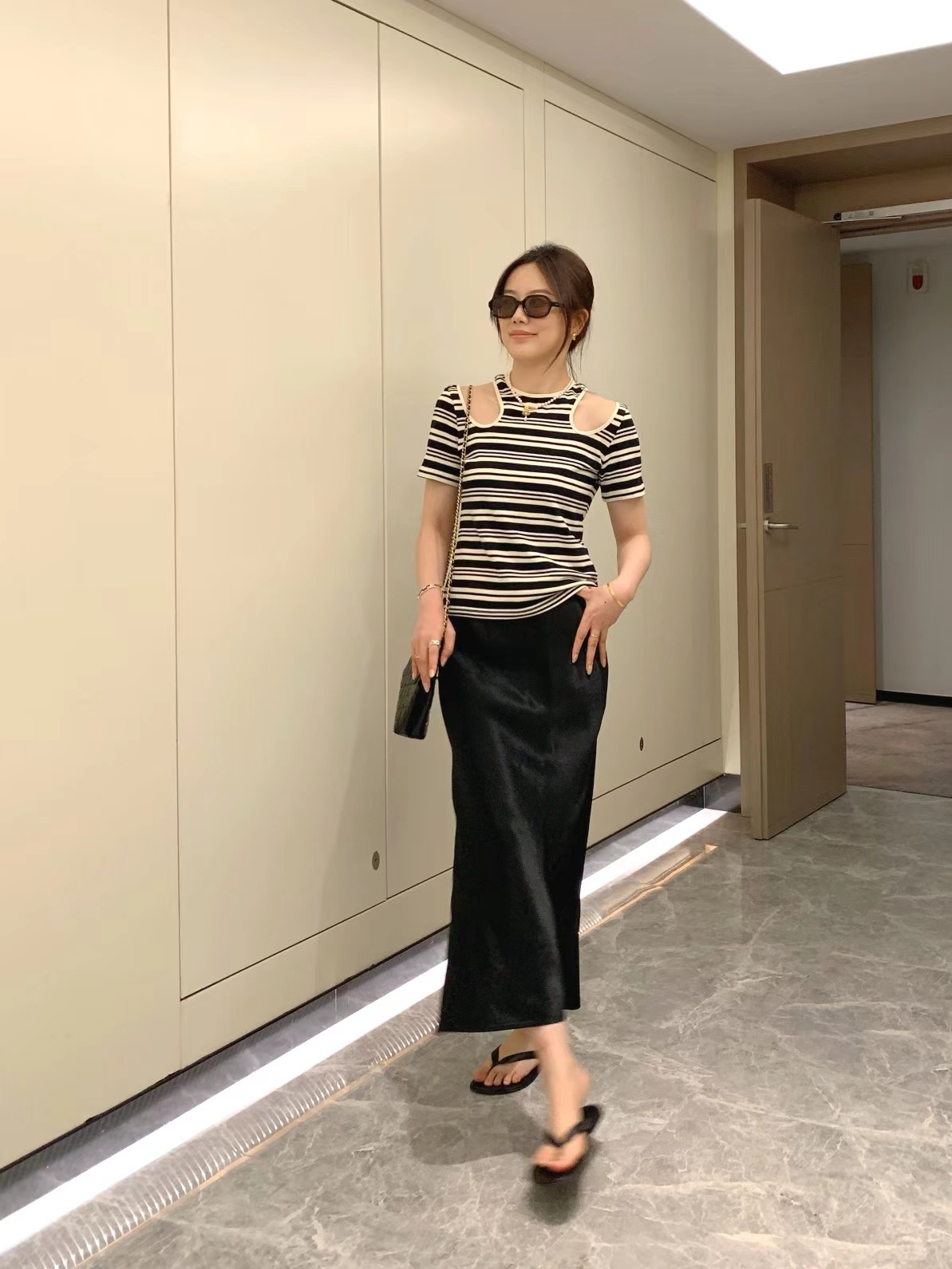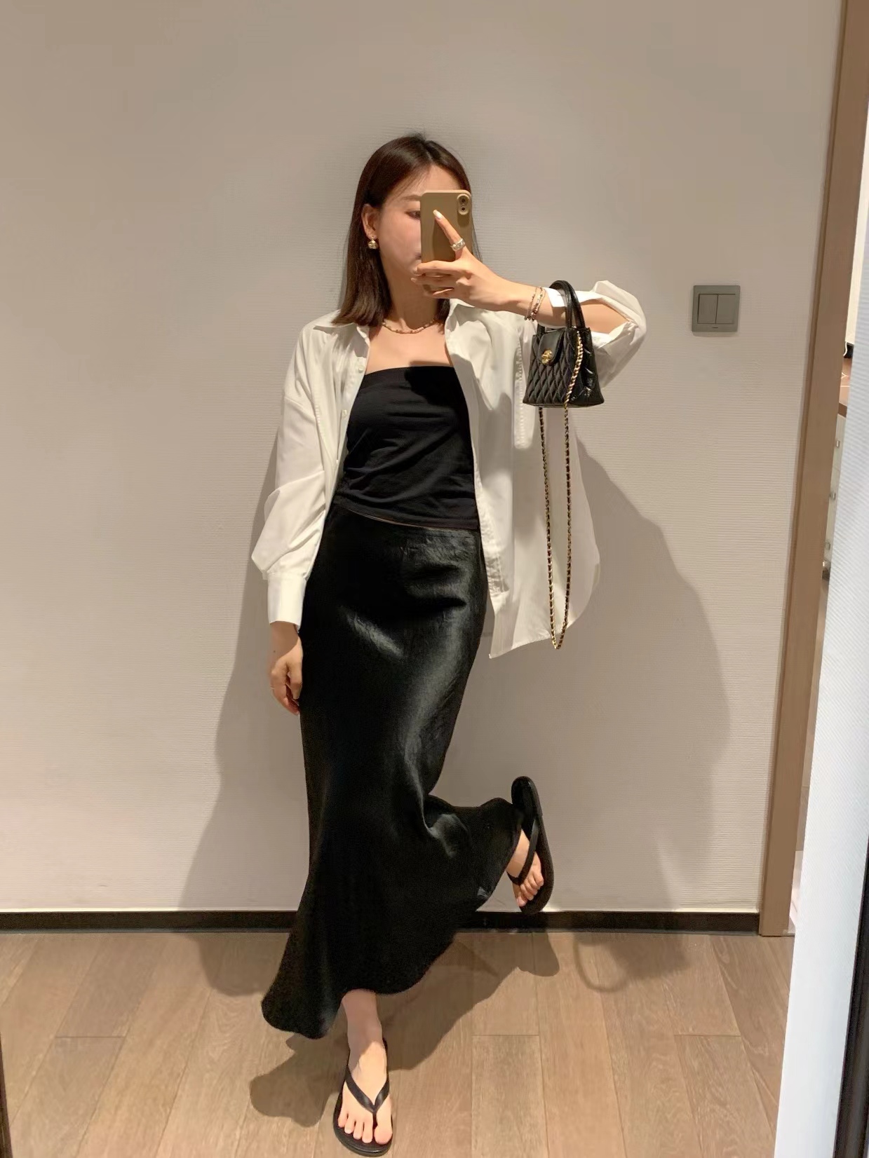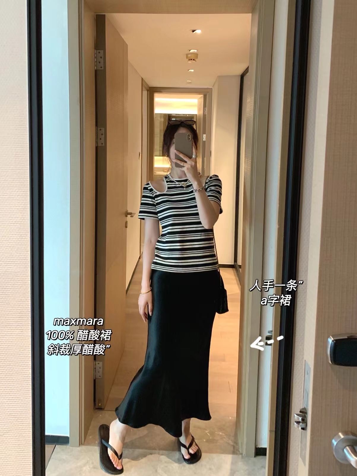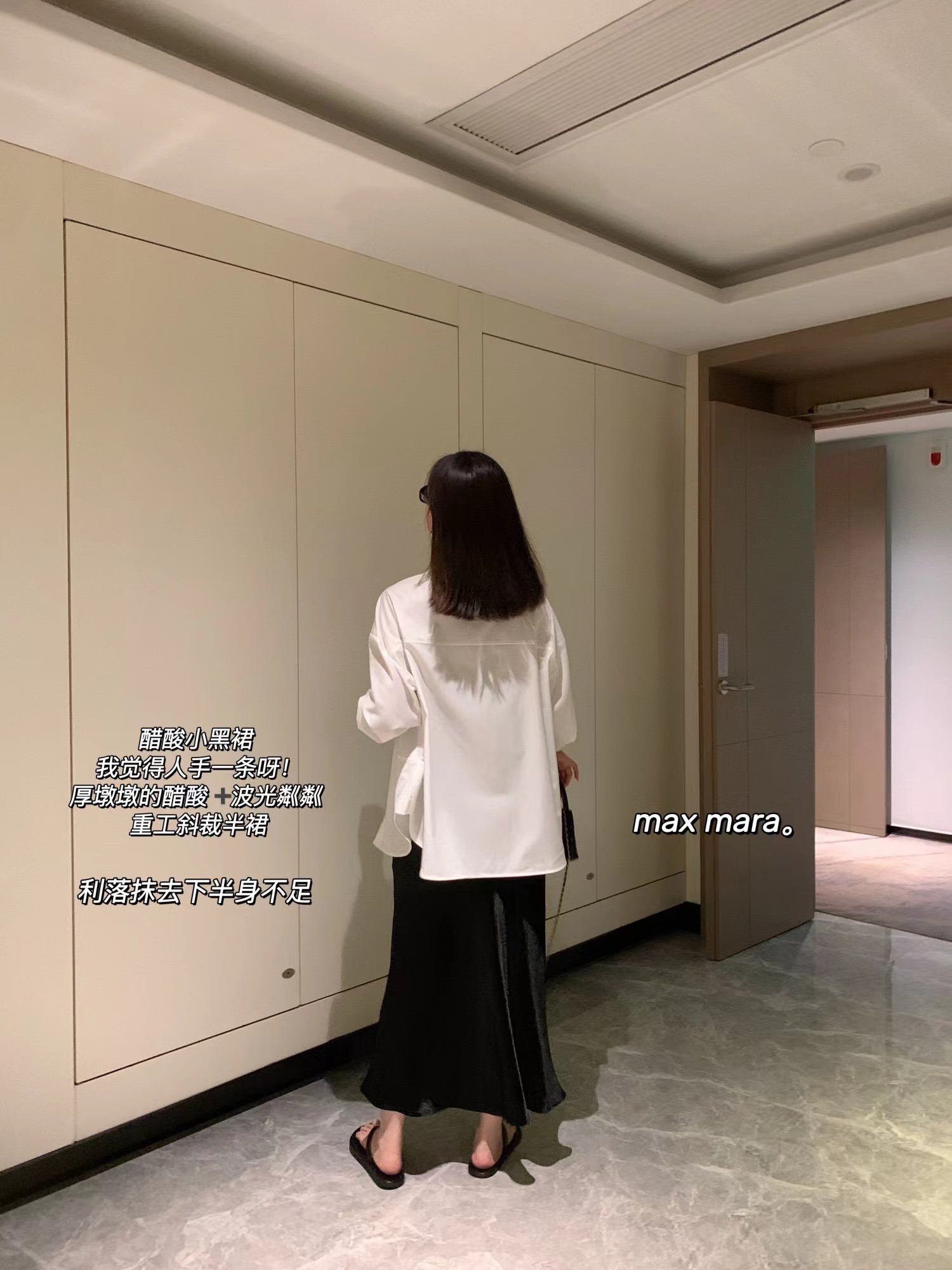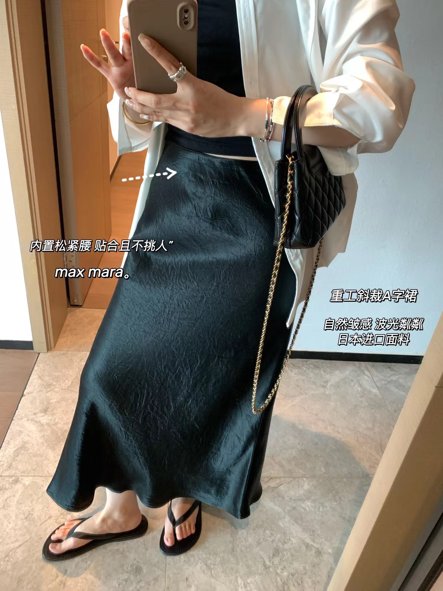属于a字版型,带一点鱼尾的感觉,max的版型包容性都很好,不会贴腿,裙身采用斜裁,行走工作都没问题,有点肉肉小肚子啥的都不用担心。