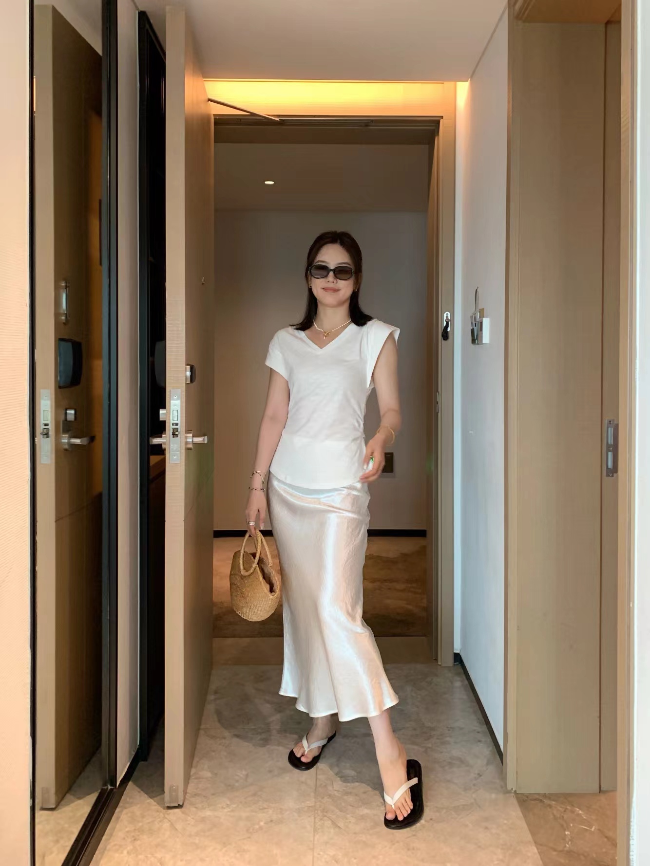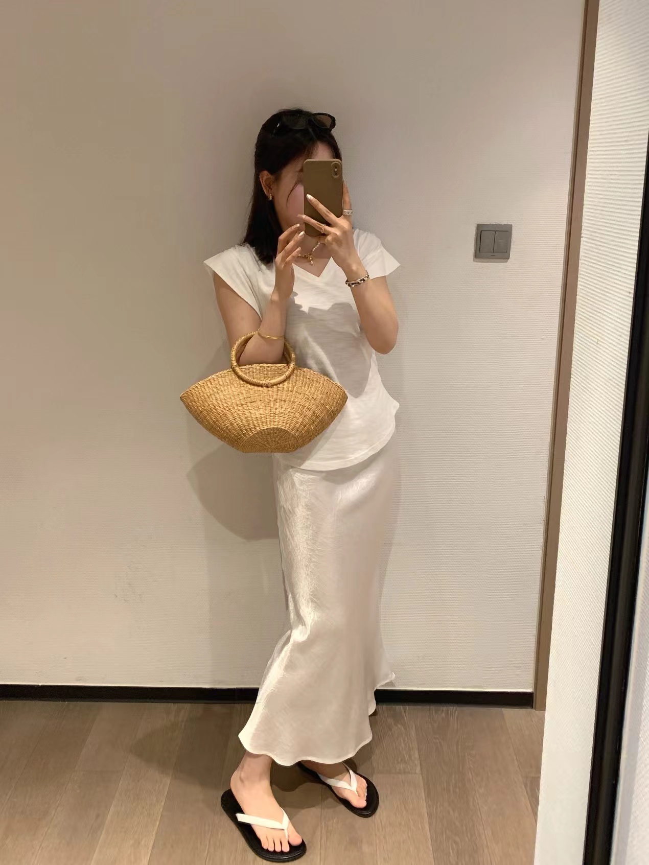 这个颜色更适合夏天搭配纯白或者彩色,有很多博主搭配彩色开衫,减龄又特别。
