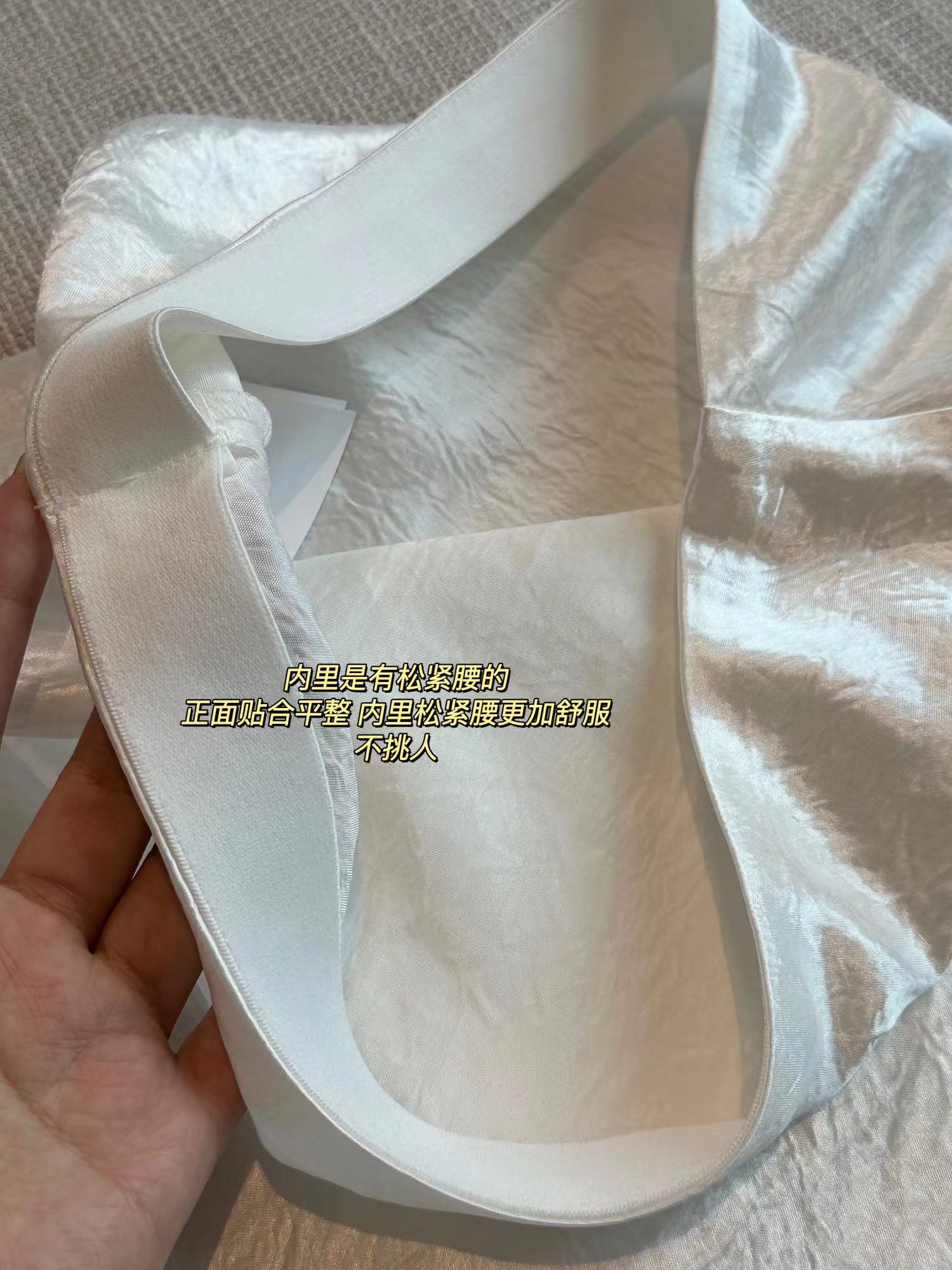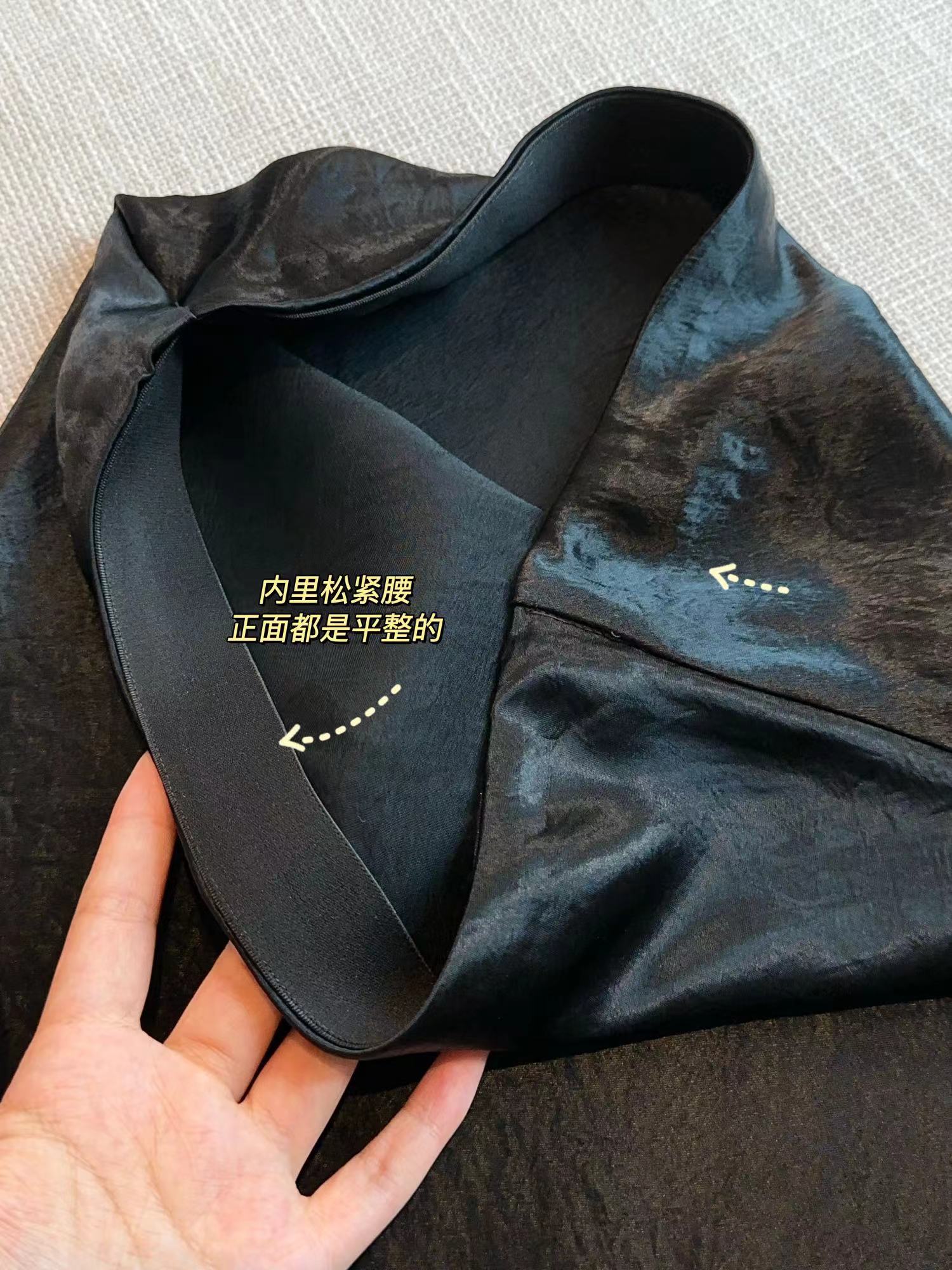 腰身内部松紧带,外面看不到任何痕迹,平整得很,弹力舒适。