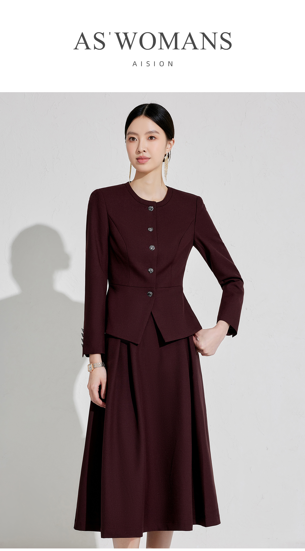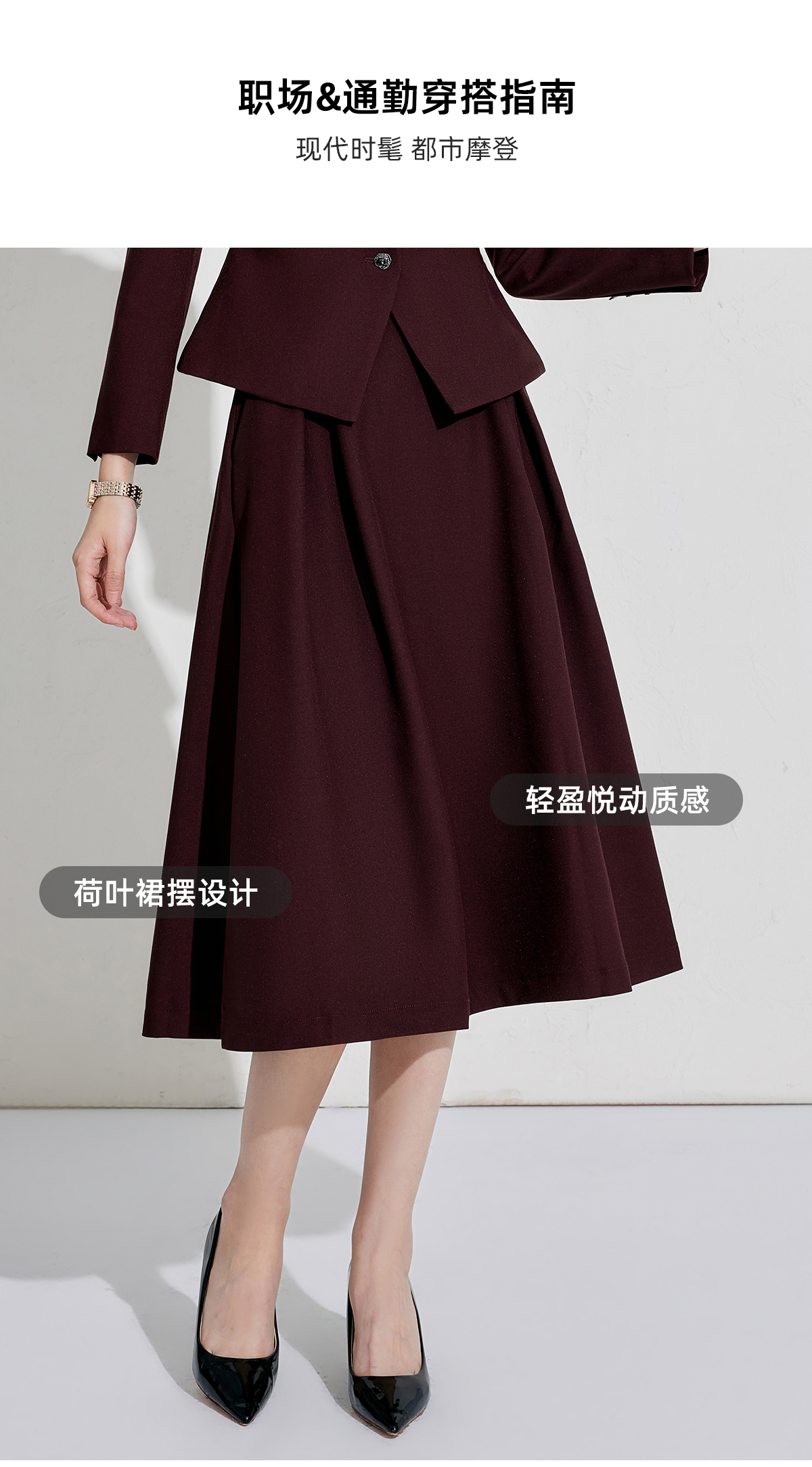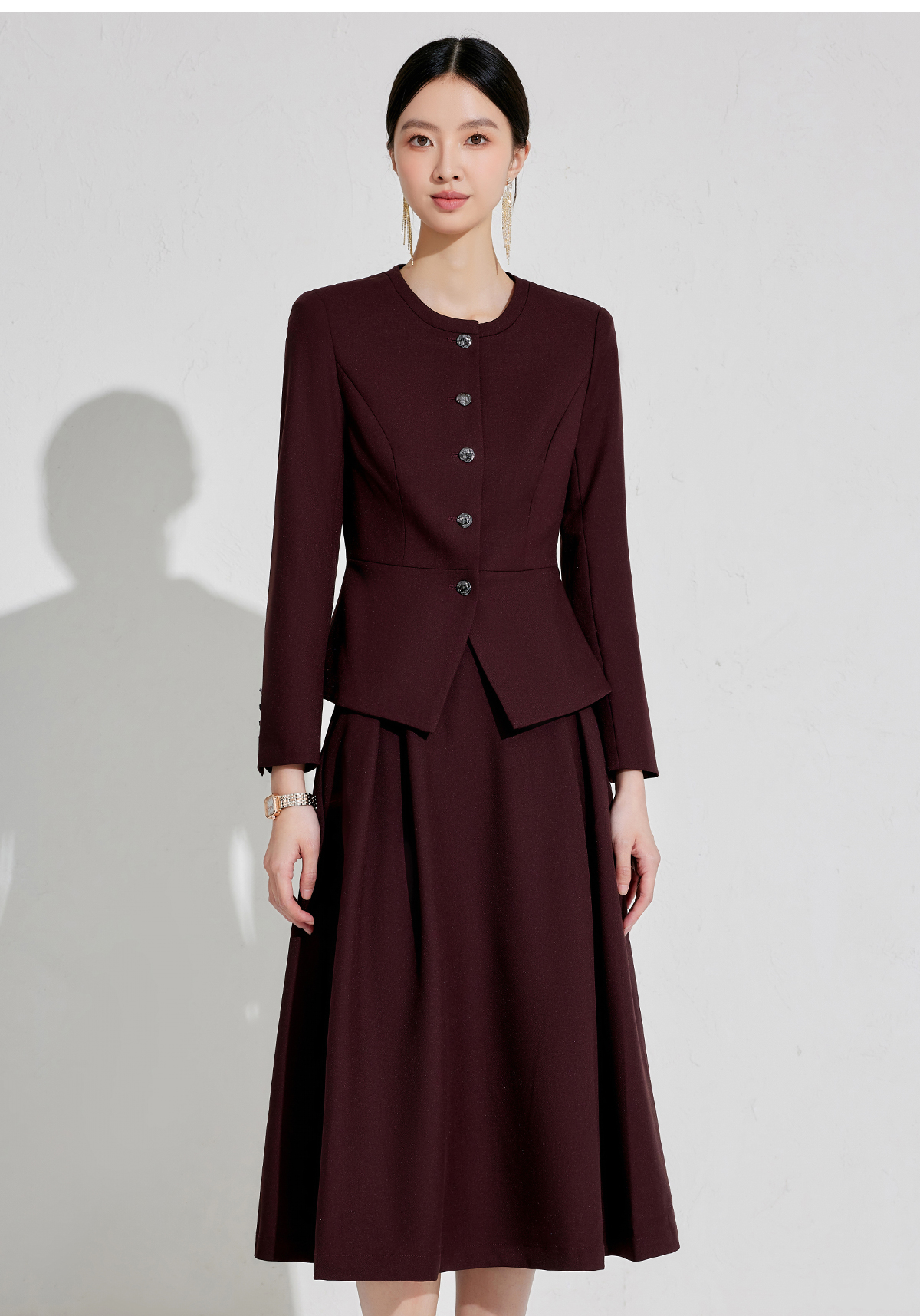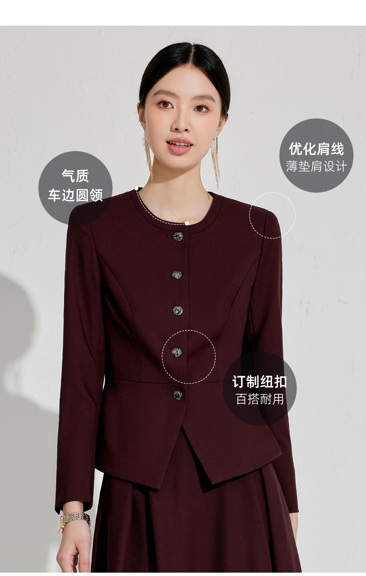 出席酒红色职业装小香风行政穿搭