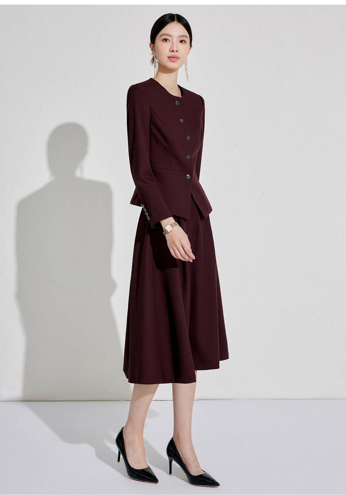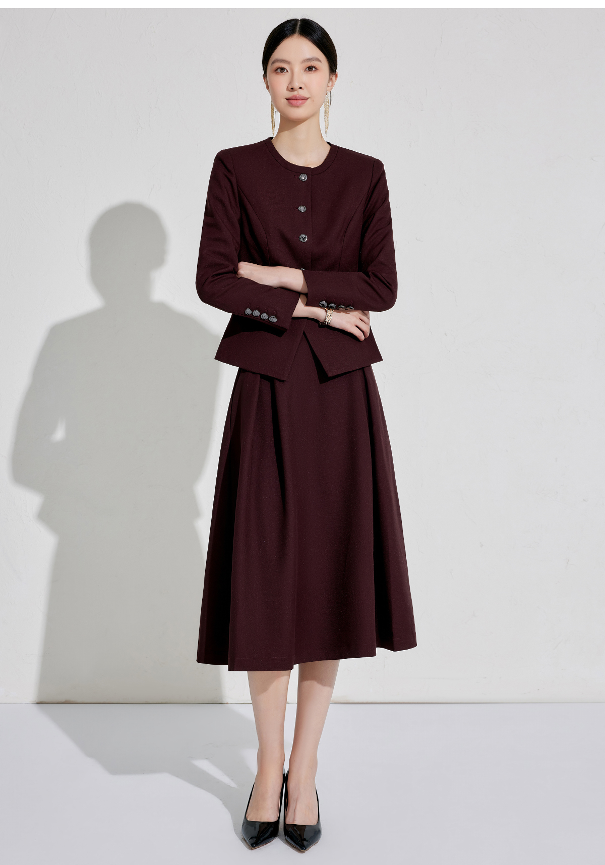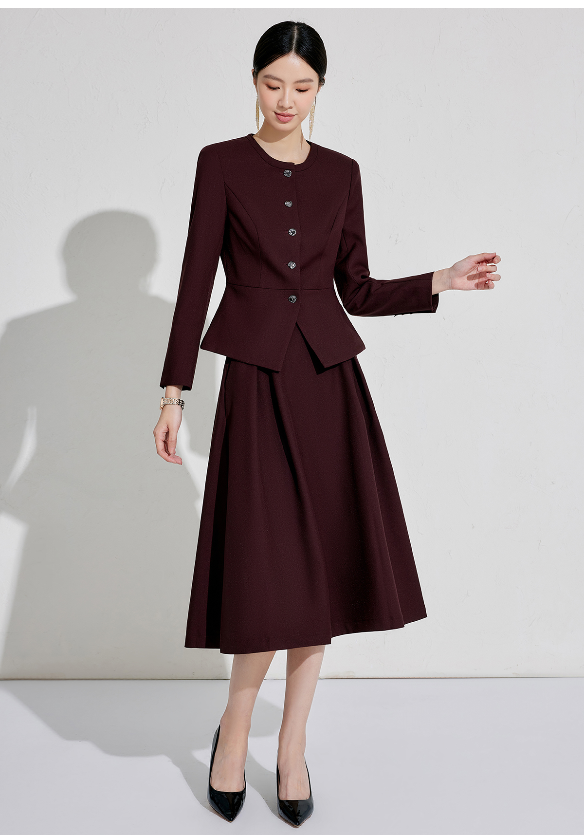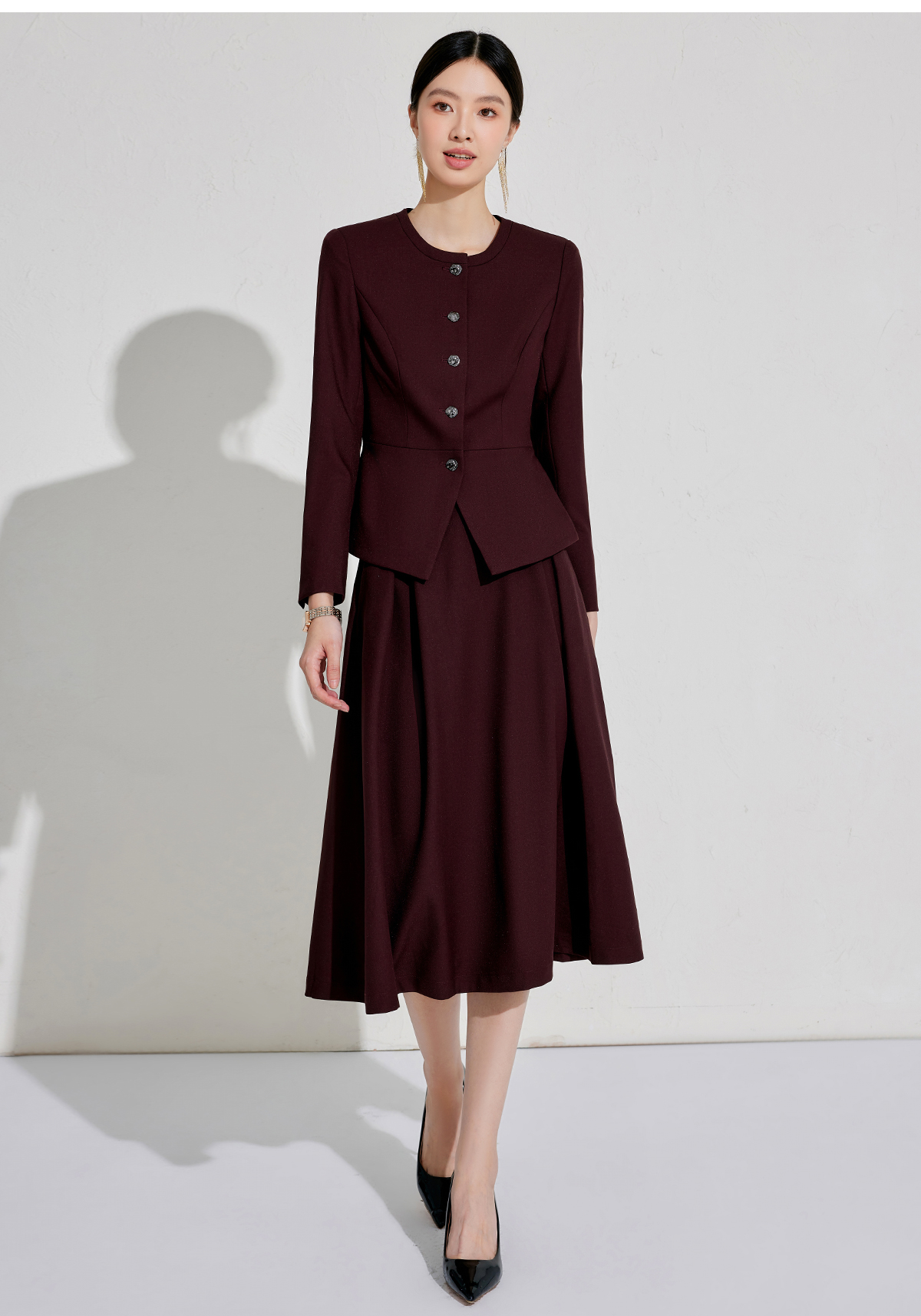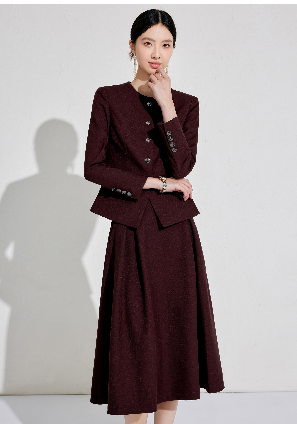 出席酒红色职业装小香风行政穿搭
